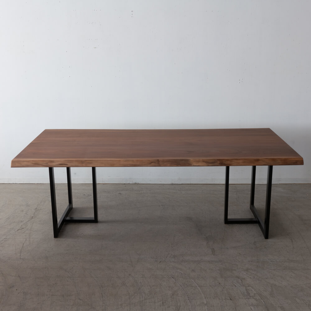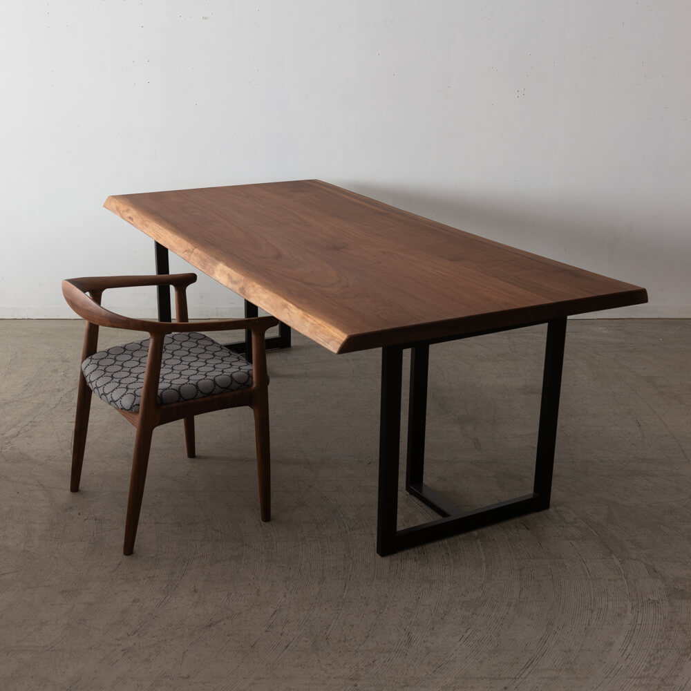 ブラックウォールナットの深い色味と、耳付きのやわらかなライン。3枚剥ぎ天板の落ち着いた表情に加え、裏面にはしっかりと反止め(反り止め)が設けられ、長く安定して使える設計になっています。スチール脚のシャープさが空間を整えます。