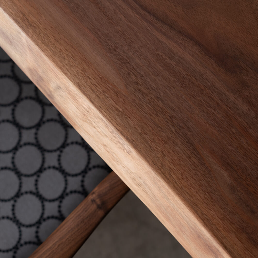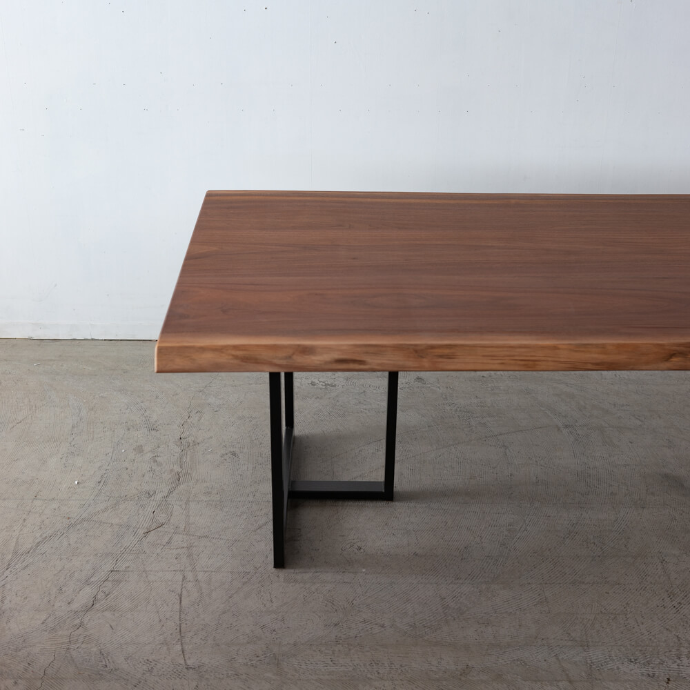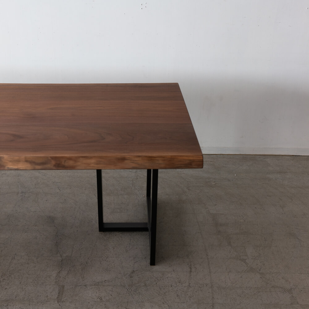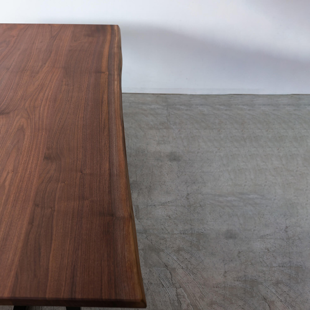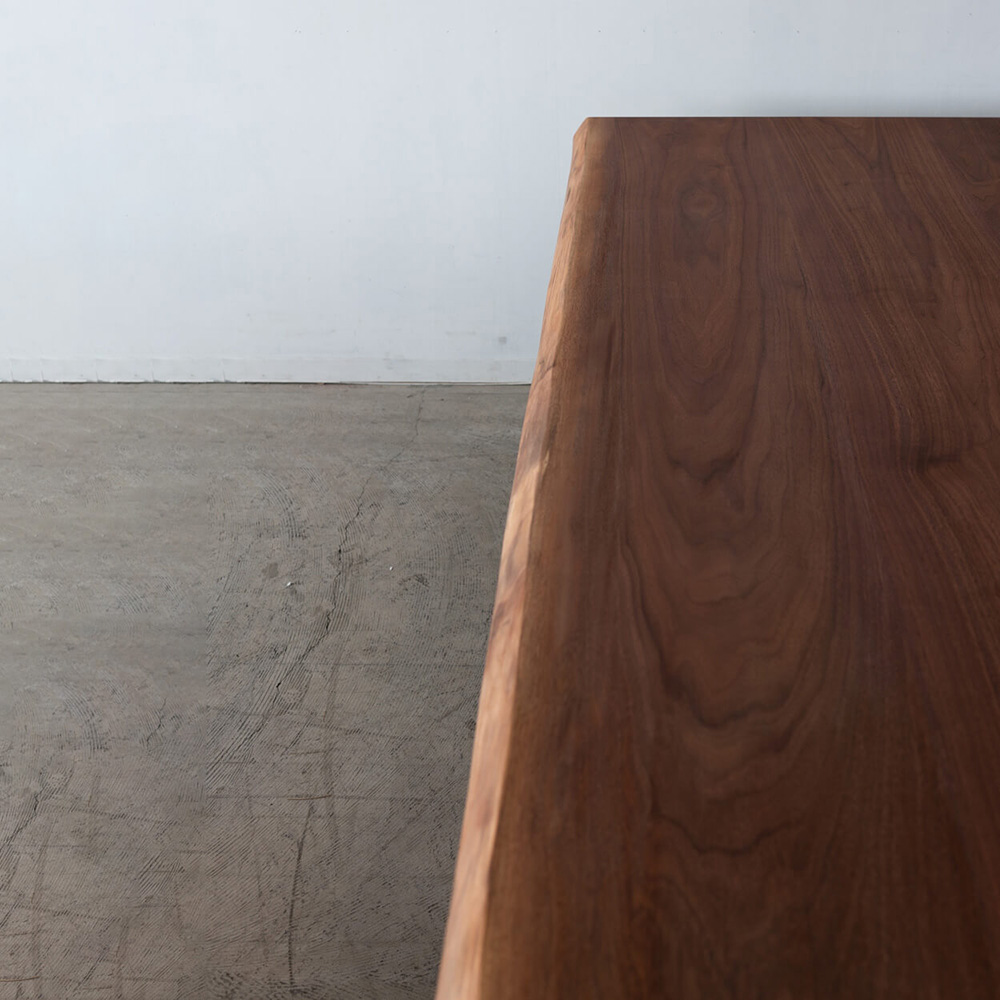 無垢材を3枚で構成し、木目に変化を持たせながらも、落ち着きのある整った表情に。42mmの厚みが生む存在感と、無垢ならではの心地よい触感。年月とともに深まっていくウォールナットの色合いも魅力です。