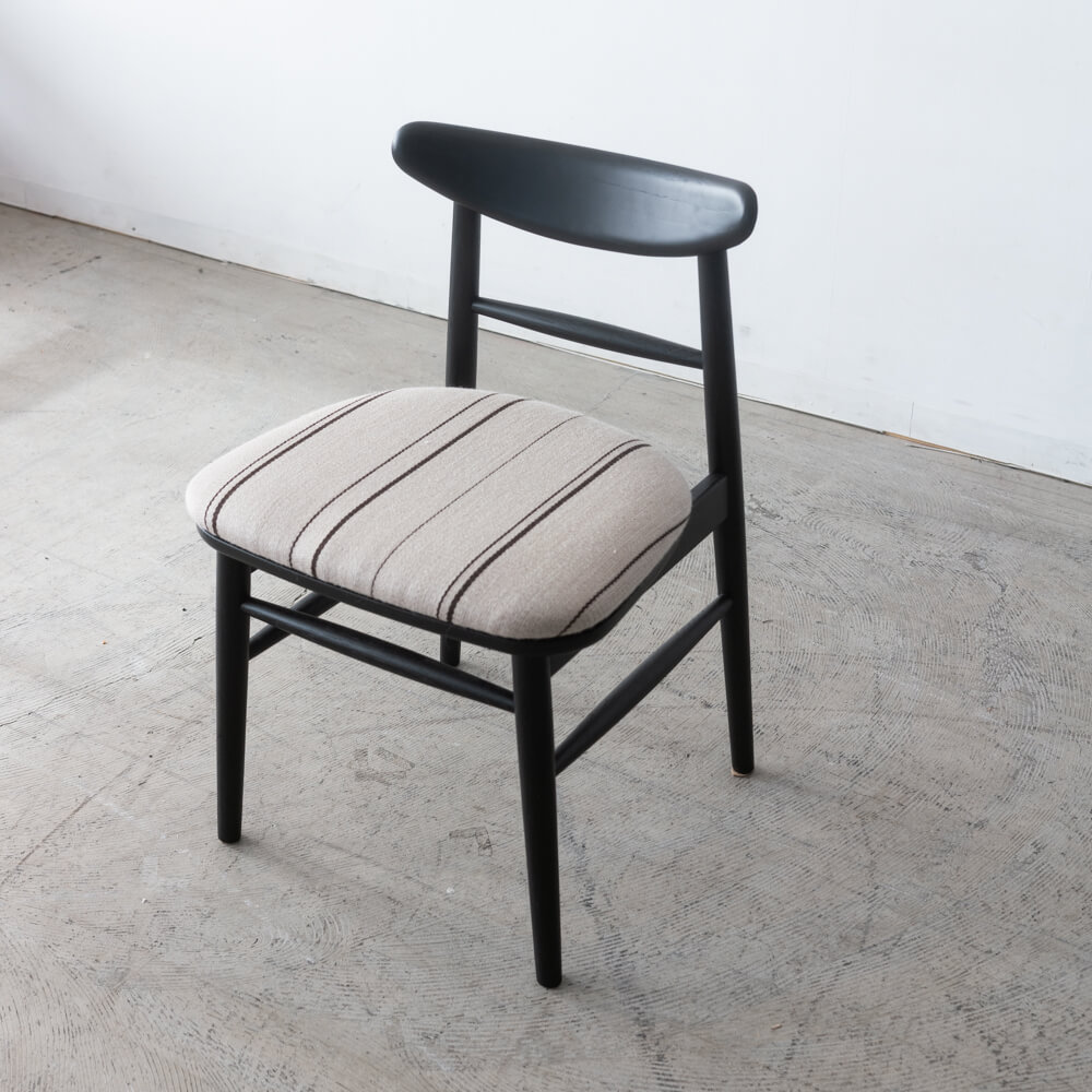cocochiオリジナルチェア emi chair(エミ チェア) に、デンマークのテキスタイルメーカーKjellerup Væveri(ケアロップヴァヴェリ) の張地を合わせた特別仕様。ブラック着色のホワイトオークフレームに、ベージュ系のストライプファブリックを組み合わせることで、空間を引き締めながらも、軽やかで穏やかな印象に仕上げました。ダイニングチェアとしてはもちろん、ワークスペースや来客用の椅子としても、暮らしの中に自然に溶け込む佇まいです。