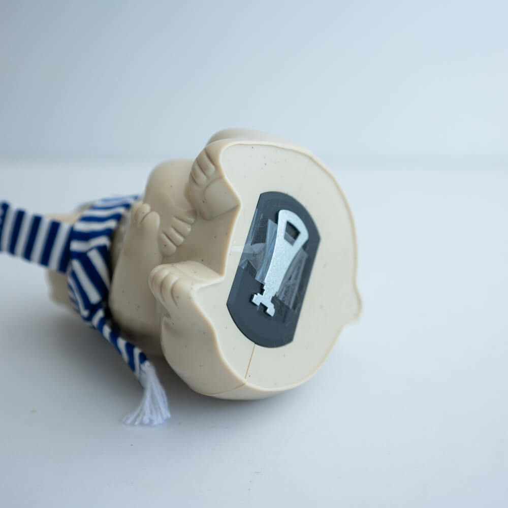 しろくま貯金箱には、鍵付きの取り出し口が付属されています。お金を取り出す際は、付属のC型の鍵を鍵穴に差し込み、90度回転させることで簡単に蓋を開けることができます。安全性と実用性を兼ね備えた設計です。