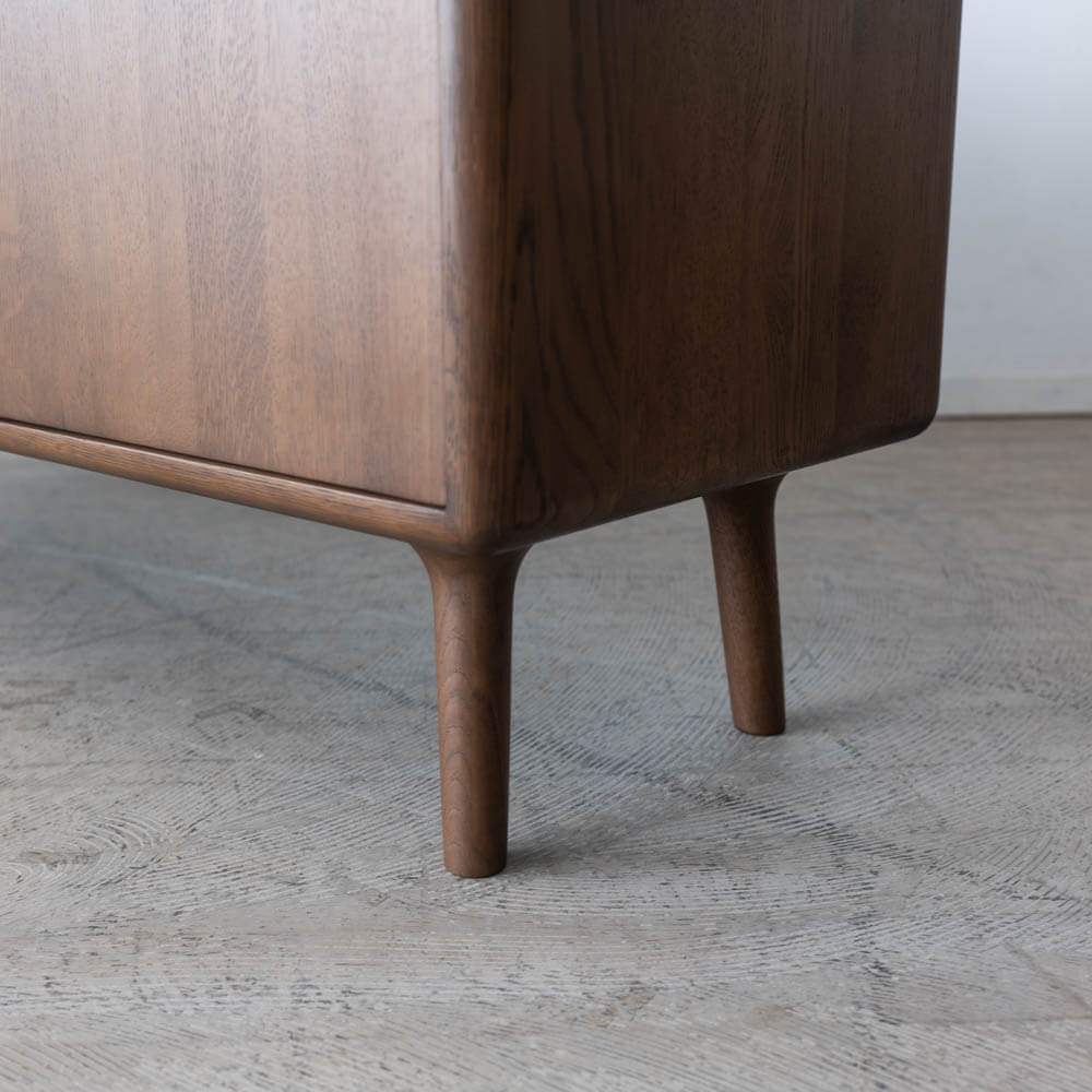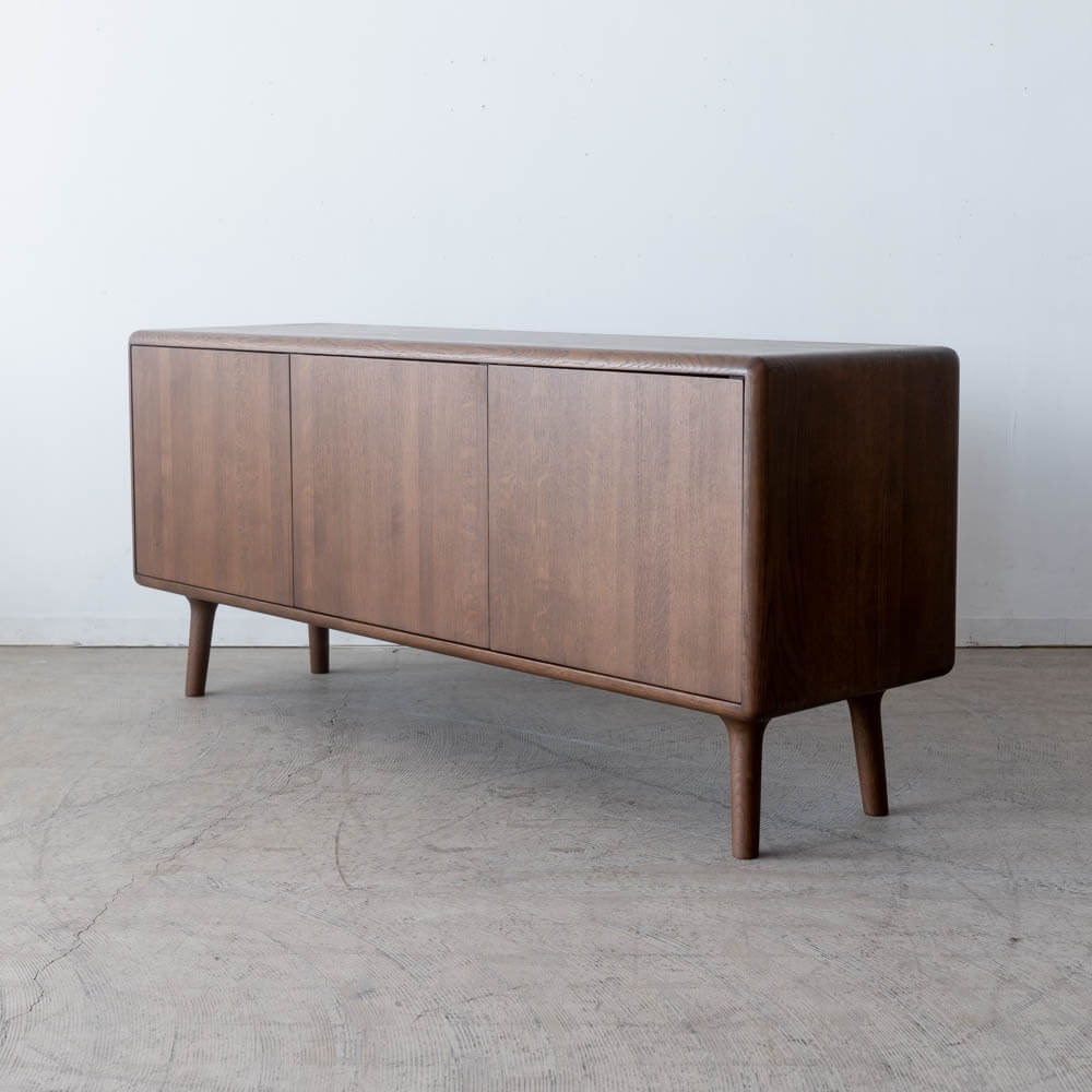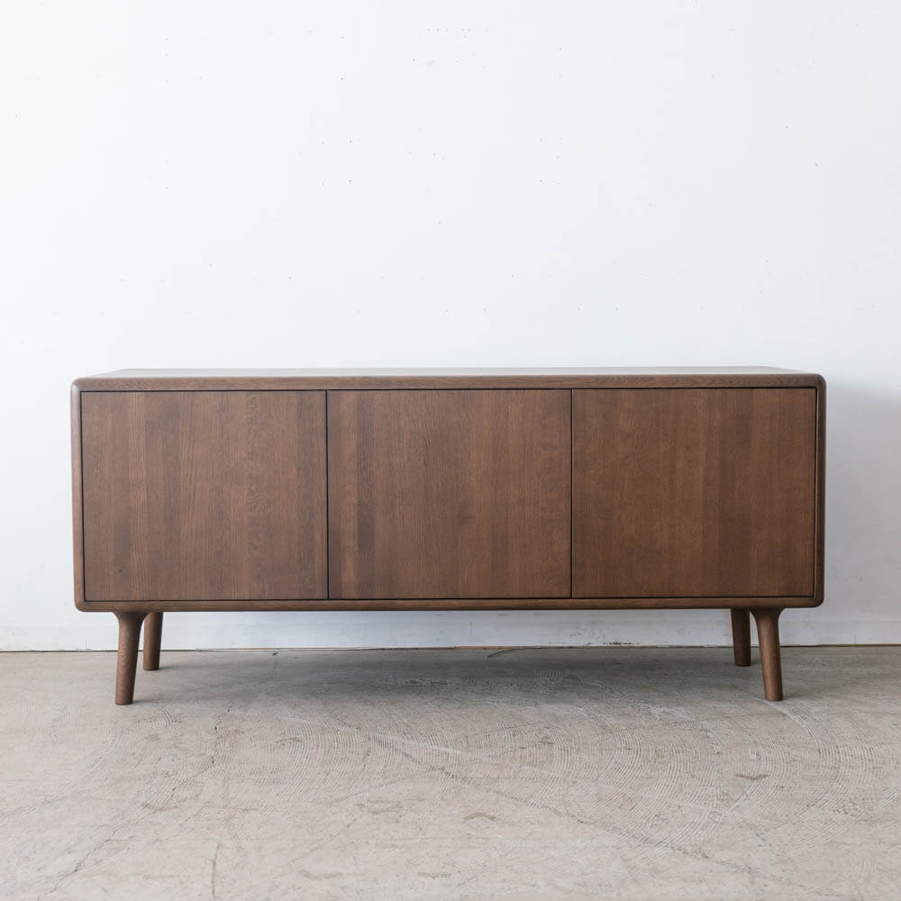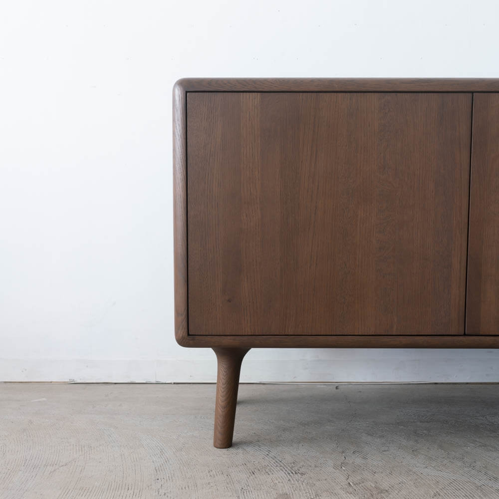 余計なものを足さず、素材と輪郭だけで美しさをつくる。BRIDGE サイドボードは、取手や金具をあえて見せず、ホワイトオーク無垢材の木目と、静かなフォルムを主役にした収納家具です。ダークブラウンのオイル仕上げが、木の表情に深みを与え、空間を落ち着いた印象へと導きます。北欧デザインの合理性と、日本の住まいに通じる簡素美が重なった一台です。