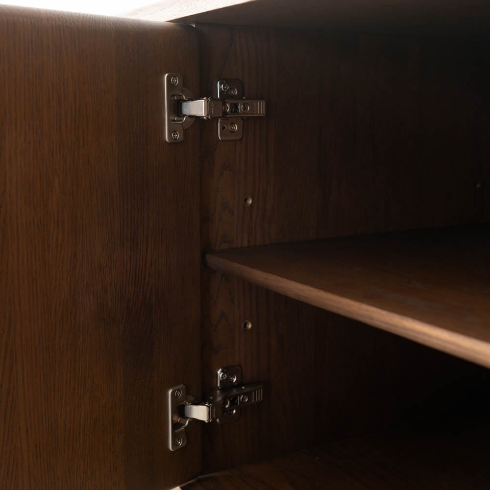 このサイドボードの最大の特徴は、取手や金具といった要素をすべて省いたフラットな正面。扉は軽く押すだけで開くプッシュ式を採用し、視線を遮る凹凸をなくすことで、壁面と自然につながる佇まいを実現しています。装飾を削ぎ落とした分、素材そのものの質感や、面の美しさが際立ち、収納家具でありながらインテリアの一部として成立します。