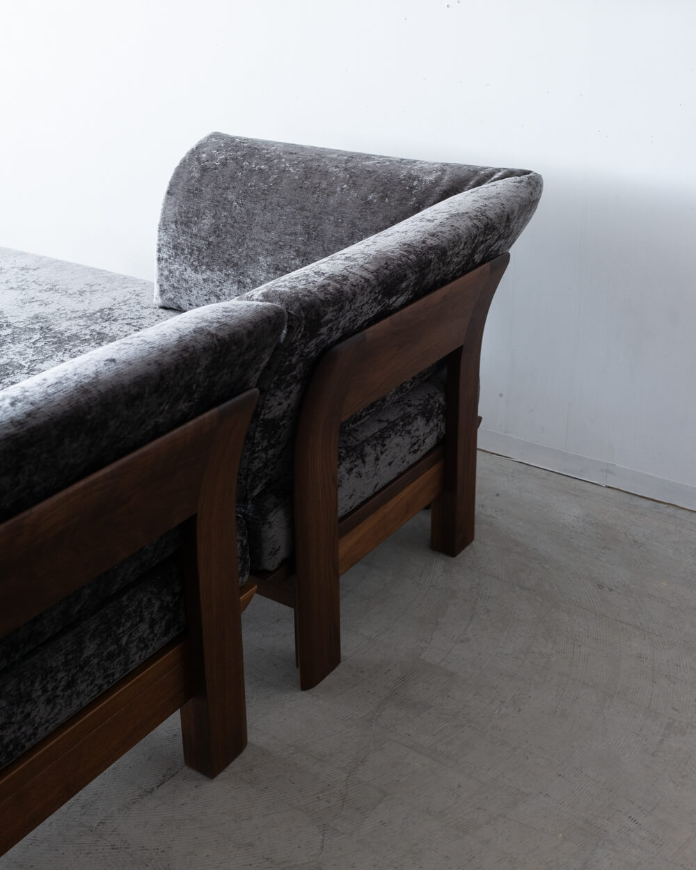 ウォールナット無垢材を使用したフレームが背中をしっかり支えます。座面には高強度ポリエステル織物を樹脂コーティングした耐久性の高いシートを採用し、しっかりとした座り心地をサポートします。クッションは継ぎ目のない1本仕立てで、どこに座っても均一な快適さを提供します。