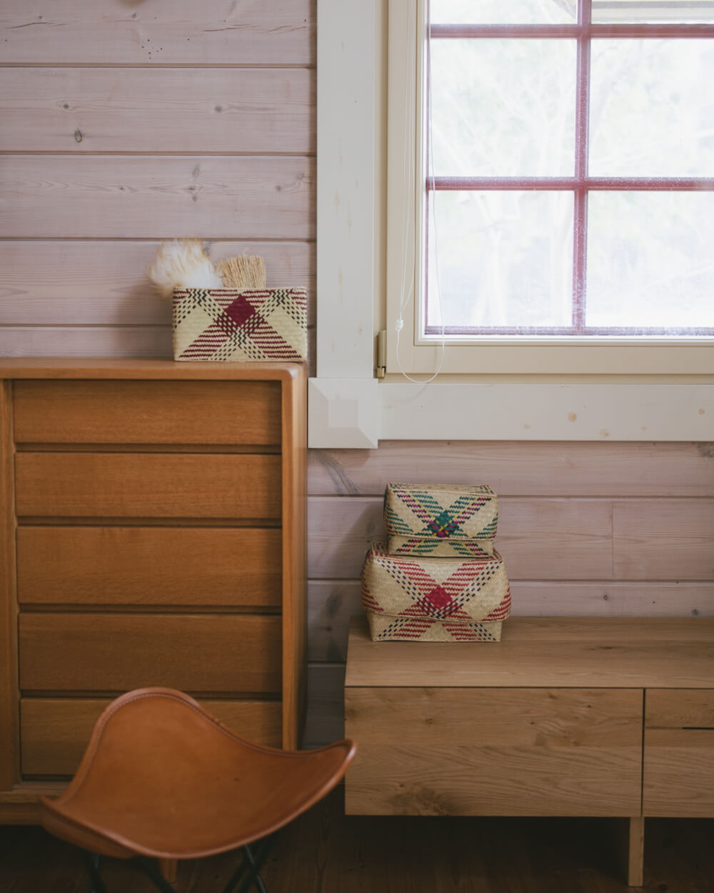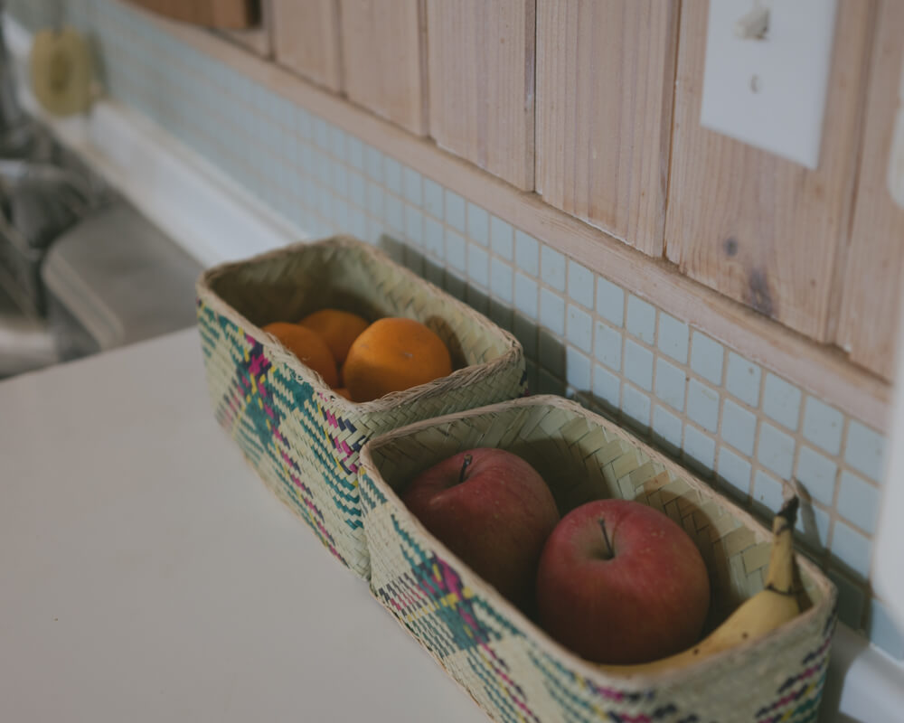 印象的な色合いと編み柄がそのまま空間のアクセントになり、見せる収納として、リビングや子ども部屋、玄関などでも便利に使えます。