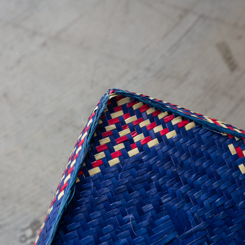 底面や側面には、細やかに交差する斜めの編み目模様。蓋と本体をまたぐようにあしらわれた大きなX字の意匠が、幾何学的な美しさを引き立てます。ふちには青の編み紐が巻かれ、全体をキリリと引き締めています。底や蓋には、意図的に編み方に変化がつけられているのもポイントです。