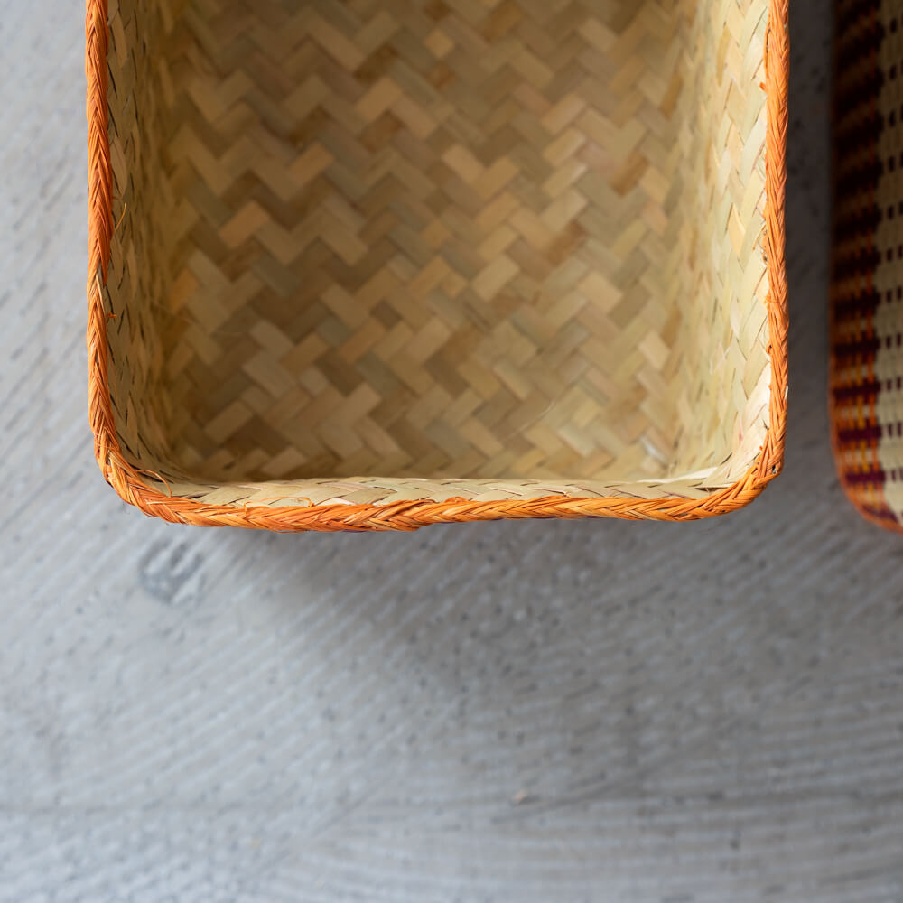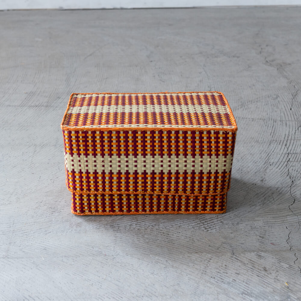 Mサイズは、ハンカチやクロス、文房具の整理にぴったりなサイズ感。ベースの素朴な色味に、臙脂色やオレンジ色の鮮やかな配色が映え、シンプルなお部屋にも明るさと遊び心をプラスしてくれます。