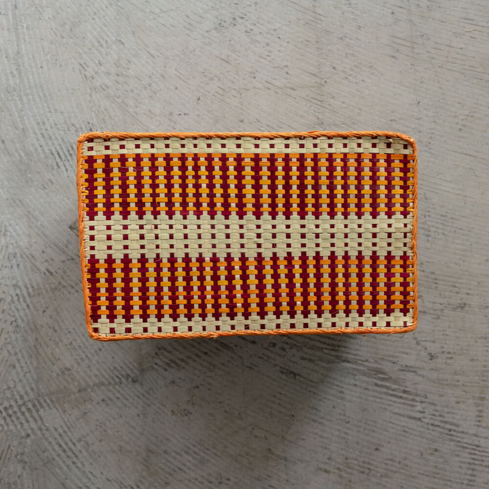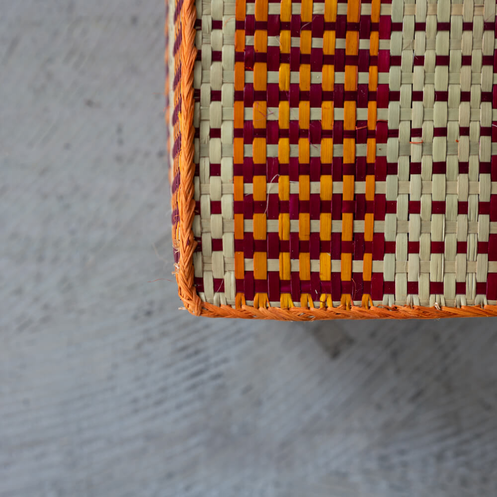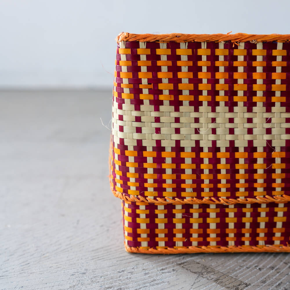 ナチュラルな水草の風合いに、臙脂色・パプリカのようなオレンジ色・生成りを織り交ぜたカラフルな市松模様が印象的な蓋付き収納かご。臙脂色に、パプリカのようなオレンジ色、やさしい生成りを効かせた色使いが、リズミカルでどこかレトロな佇まいを演出します。マダガスカルの職人が一点ずつ手仕事で編み上げた、温もりあふれる一品です。