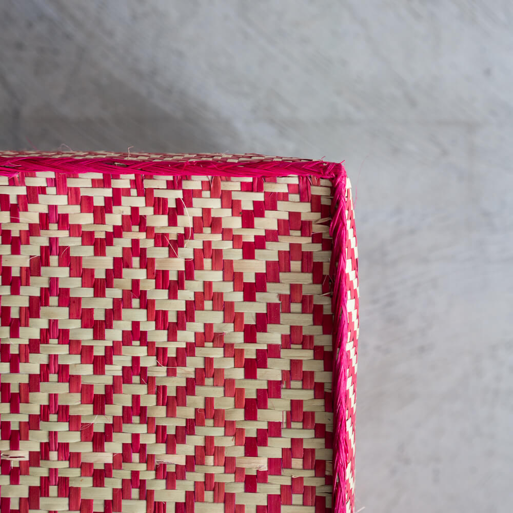 縁はビビッドなピンクの水草で巻かれ、ジグザグ模様をぐっと引き締めるアクセントに。角まで丁寧に整えられた縁巻きが、耐久性を高めると同時に、デザインの完成度も引き上げています。
