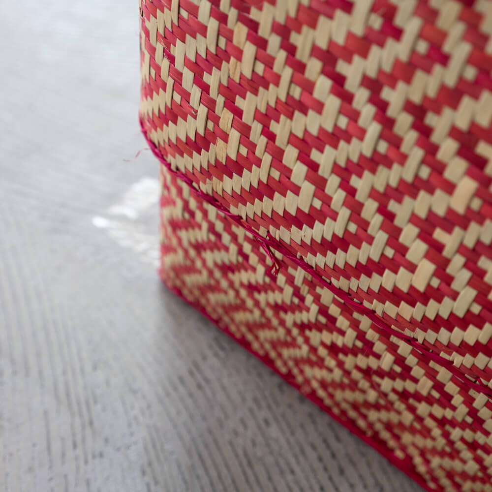 目を引くジグザグ模様と、オレンジがかった赤と生成りのコントラストが美しい、蓋付きの特大収納かご。流れるような編み模様は、他のシリーズとは異なる織り方で仕立てられており、モダンさと懐かしさが同居する独特の存在感を放ちます。マダガスカルの職人がひとつひとつ丁寧に手編みした、手仕事の味わいが光るアイテムです。