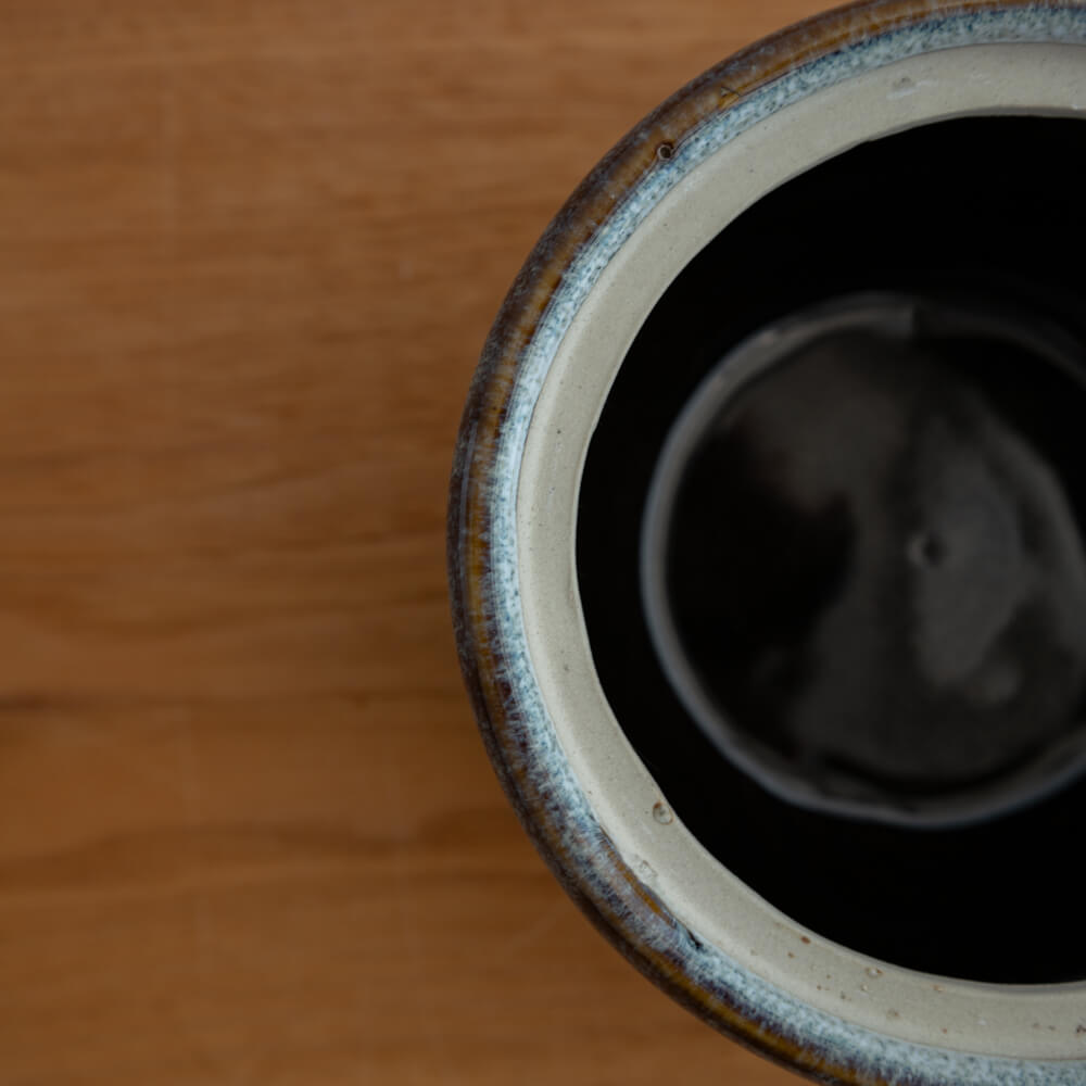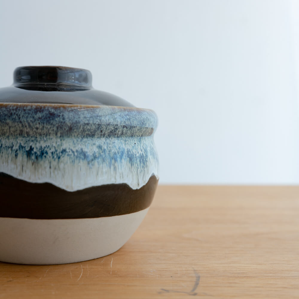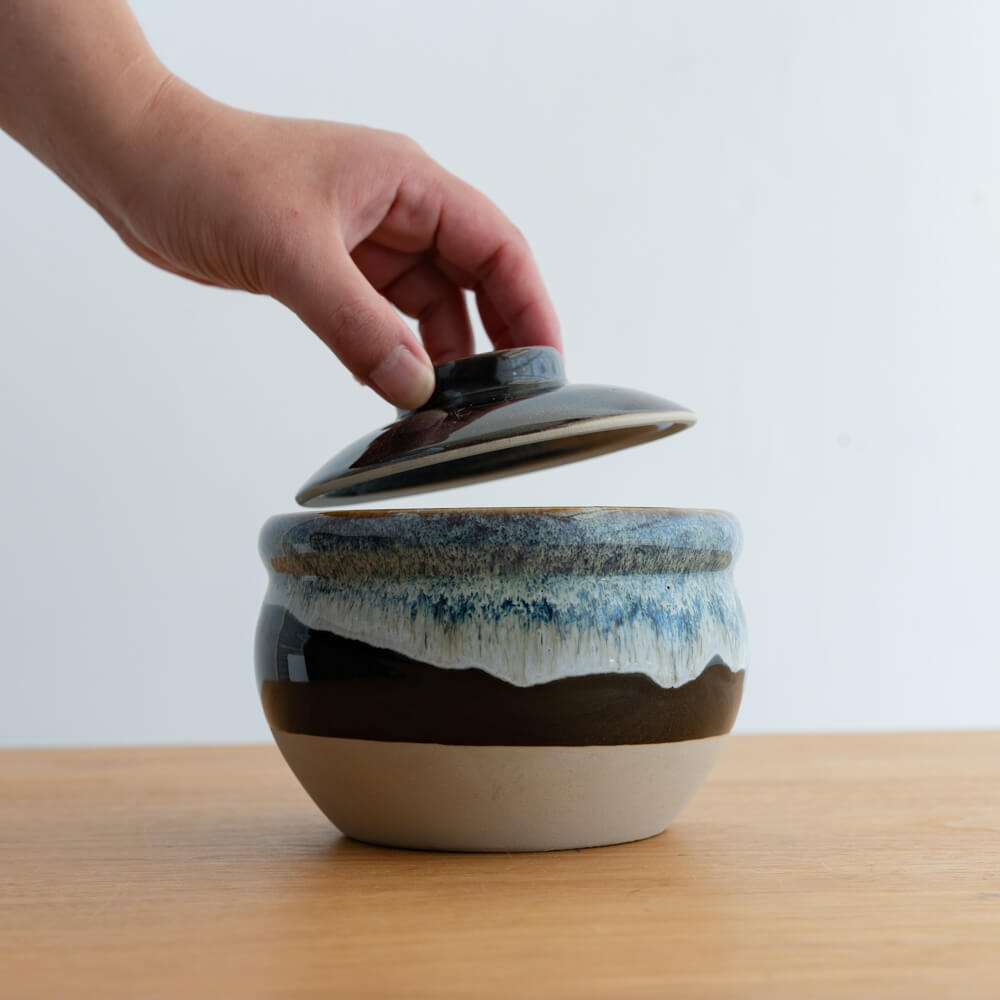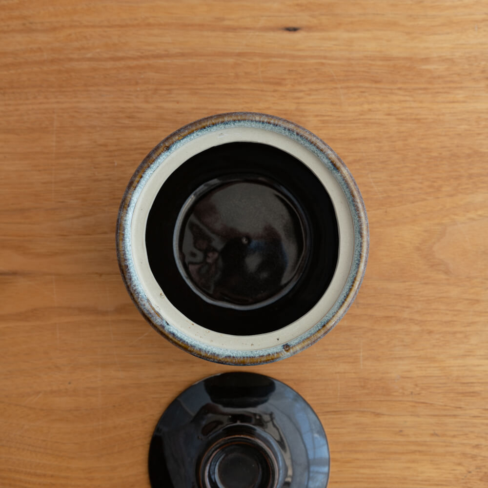 艶やかな黒釉に、流れるような青と褐色の縁取り。手仕事ならではの温かみを感じる小壺です。調味料や茶葉を入れる保存容器としてはもちろん、インテリアの一部としても存在感を放ちます。