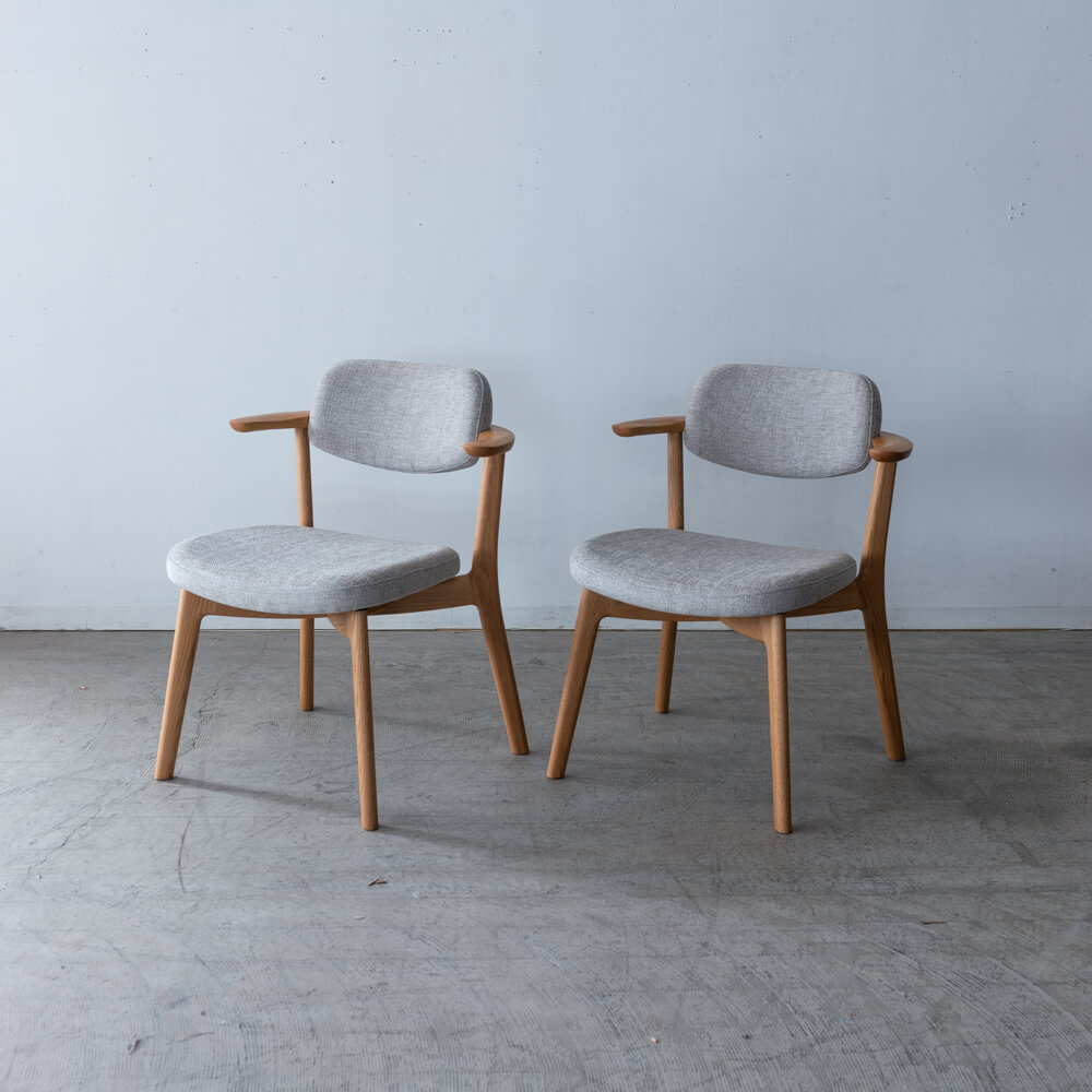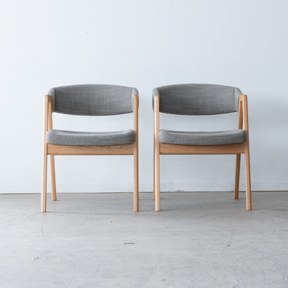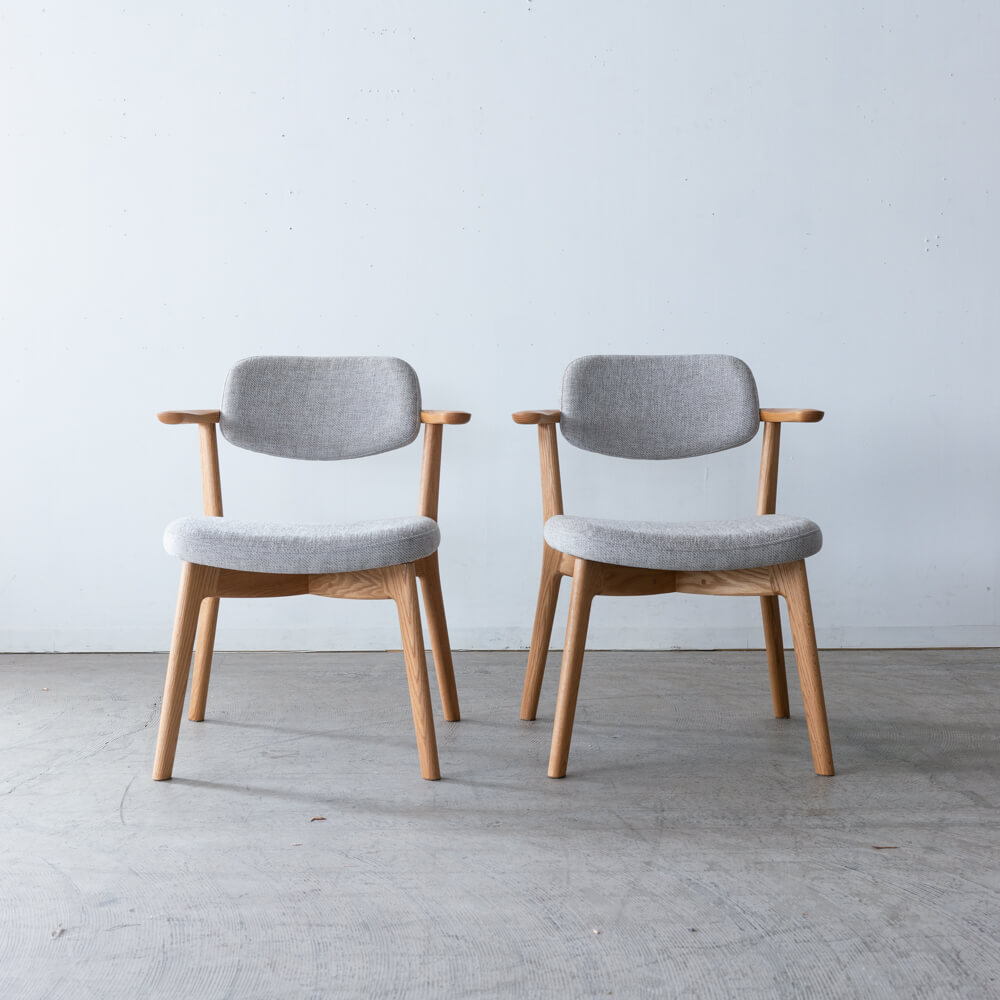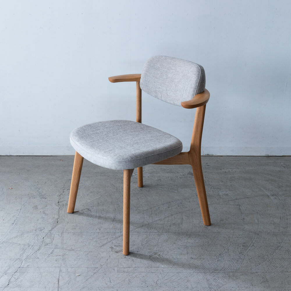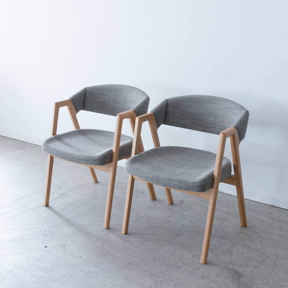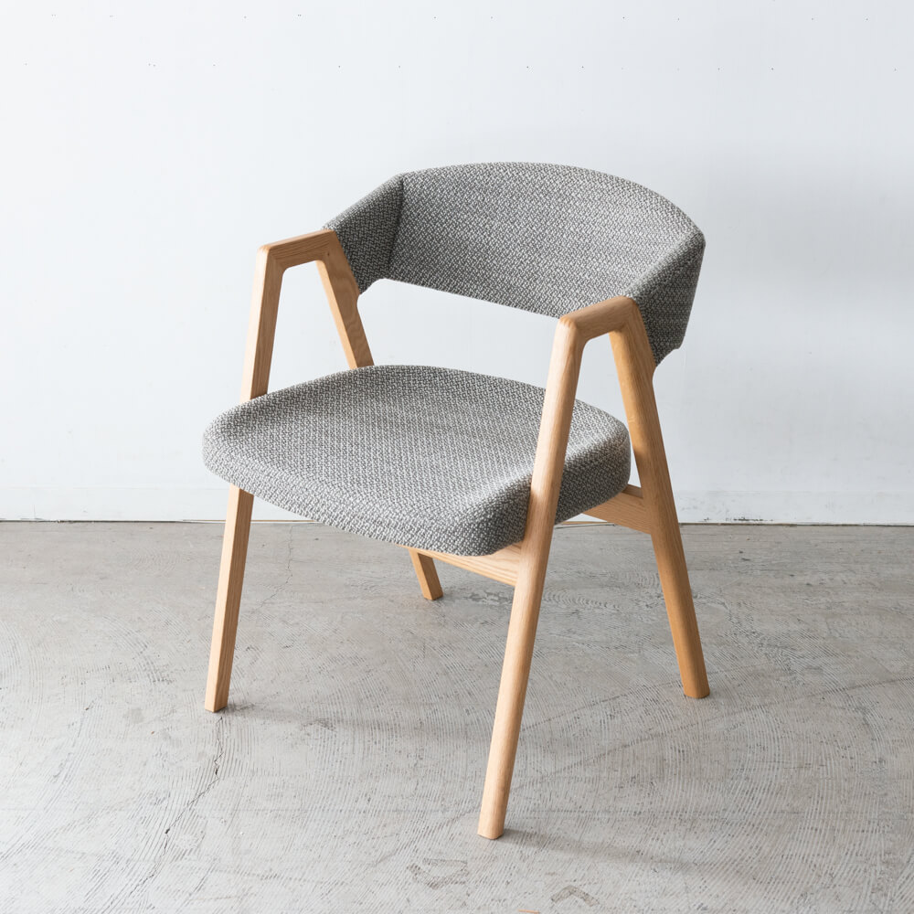 アームチェアの張地には、モノトーンを基調とした糸を組み合わせ、凹凸のある立体的な織り模様を施しています。視覚的にも温かみがあり、手で触れると心地よいざっくりとした質感が伝わります。