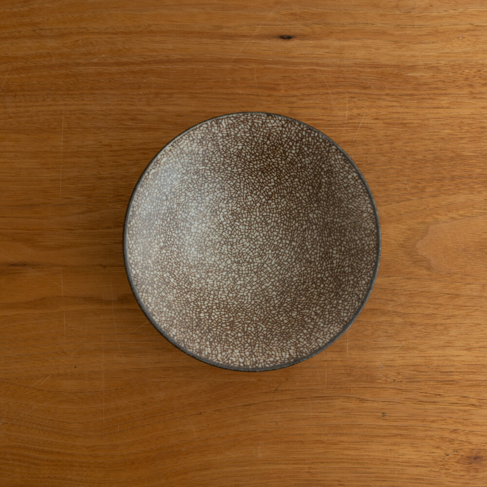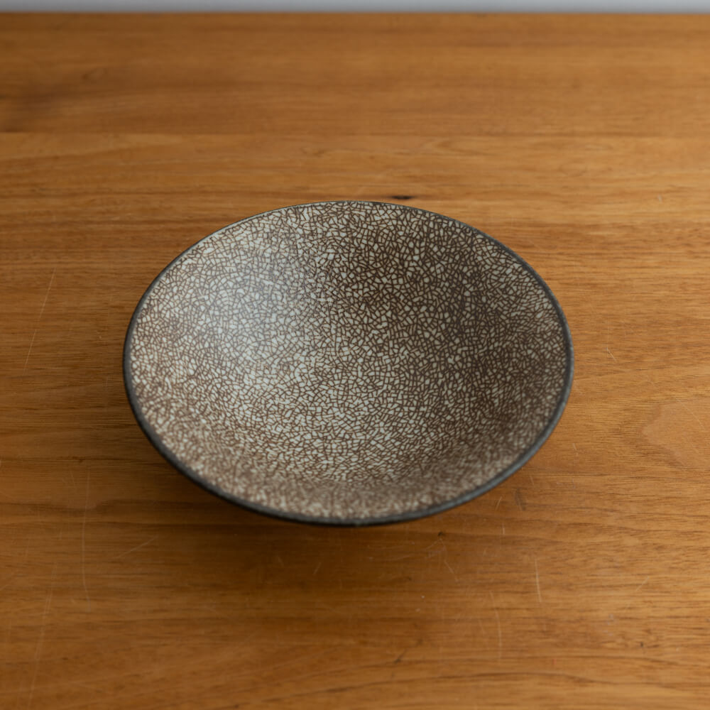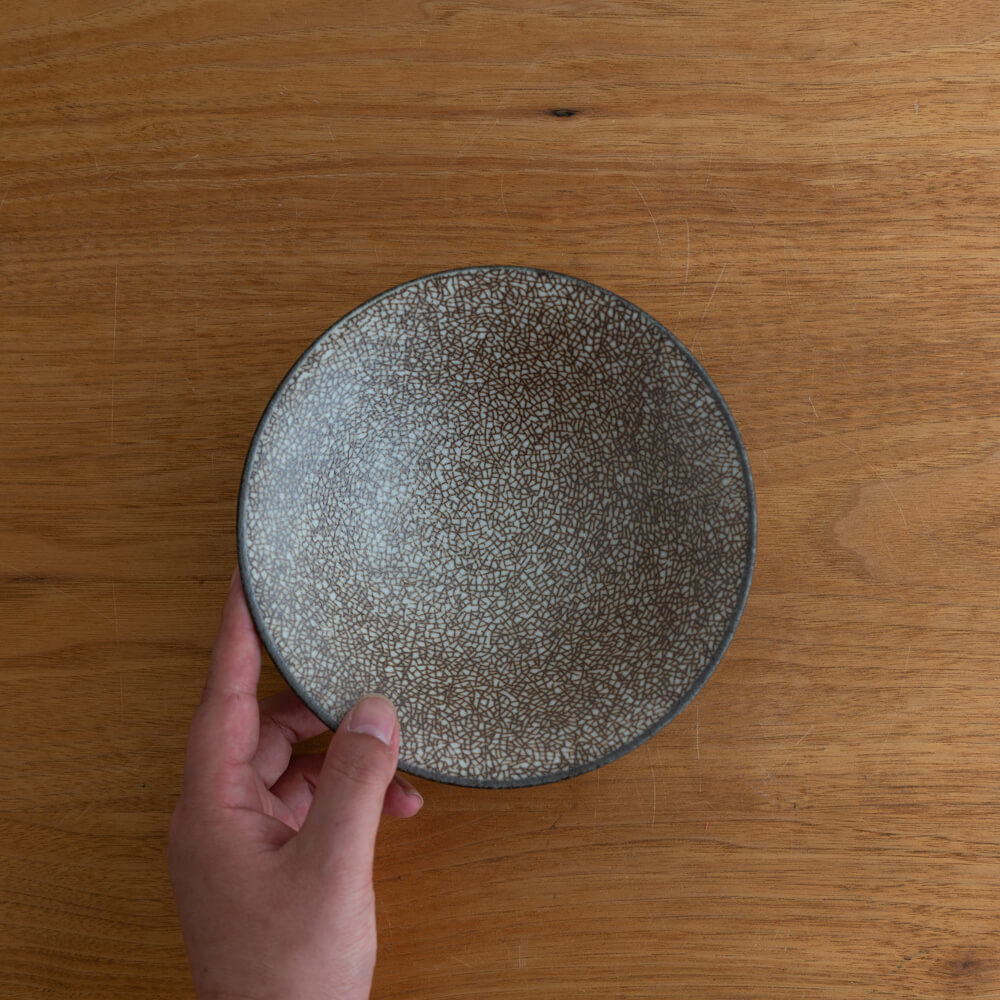 ひび模様が美しい「かいらぎ」に、光の角度によって金彩のようなきらめきを感じる平鉢。手仕事ならではの揺らぎと光沢が響き合い、日常の食卓に上品な華やかさを添えます。和の趣を感じながらも、モダンな料理とも好相性。盛り付けるたびに表情が変わる、特別な一枚です。