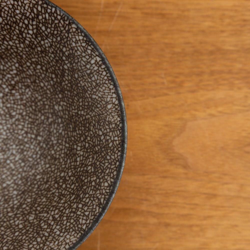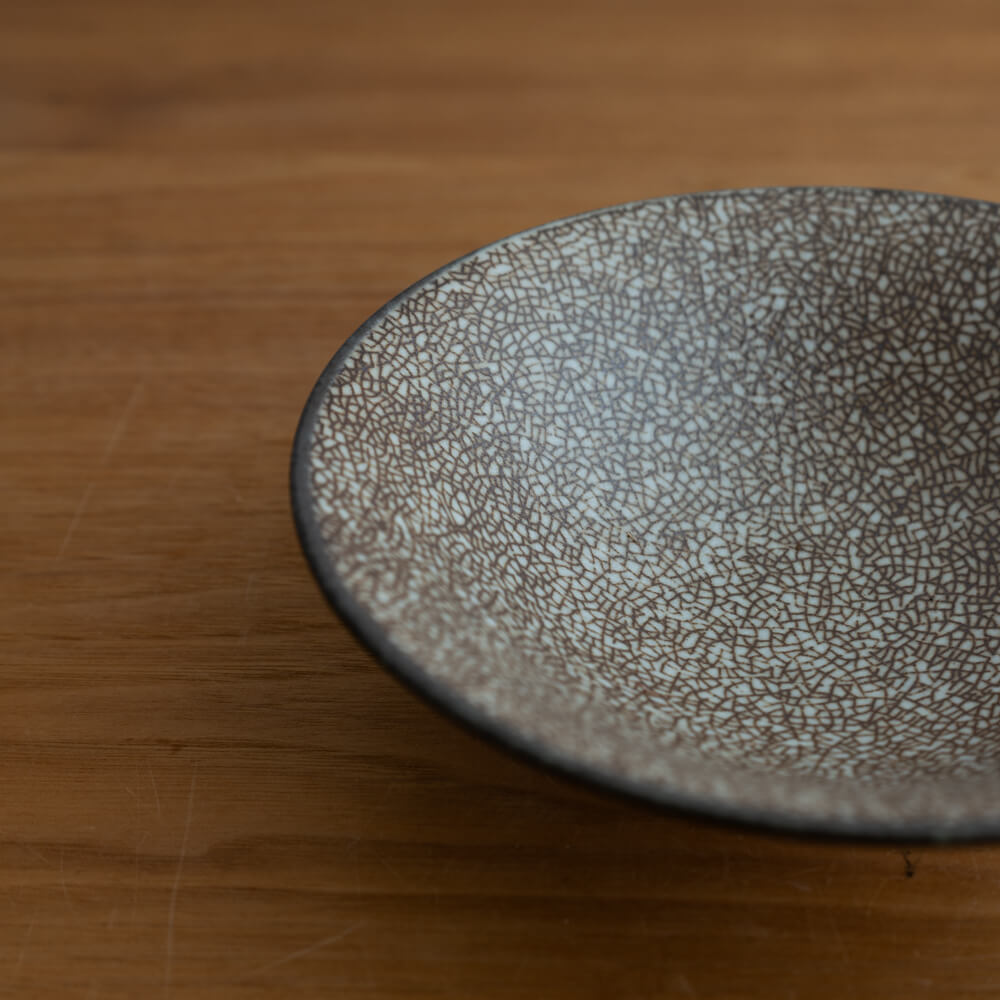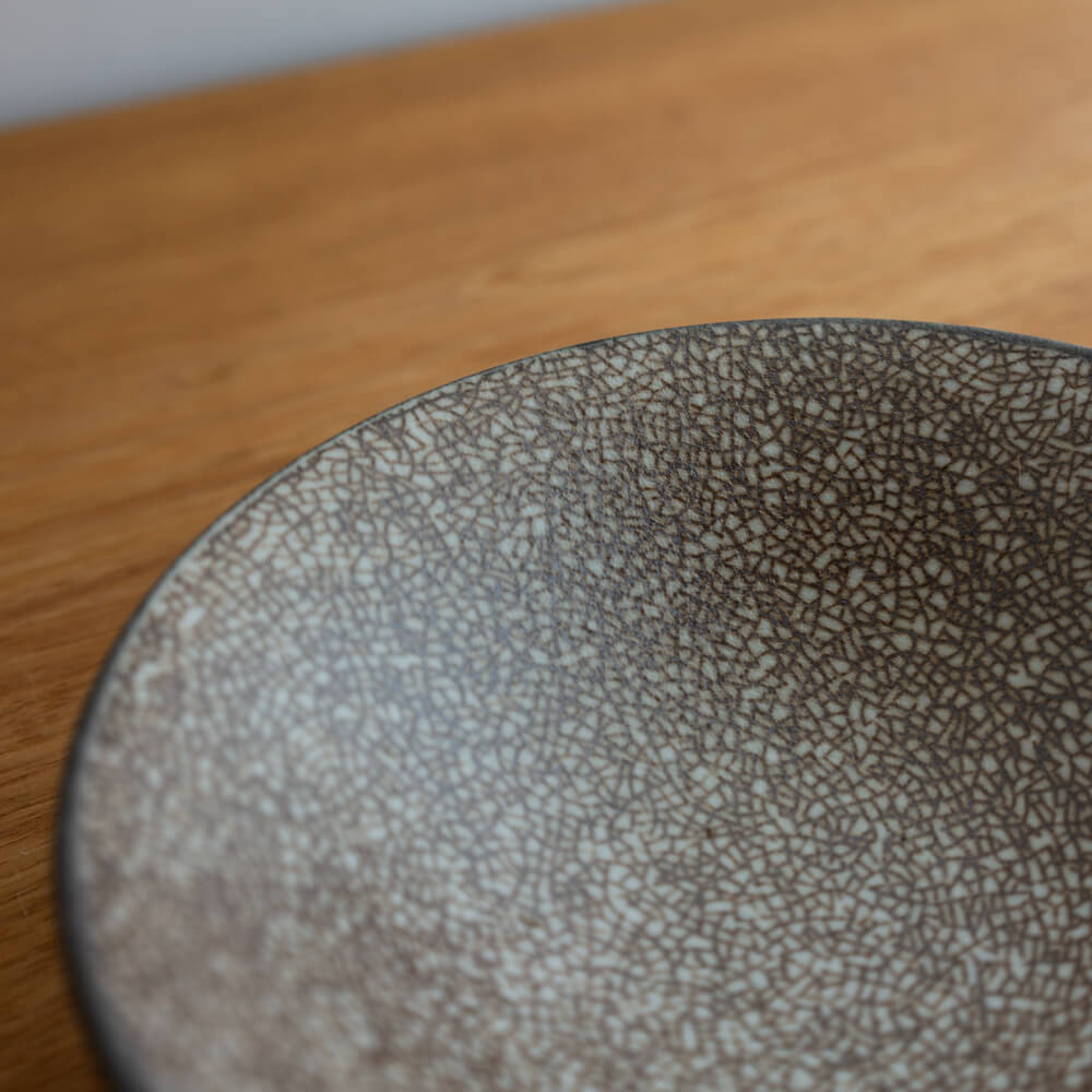 陶肌に浮かぶかいらぎ模様は、一つとして同じものがない自然の美。器の表面に生まれる細かなひび模様が光を受けて陰影をつくり、料理を引き立てます。