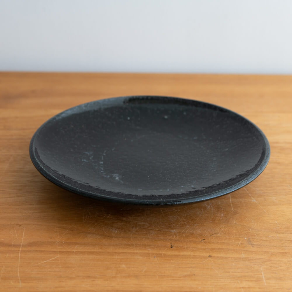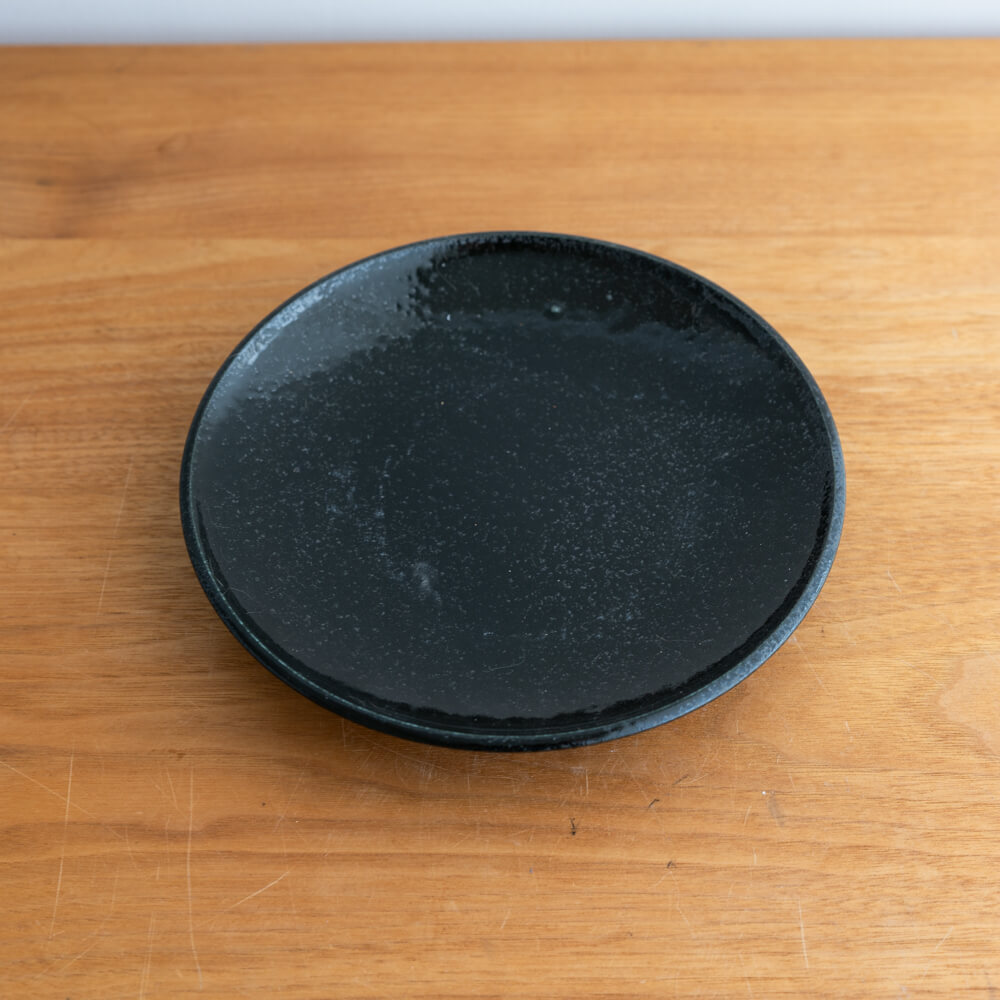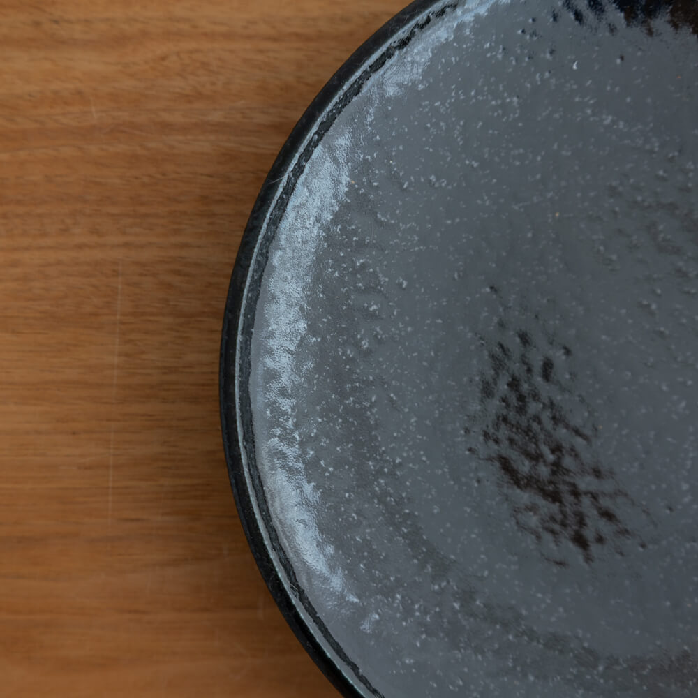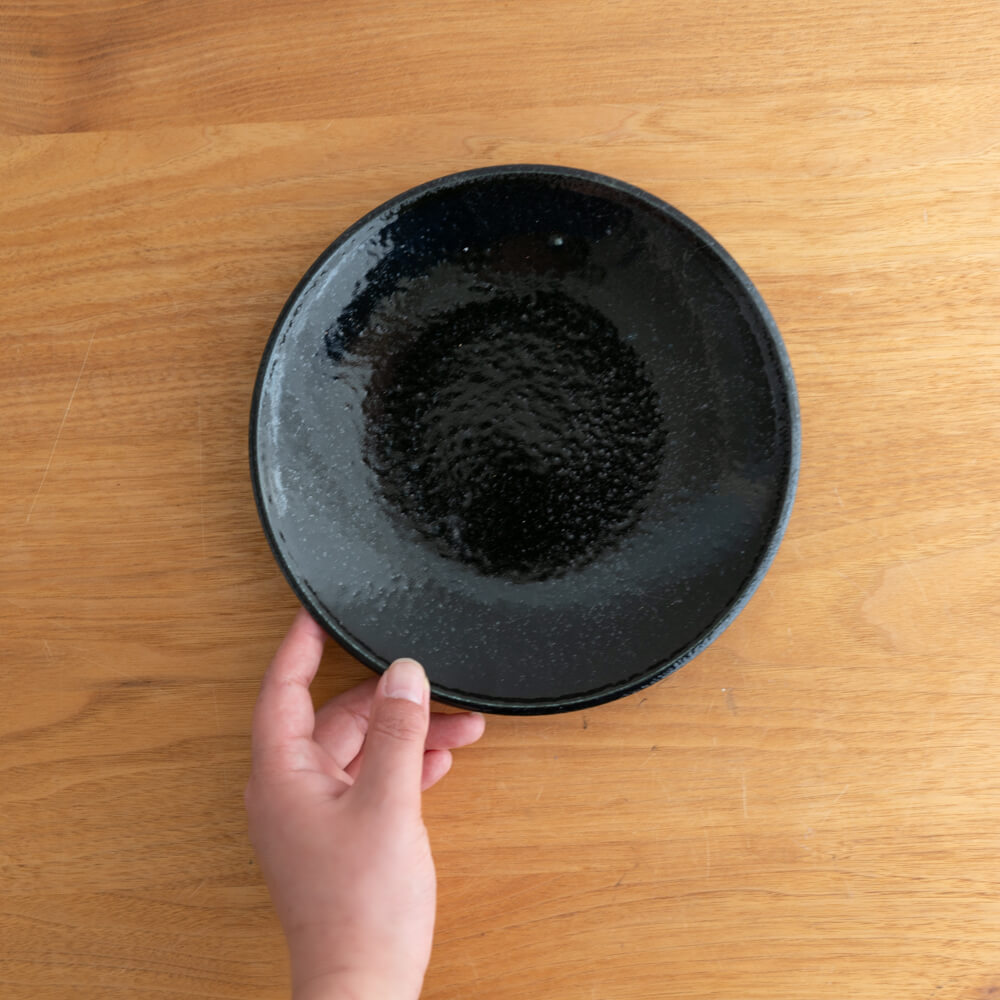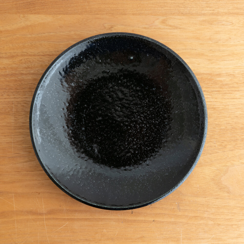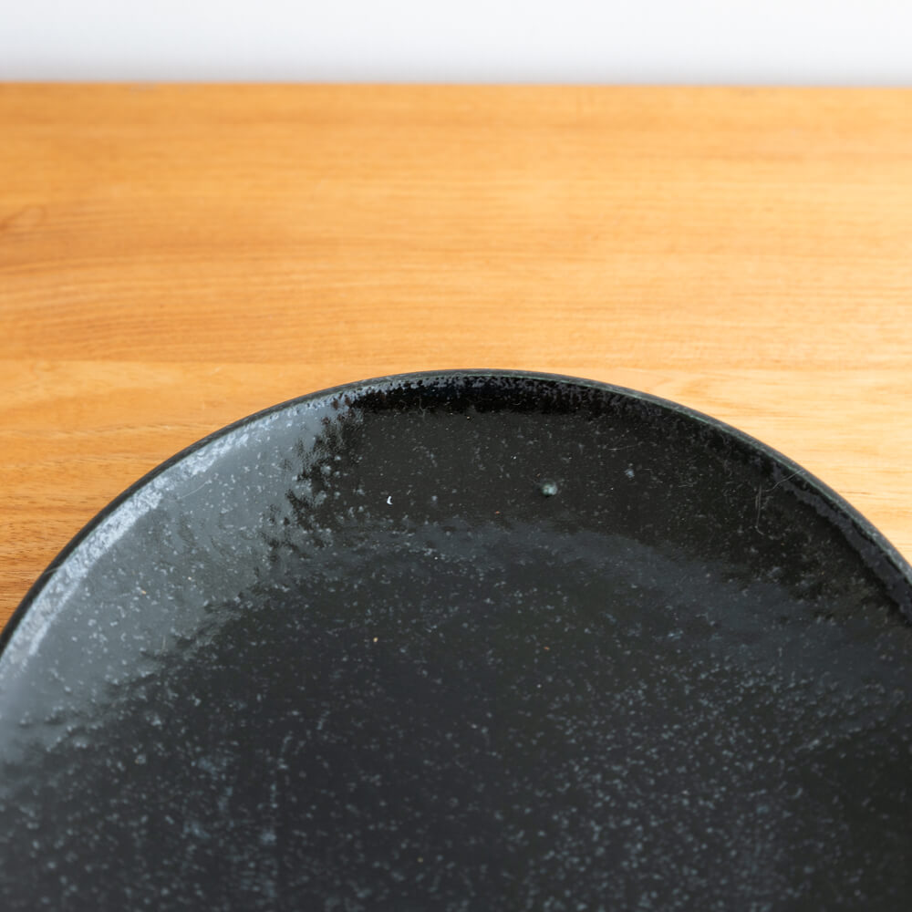 黒の釉薬に白い結晶のような景色が浮かぶ「黒天目丸皿」。和食器らしい趣を持ちながらも、モダンな印象で日常の食卓を引き立てます。取り皿やケーキ皿、盛皿として幅広く使えるサイズ感で、料理をぐっと引き立てる存在感があります。