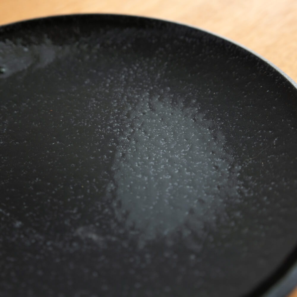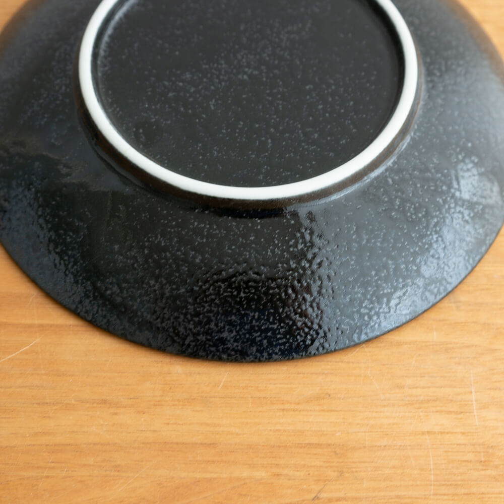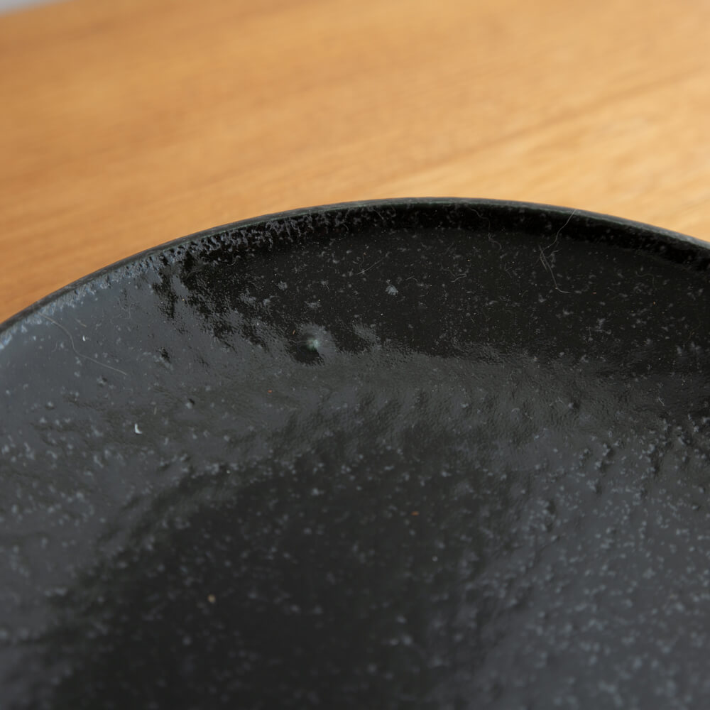 艶やかさとマット感が混じり合い、光の角度でさまざまな表情を見せる黒釉。そこに白い結晶模様がきらめきます。料理を引き締め、盛り付けを美しく際立たせる効果があります。