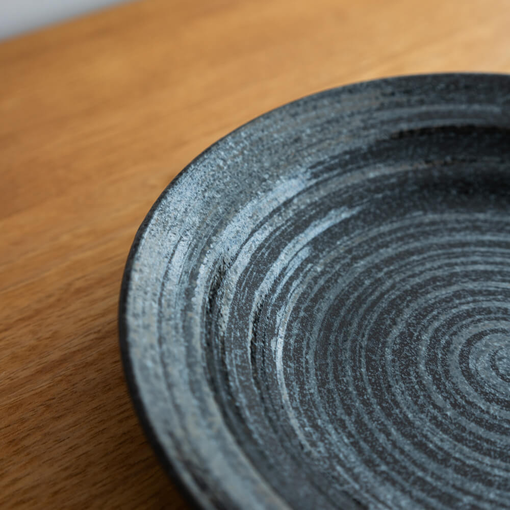A. 渦の模様は、陶器を成形する際に使う「轆轤(ろくろ)」の跡を活かしたものです。ろくろの回転に合わせて土が伸び、その軌跡がそのまま器の景色になります。日本の陶器では、あえてその“作りの痕跡”を残すことで、職人の息づかいや土の生命感を感じさせる文化があります。料理を盛ると自然と中央に視線を集め、まるで料理が舞台に立つように引き立ててくれるんです。
