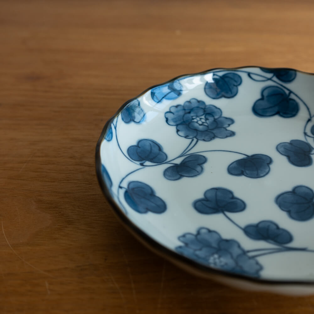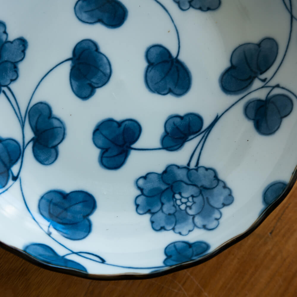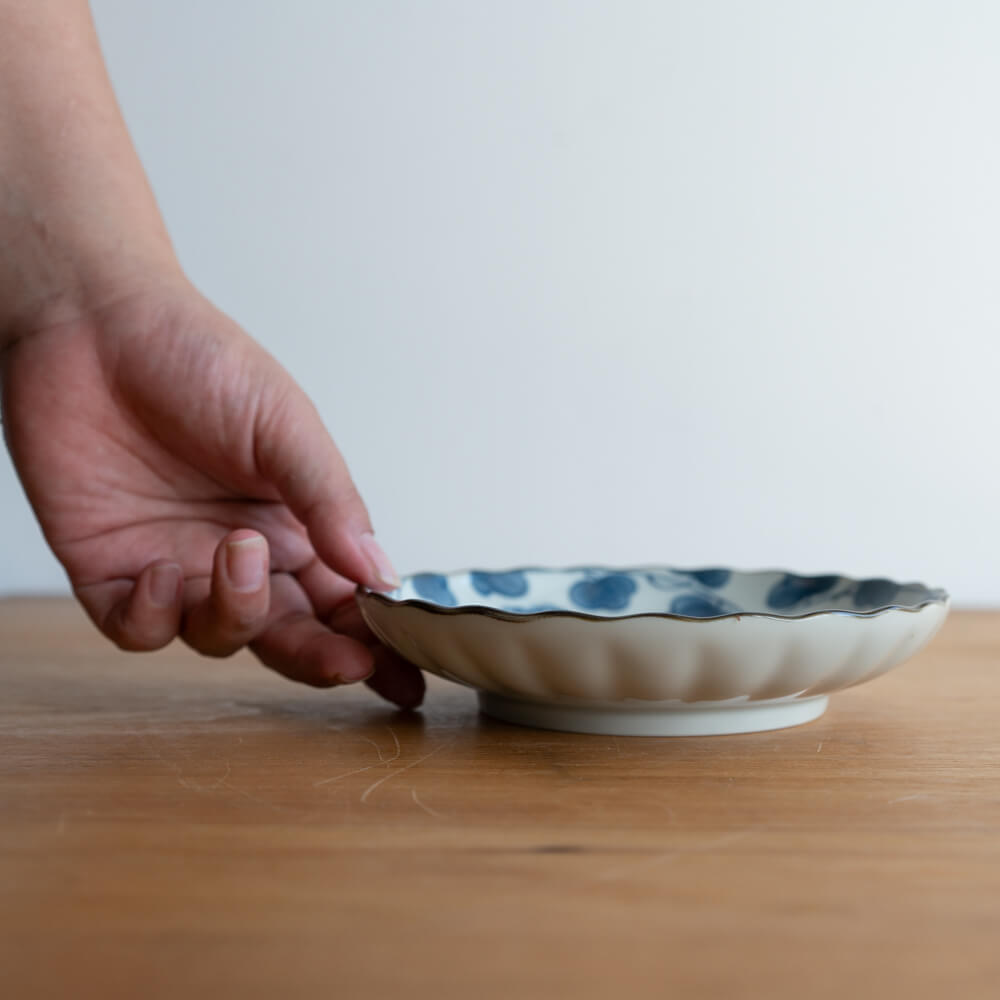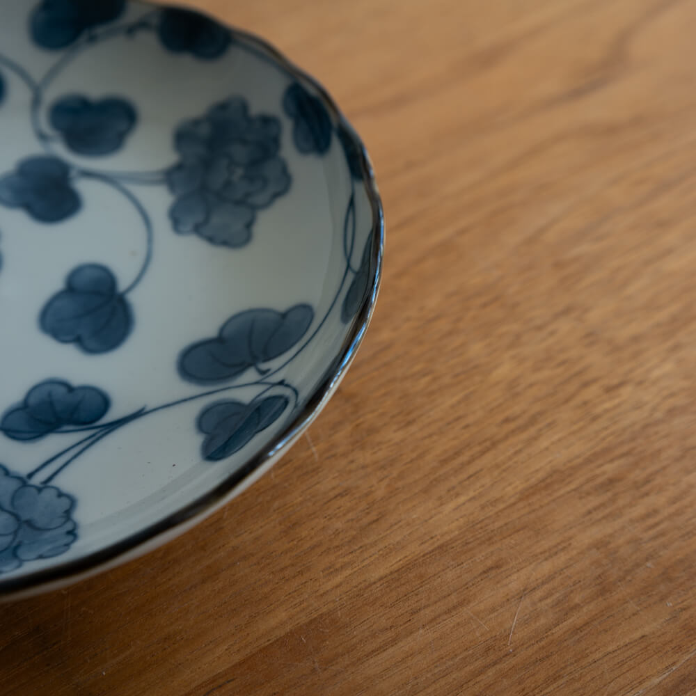 口縁は波打つようにゆるやかな輪花形。花びらを思わせるフォルムが、器に柔らかさと品格を添えます。鉄釉による「錆」がほどこされ、藍色の文様をきりりと引き締めます。縁が強調されることで器全体に立体感が生まれ、盛り付けた料理をより美しく見せてくれます。