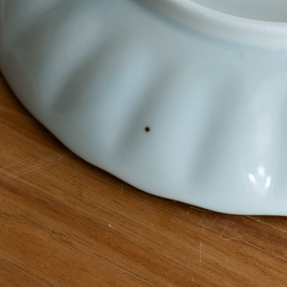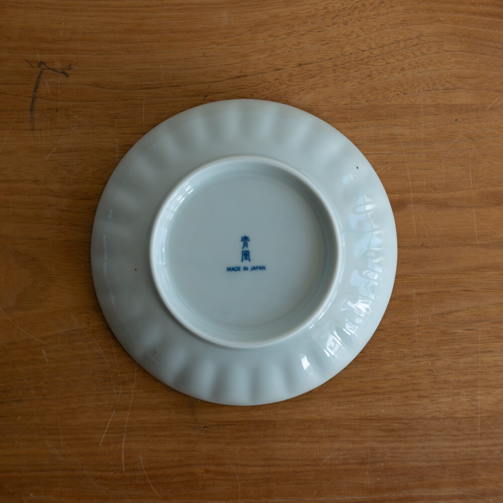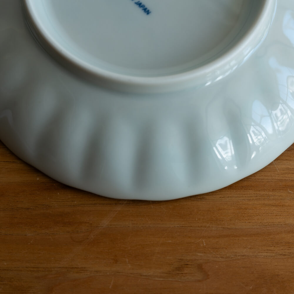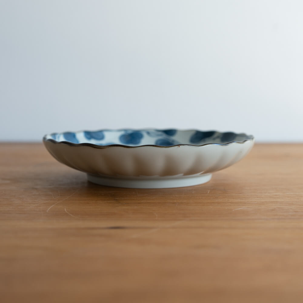 口縁は波打つようにゆるやかな輪花形。花びらを思わせるフォルムが、器に柔らかさと品格を添えます。鉄釉による「錆」がほどこされ、藍色の文様をきりりと引き締めます。縁が強調されることで器全体に立体感が生まれ、盛り付けた料理をより美しく見せてくれます。