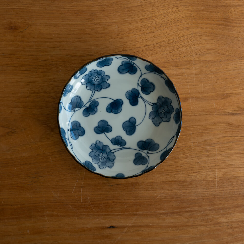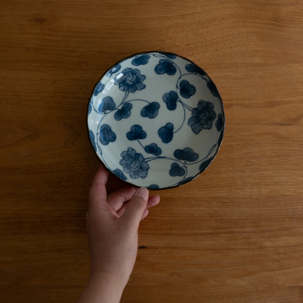藍の濃淡で描かれた花と蔓が広がる、染付の5寸皿。食卓に上品な華やかさを添え、和洋問わず使いやすい一枚です。普段使いにも、おもてなしにも映える和食器としておすすめです。