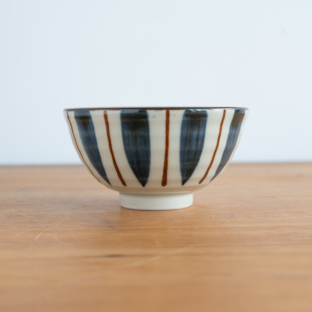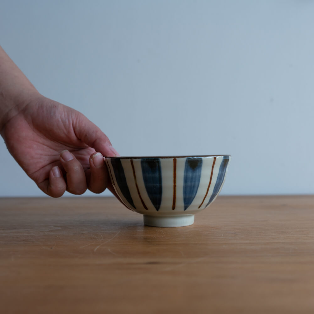岐阜県・美濃でつくられた陶器の器。白地に藍と飴色で描かれた縦縞模様は、すっきりとした佇まいの中に温かみを添えています。ご飯茶碗や小鉢として日常に取り入れやすいサイズ感で、食卓にリズムと彩りを与えてくれます。
