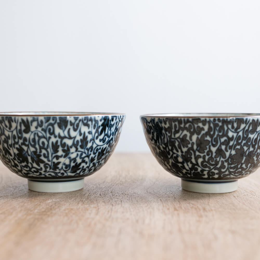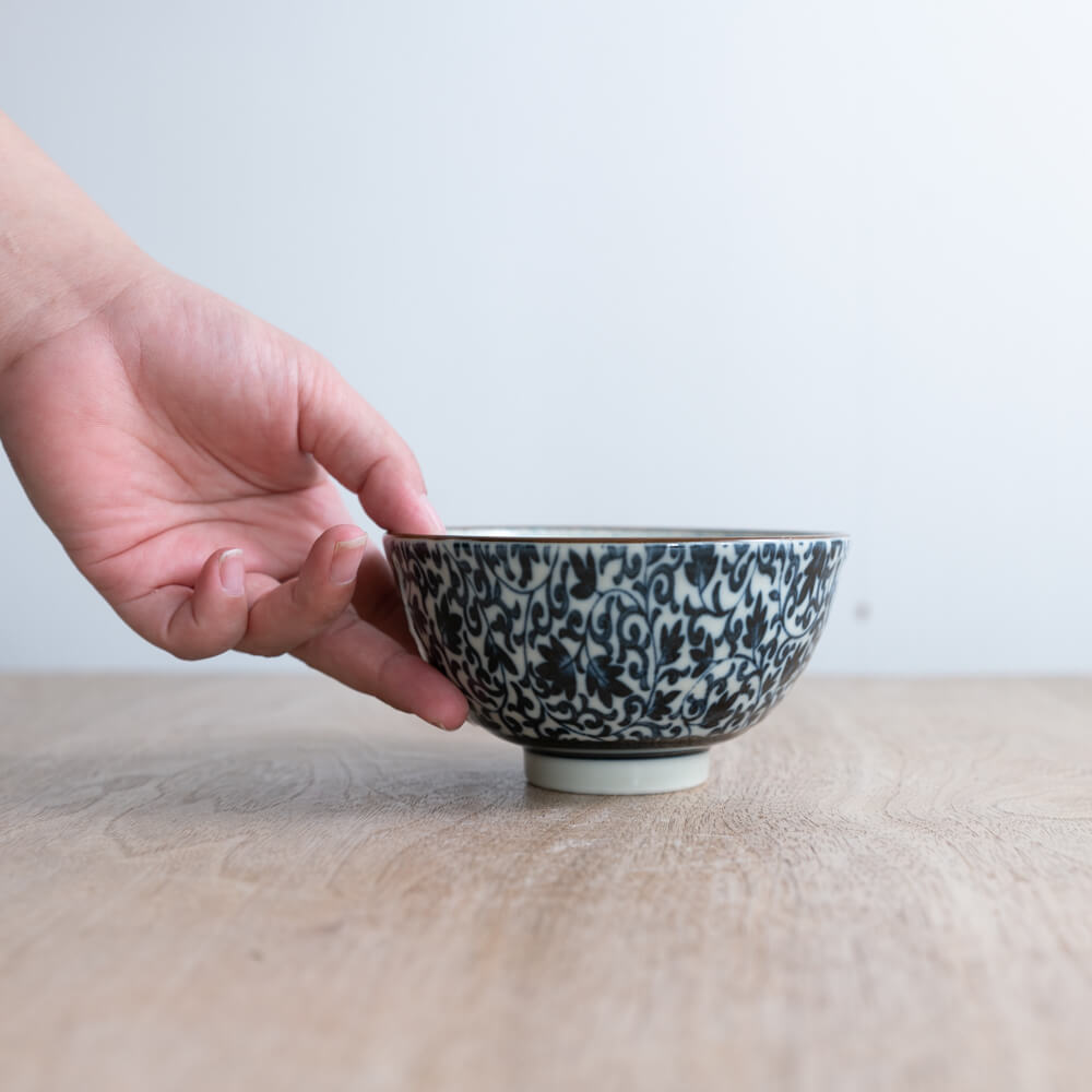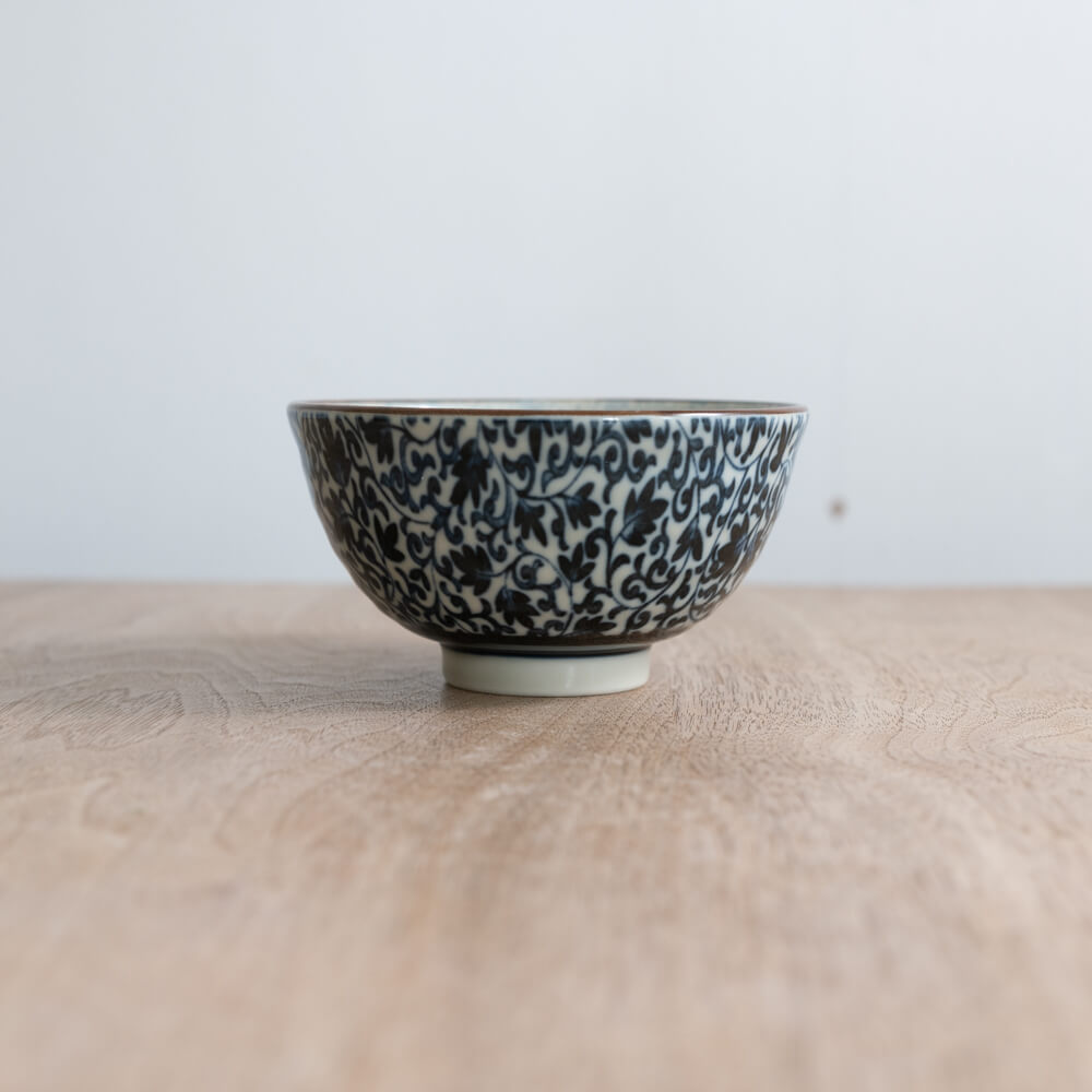 伝統的な唐草文様を纏いながらも、白と藍のシンプルな配色は洋食やアジアン料理とも相性抜群。和食器としてだけでなく、幅広い食卓シーンで活躍します。