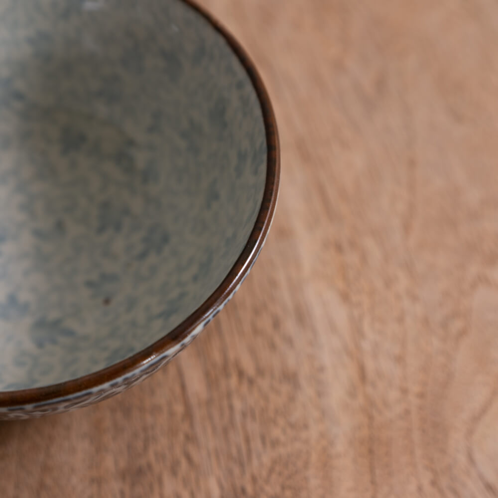 口縁に施された茶色の縁巻きは、全体を優しくまとめあげるアクセント。白と藍のコントラストを引き締め、器に上品な温かみを添えています。細部まで気配りのあるデザインです。