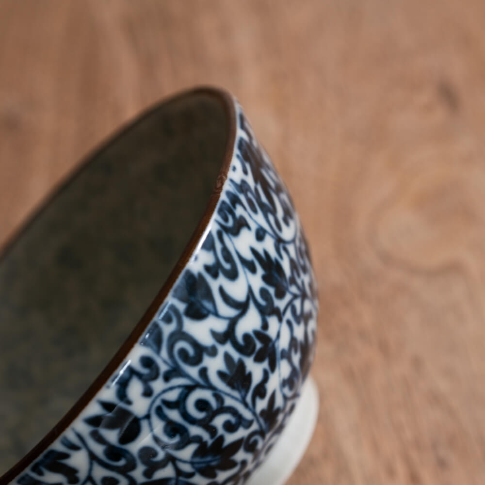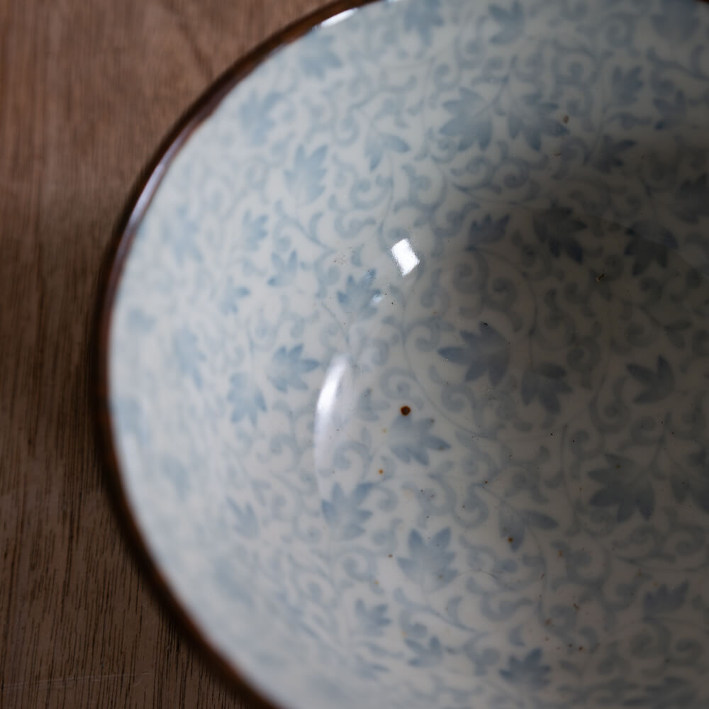 清らかな白地に、藍色の唐草文様が繊細に広がる大平碗。口縁には茶色のラインが走り、器全体を引き締めながら優しい温もりを添えています。古典的な文様でありながら、日常の食卓にすっと馴染む和食器です。