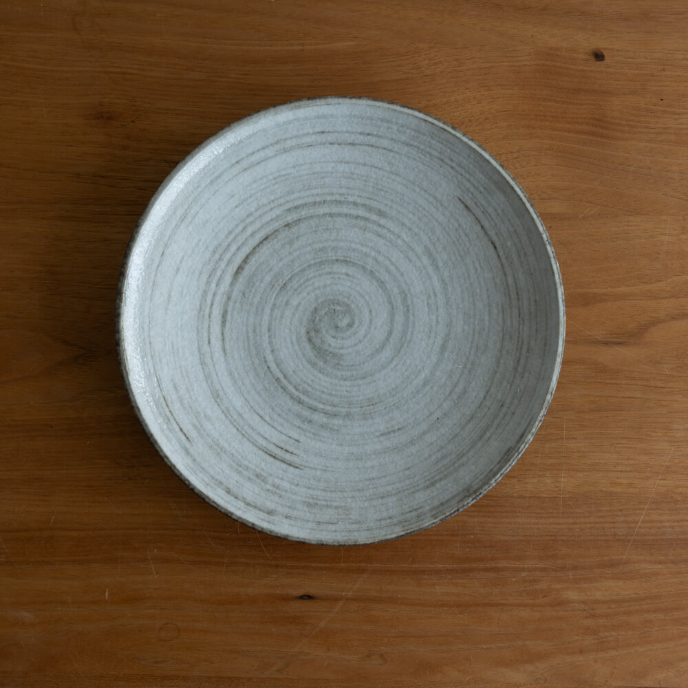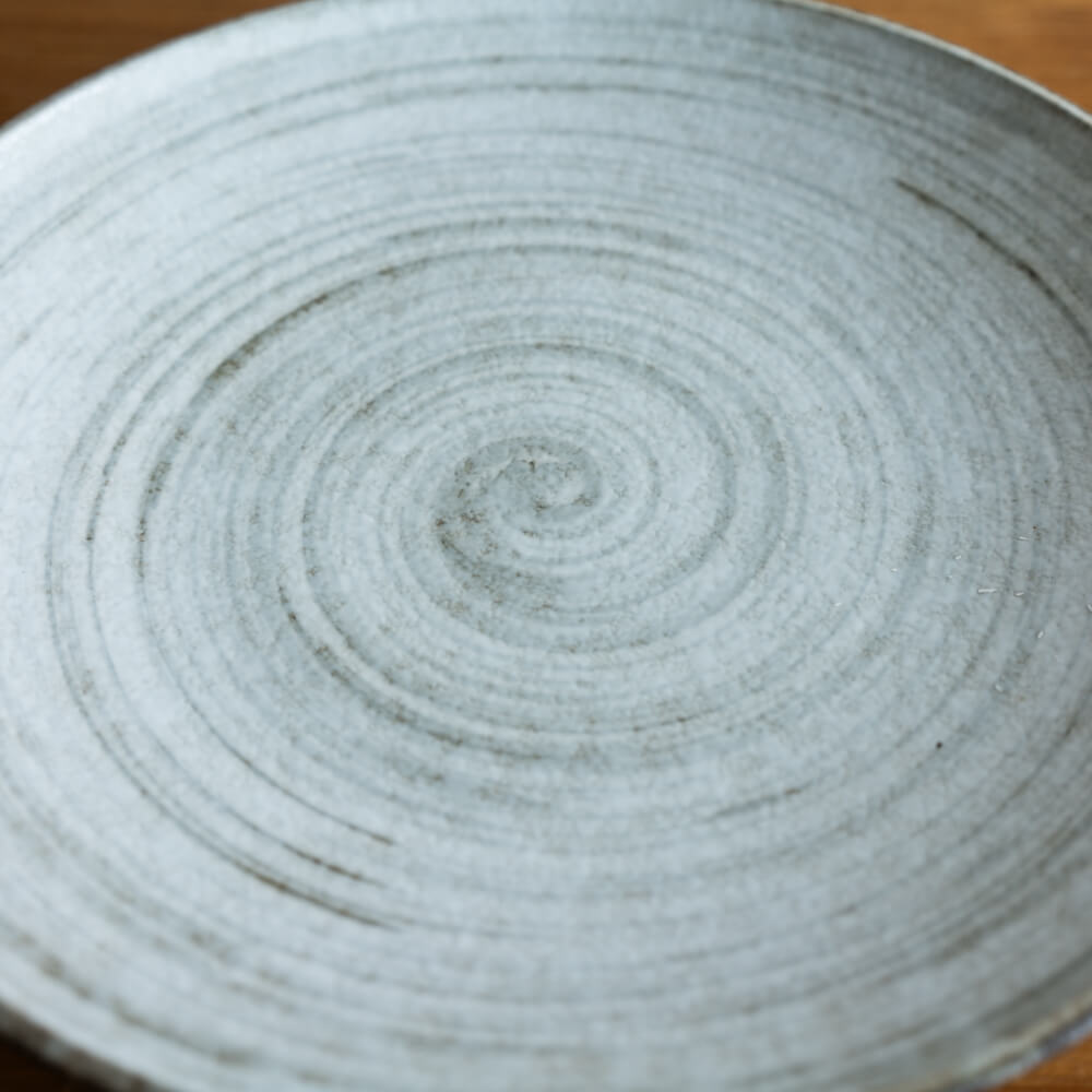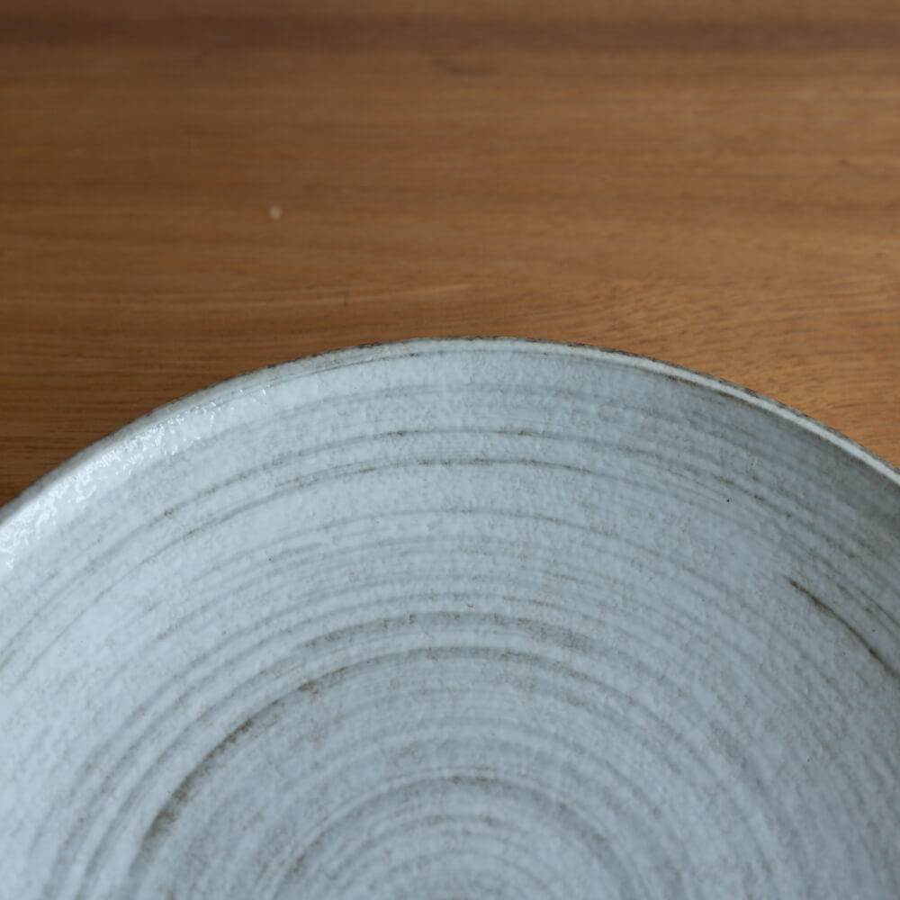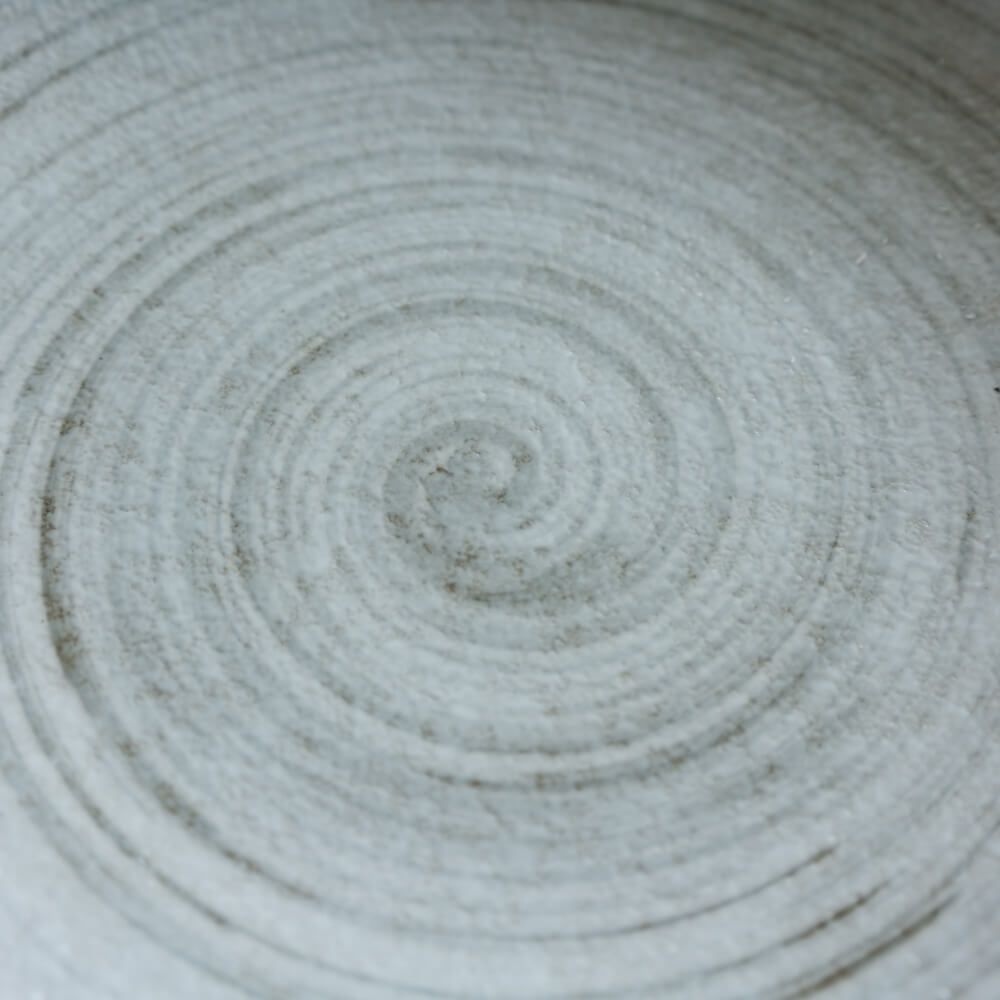静かな白の釉薬に浮かび上がる、ろくろ目の渦模様。料理を引き立てる存在感と、日々の食卓にすっと馴染むやさしさを兼ね備えた大皿です。和洋問わず盛り付けを美しく見せてくれる、使い勝手の良い一枚となっています。