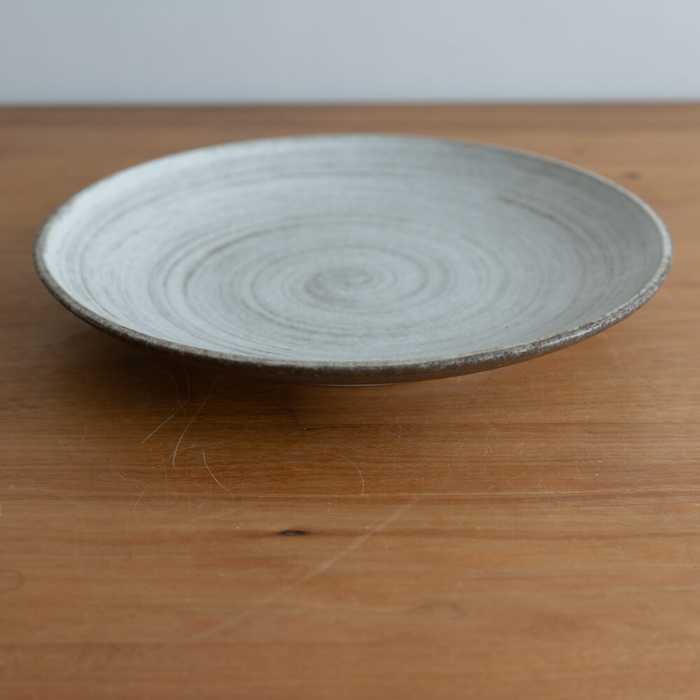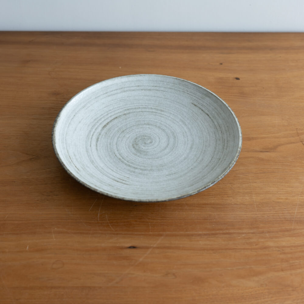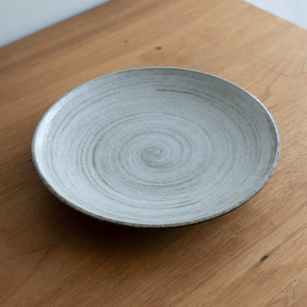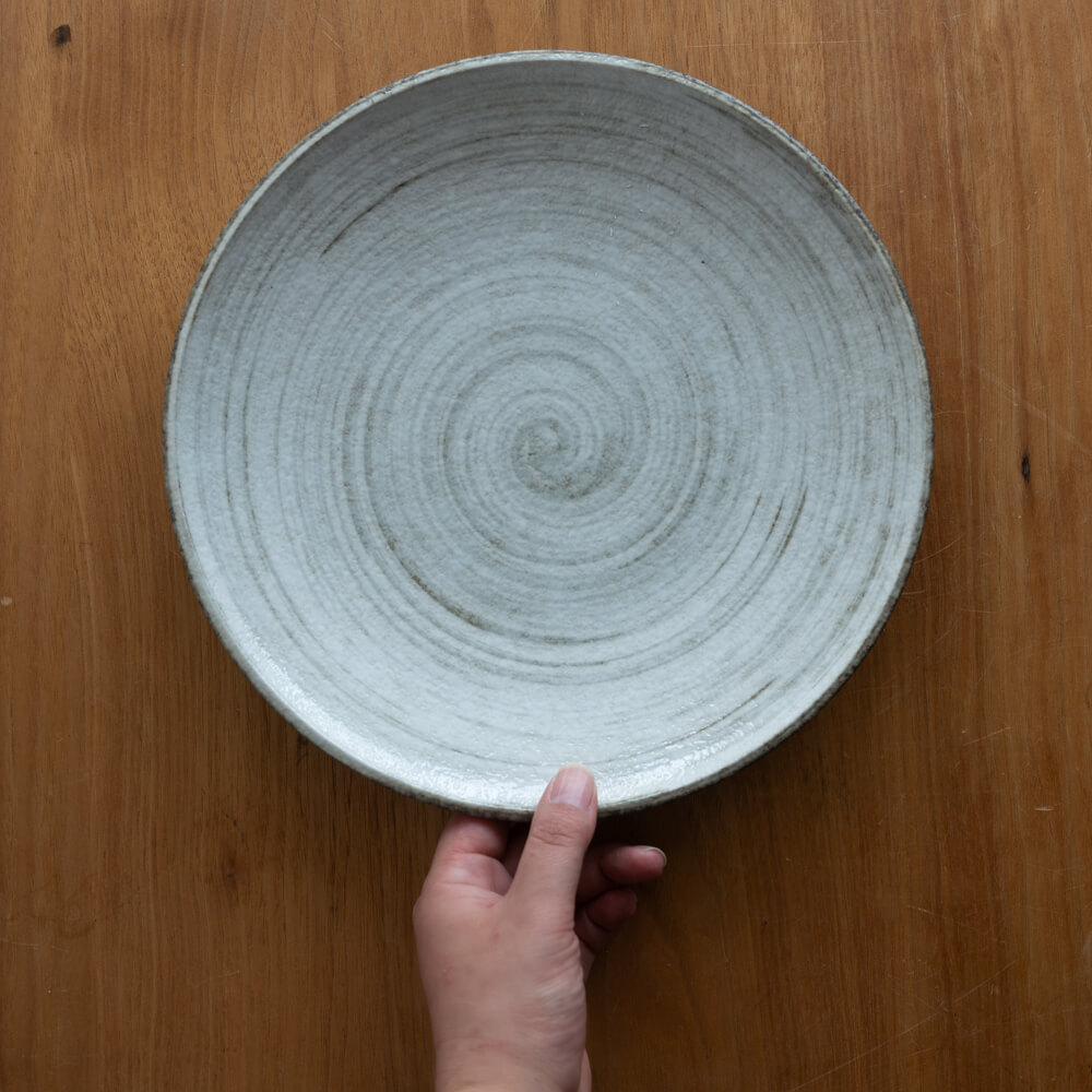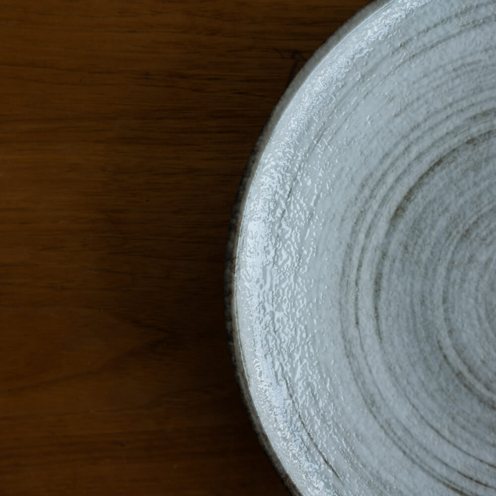 静かな白の釉薬に浮かび上がる、ろくろ目の渦模様。料理を引き立てる存在感と、日々の食卓にすっと馴染むやさしさを兼ね備えた大皿です。和洋問わず盛り付けを美しく見せてくれる、使い勝手の良い一枚となっています。