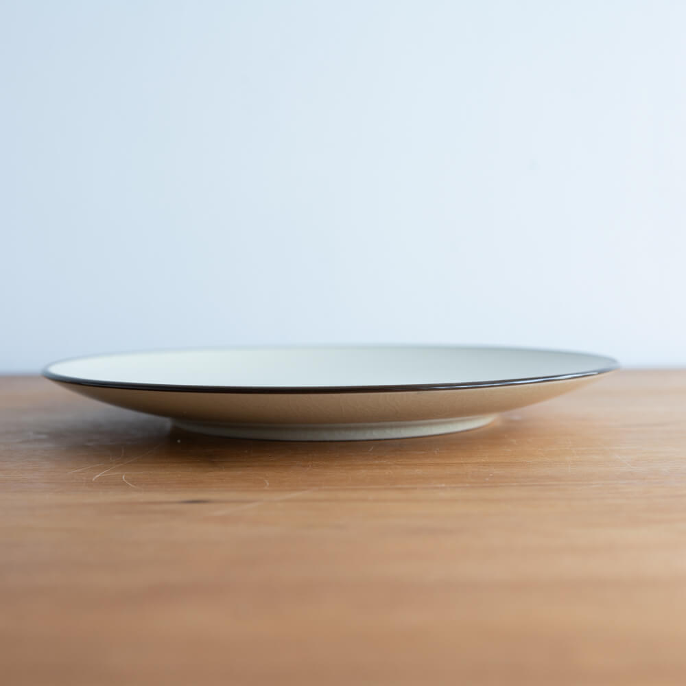 シンプルな白釉に、深みのある茶の縁取り。食卓に置いたときに料理を引き締め、全体を上品に見せるデザインです。和の趣を感じつつも、モダンなテーブルにも自然に馴染みます。