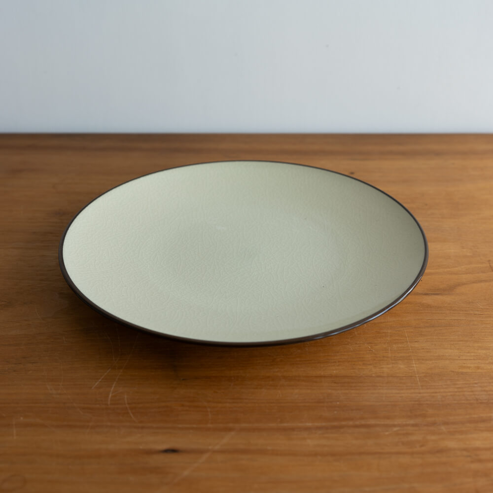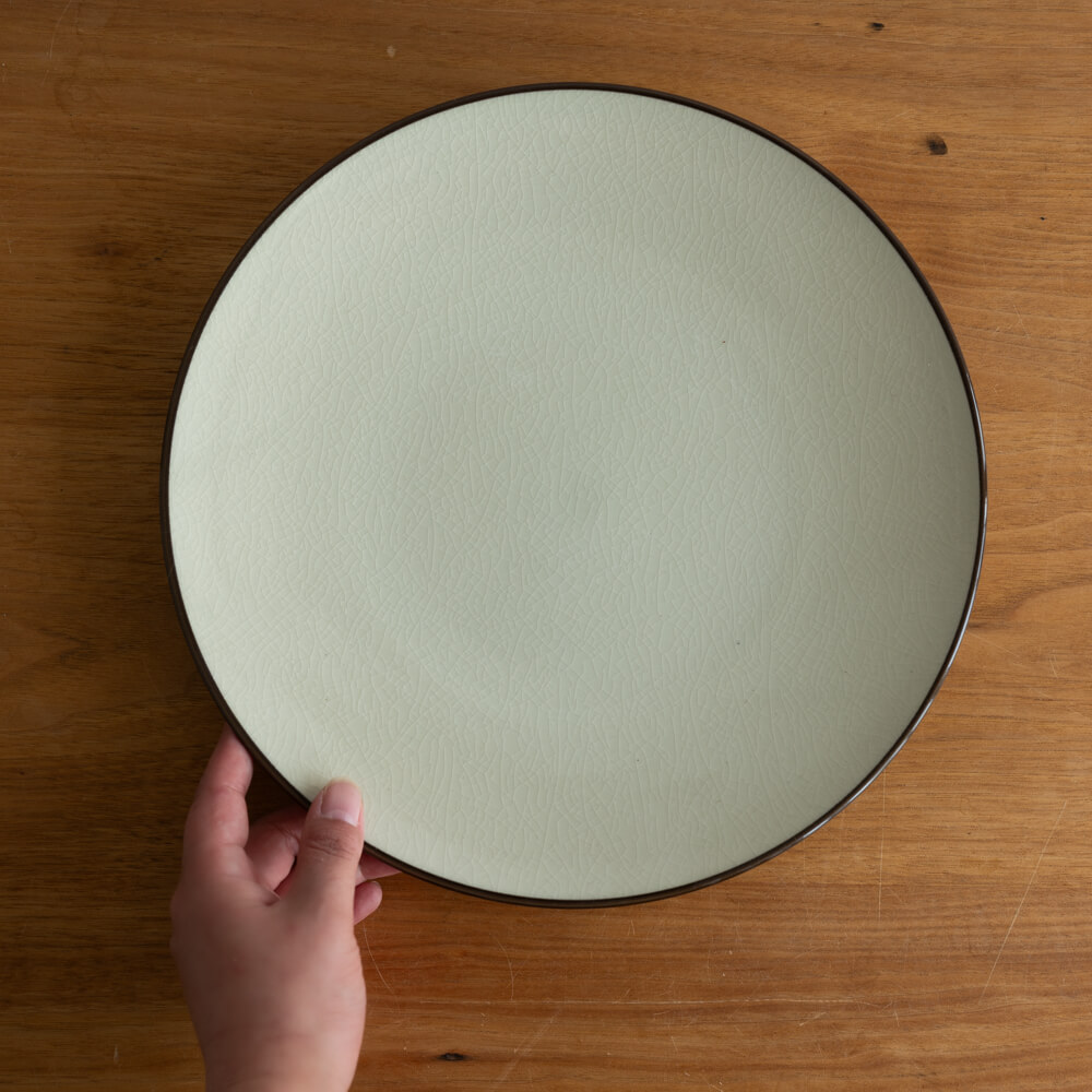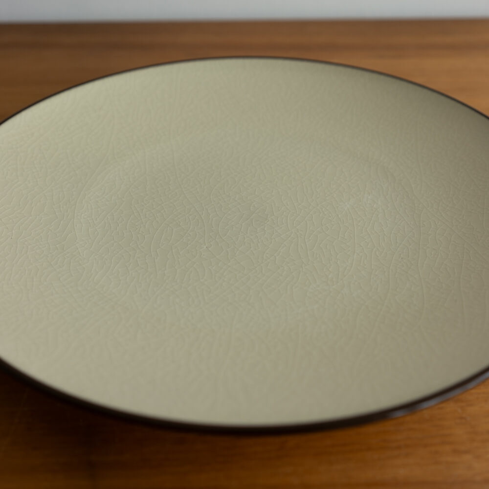 貫入(かんにゅう)と呼ばれる独特のひび模様が、光の加減で表情を変える陶器の大皿。縁には渋みのある錆色が施され、落ち着いた存在感を放ちます。和食はもちろん、洋食やスイーツにも映える万能な一枚です。