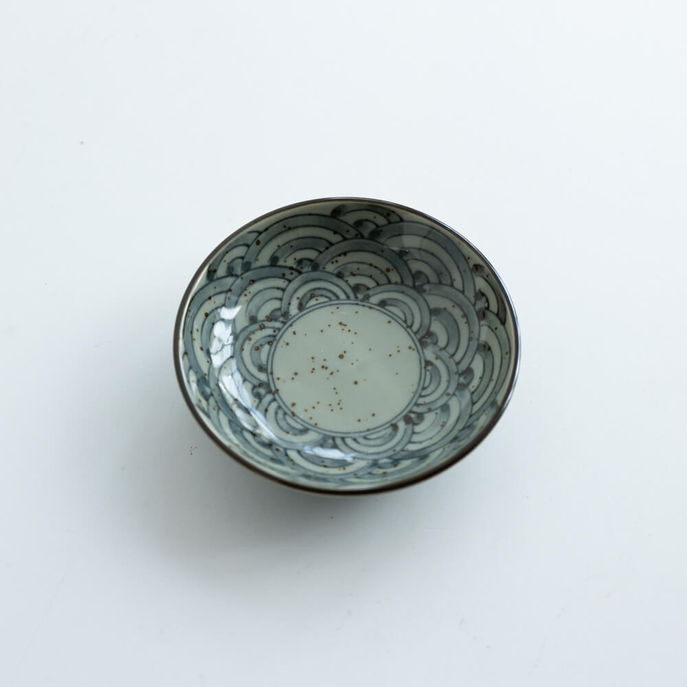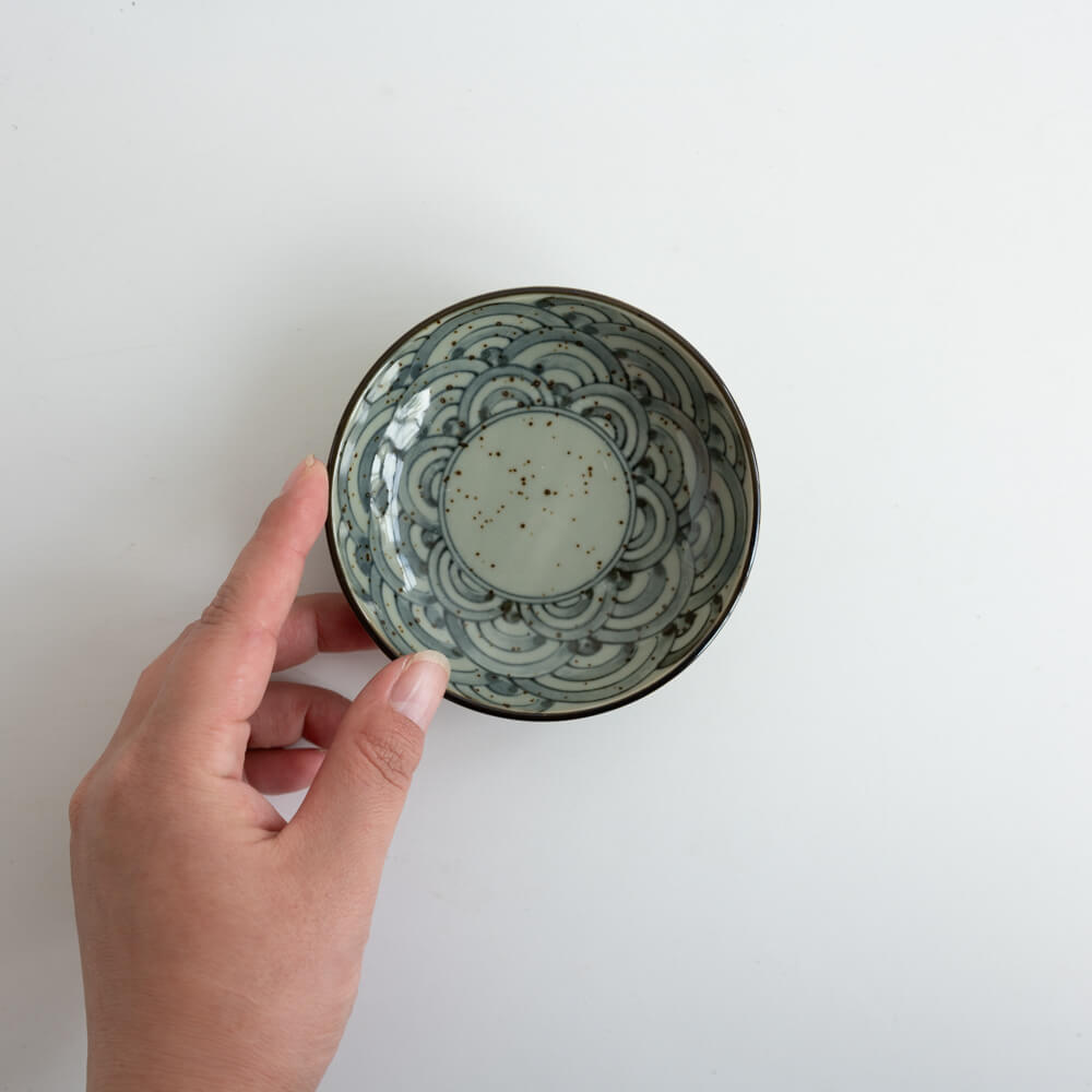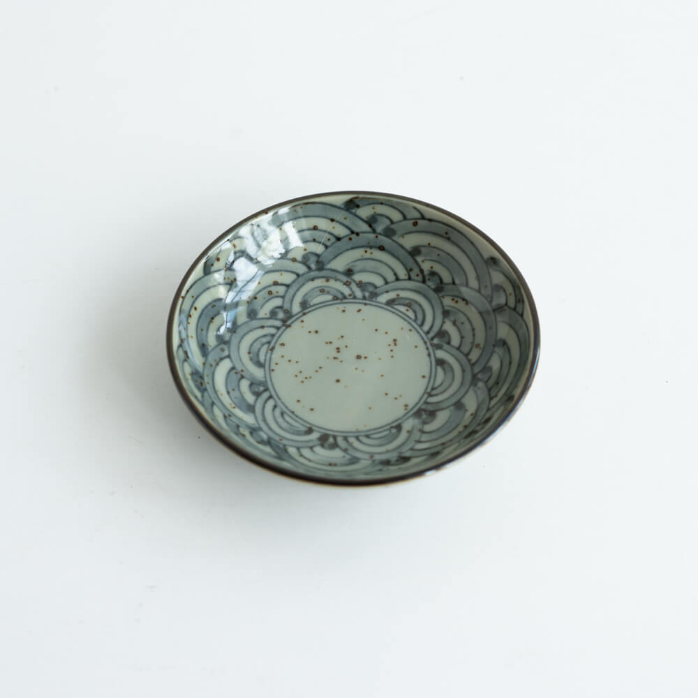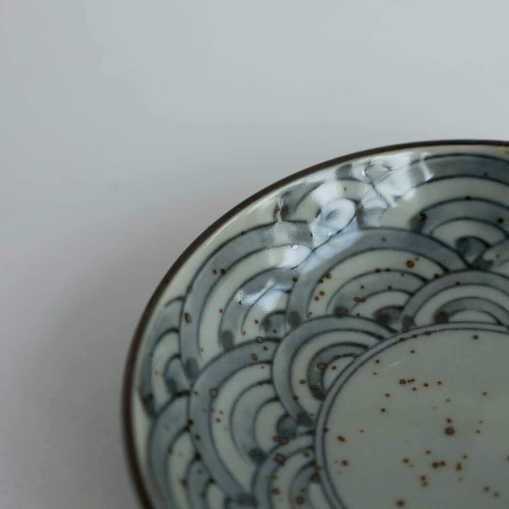 直径約10cmの大きさは、薬味や醤油皿、小さなお菓子皿として最適。いくつか揃えて並べれば、青海波のリズムが食卓に広がります。