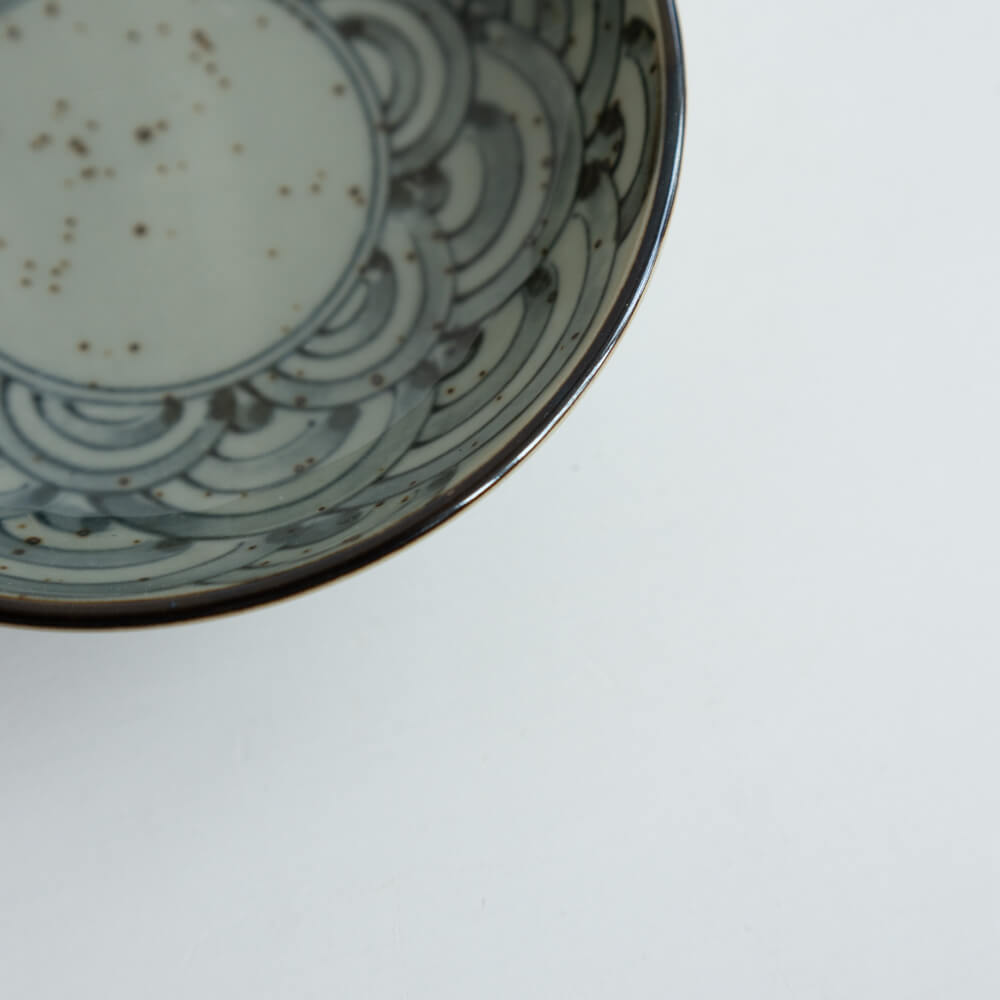 縁に施されたほんのり濃いラインが、器全体をきりりと引き締めています。藍の波模様をより際立たせるアクセントとなり、盛り付けを品よくまとめてくれます。