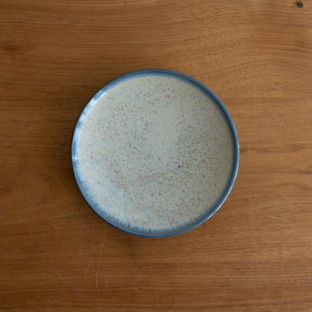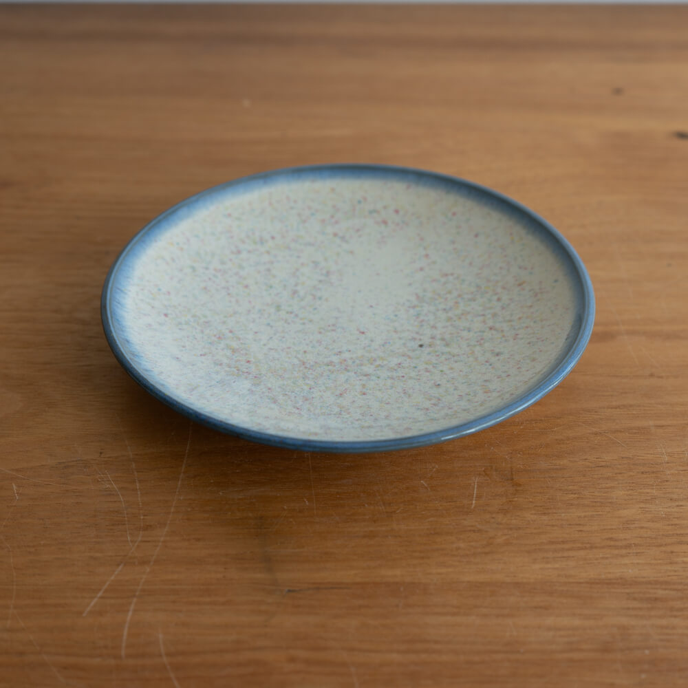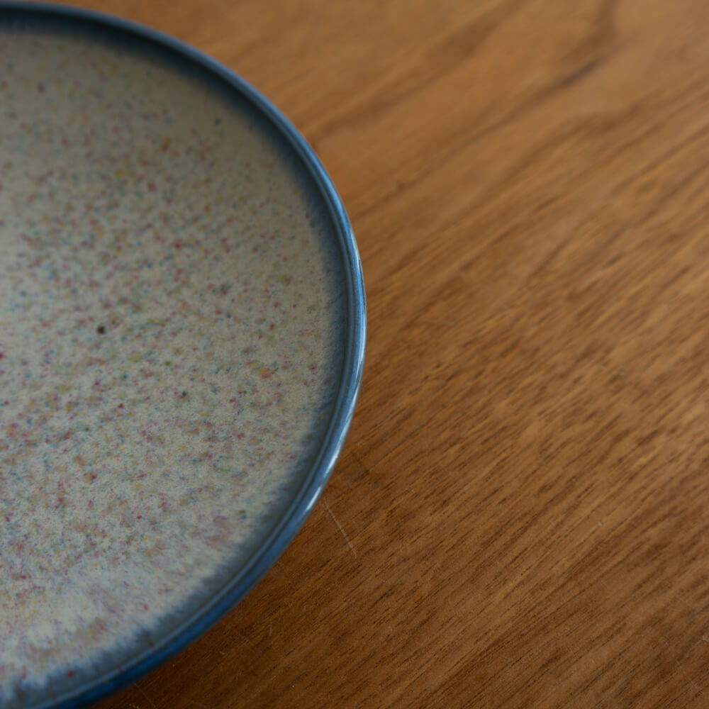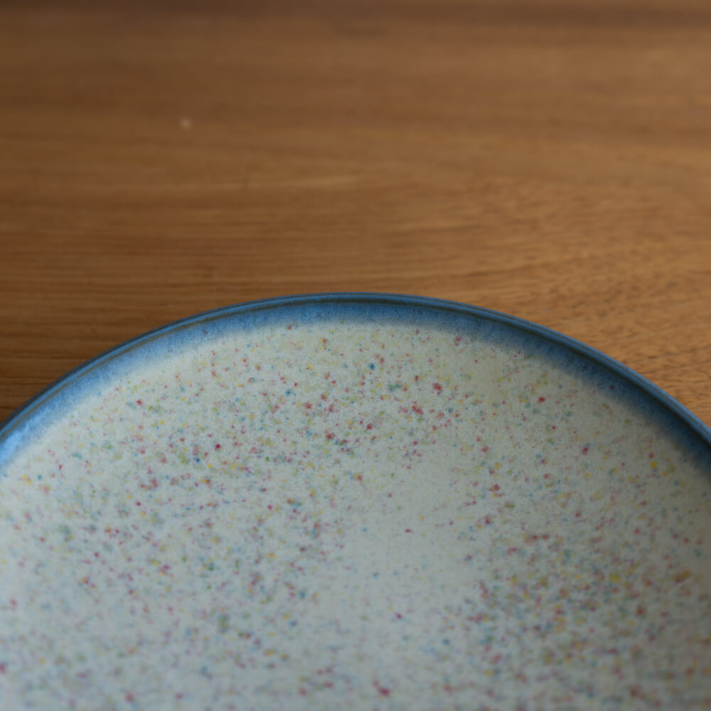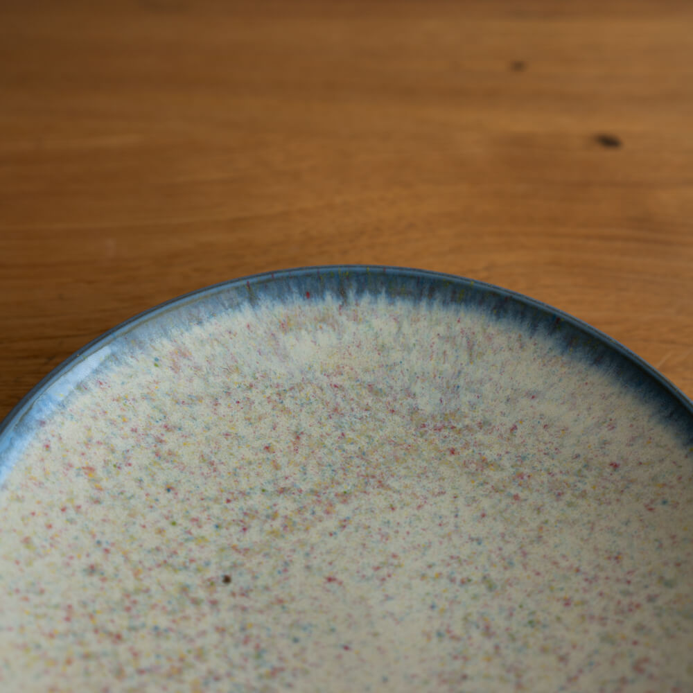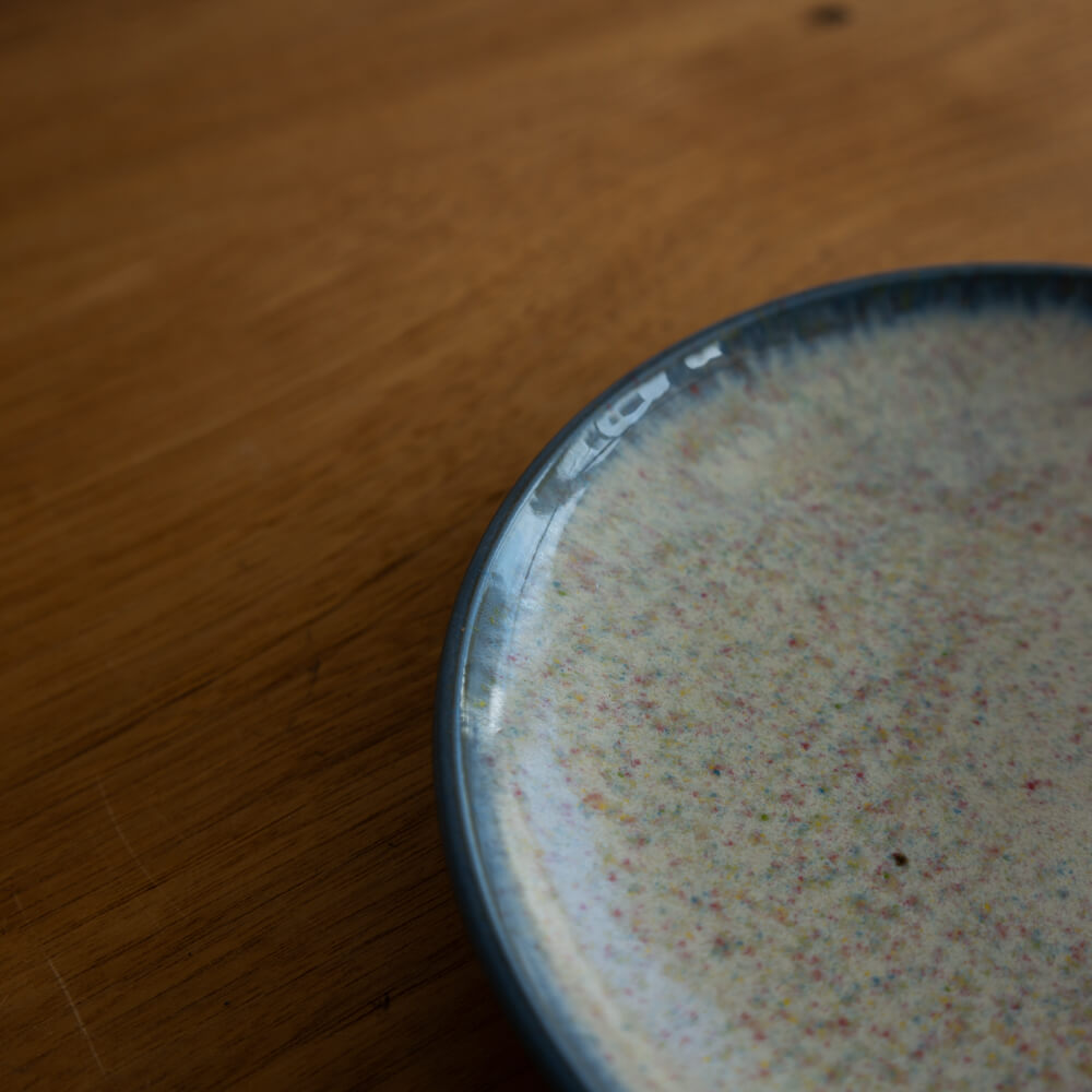 白地に小さな色粒が浮かぶような釉薬の表情。料理をやさしく引き立てながら、光の角度によって表情を変える魅力があります。