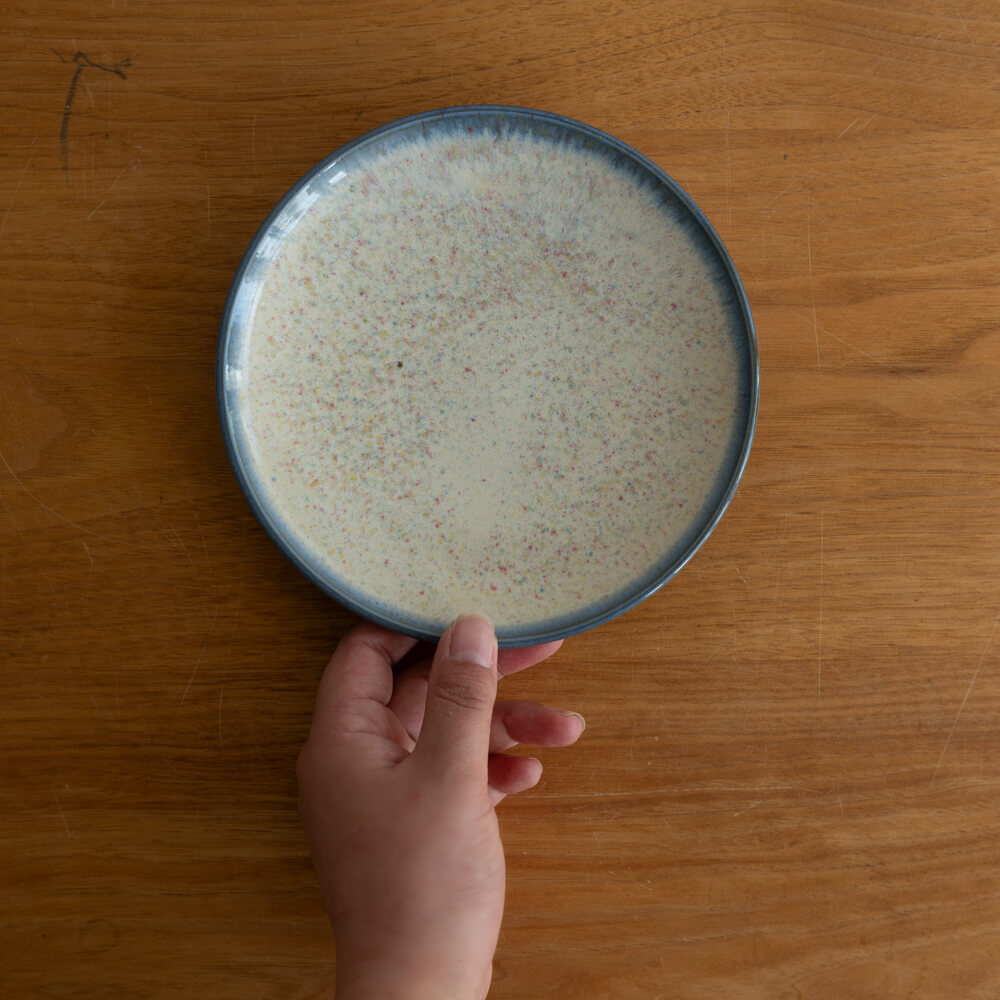 A. 淡い色の粒子と縁のブルーが生み出す、やわらかく優しい雰囲気です。料理をそっと受け止めながら、食卓全体をふんわりと明るくしてくれます。