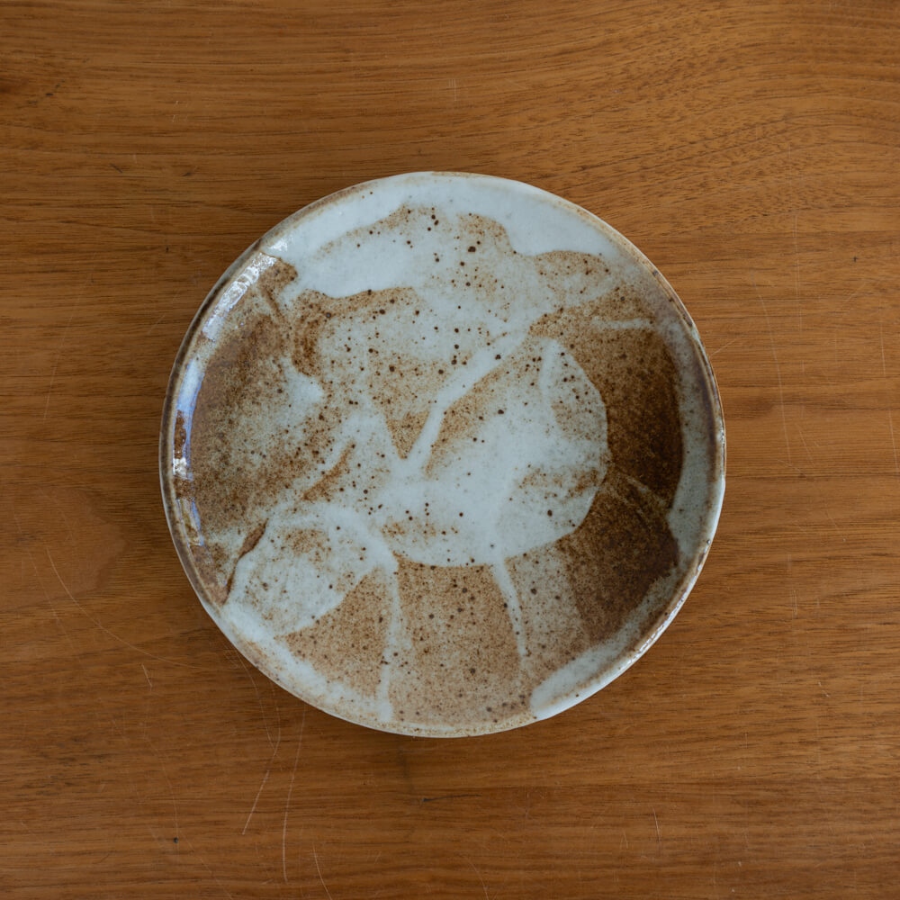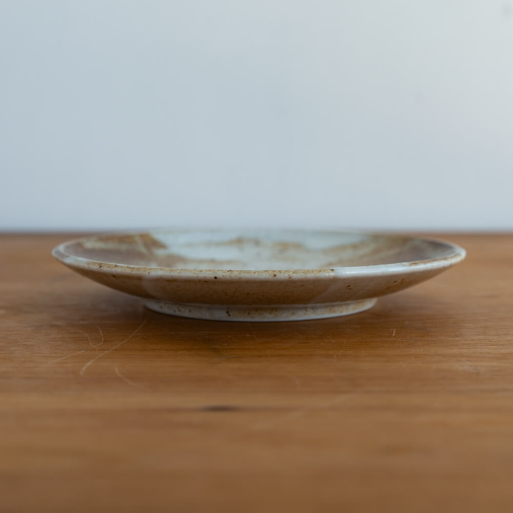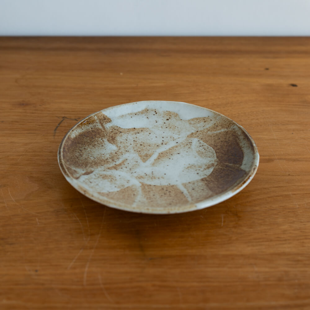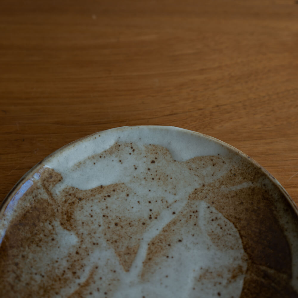 白い釉薬の上に、焦げ茶やベージュがにじむ景色が広がる5寸皿。焼成の中で自然に生まれる模様はひとつとして同じものがなく、日常の食卓に豊かな表情を添えます。和食器の素朴な温かみを楽しめる一枚です。