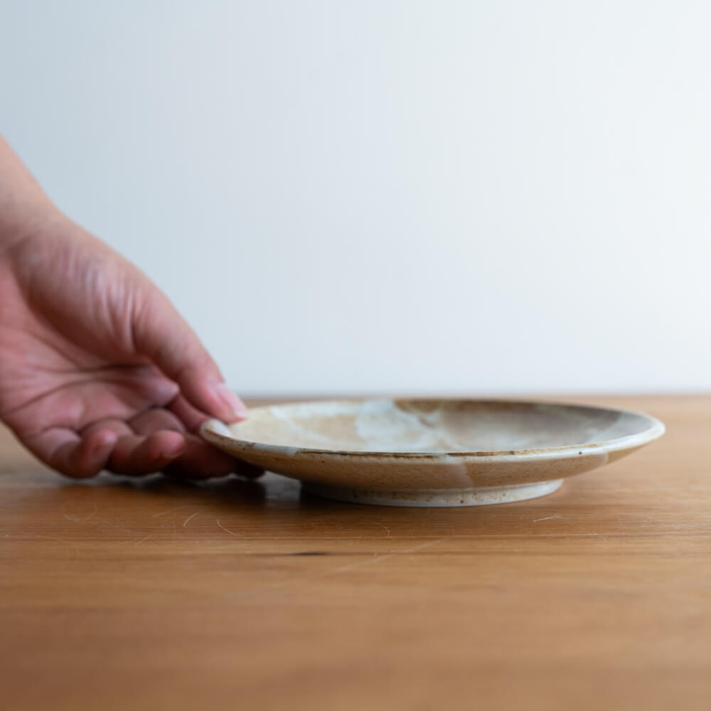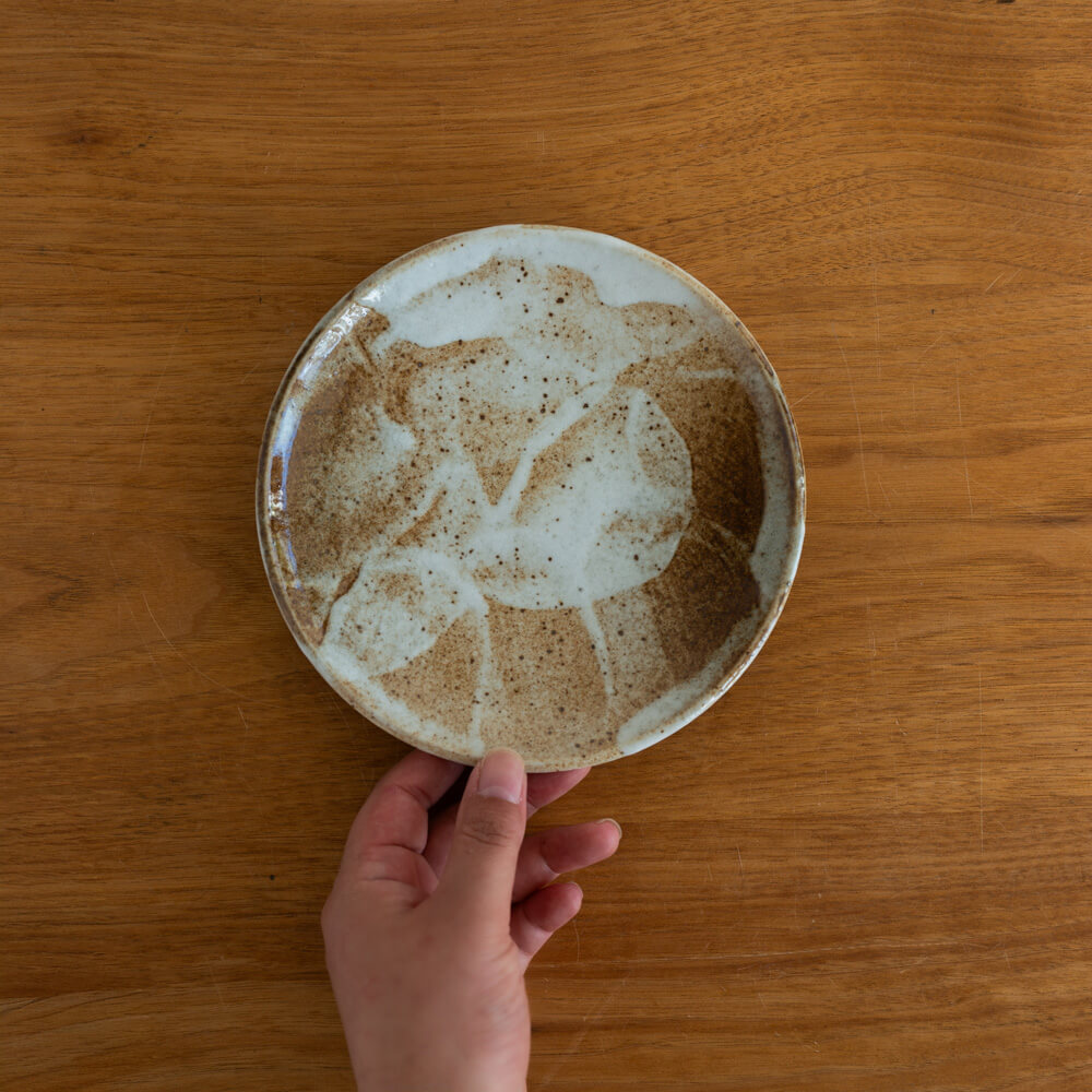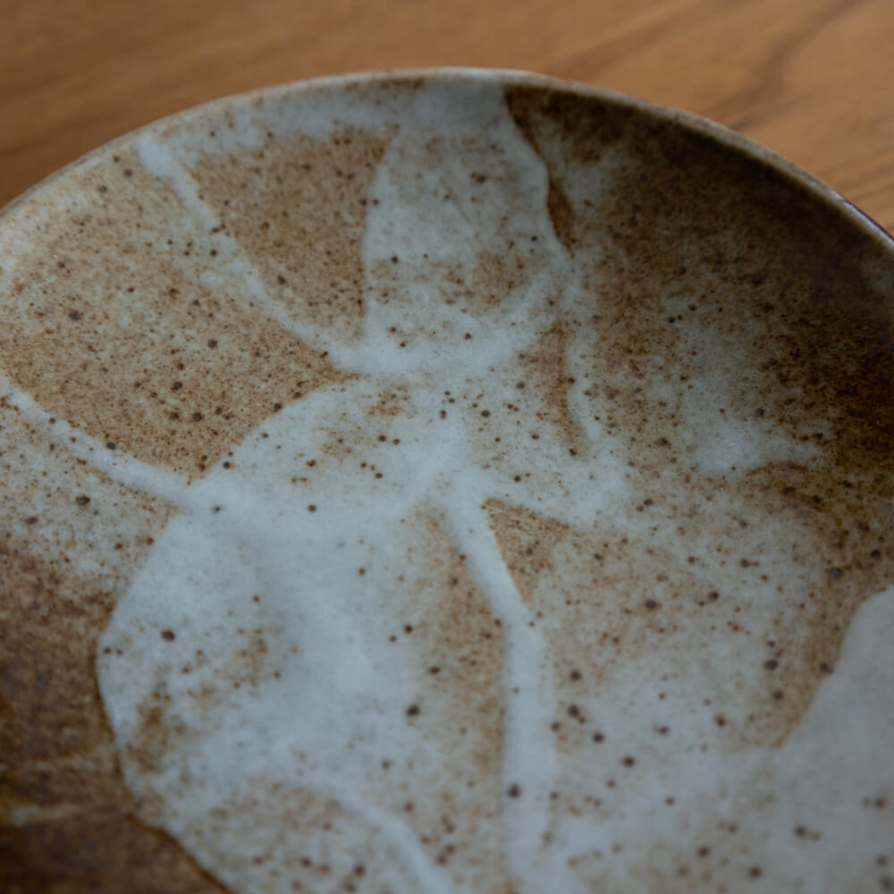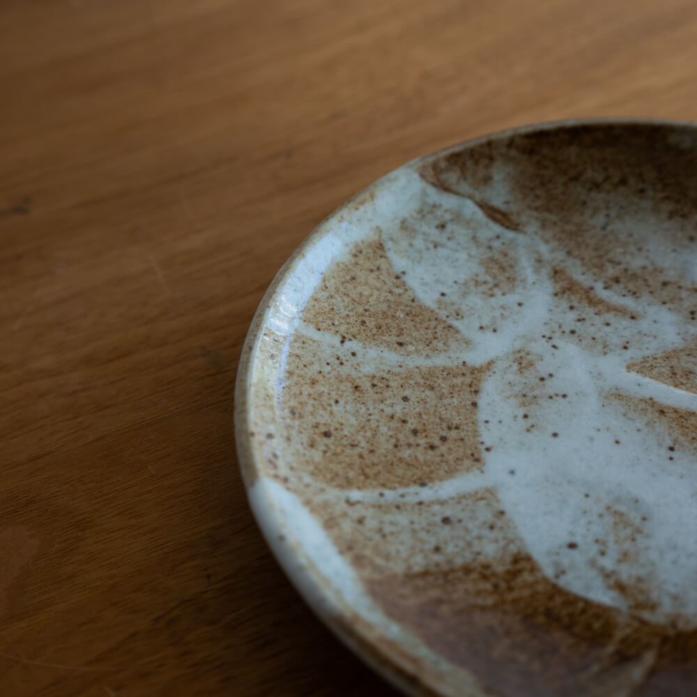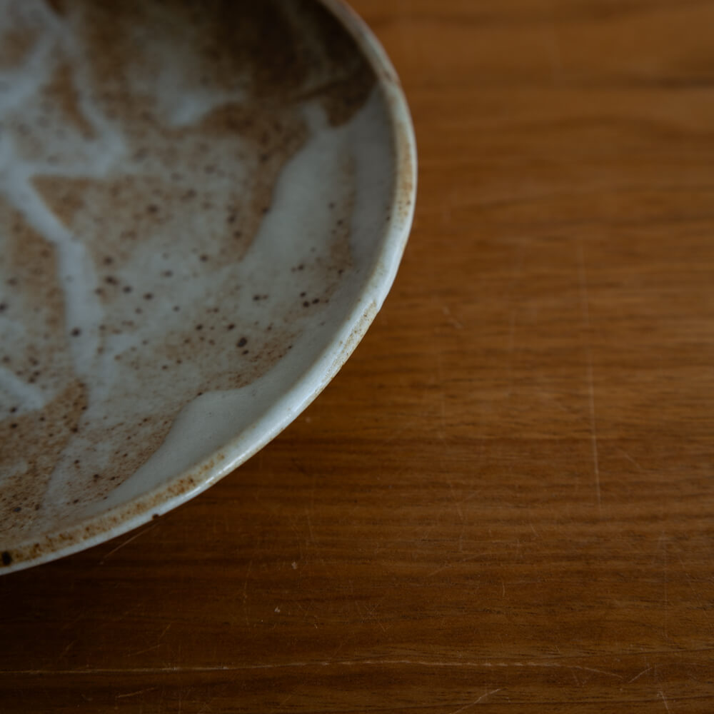 A. 最大の魅力は、ひとつとして同じ景色がない“釉薬の表情”です。白の中に浮かぶ茶やベージュの模様は、焼き上げの瞬間にしか生まれない自然の模様です。どの器も世界に一枚だけの風景を持ち、食卓に取り入れるたびに新しい発見や楽しみを与えてくれます。さらに、5寸という扱いやすいサイズ感も日常に寄り添い、毎日使いたくなるポイントです。