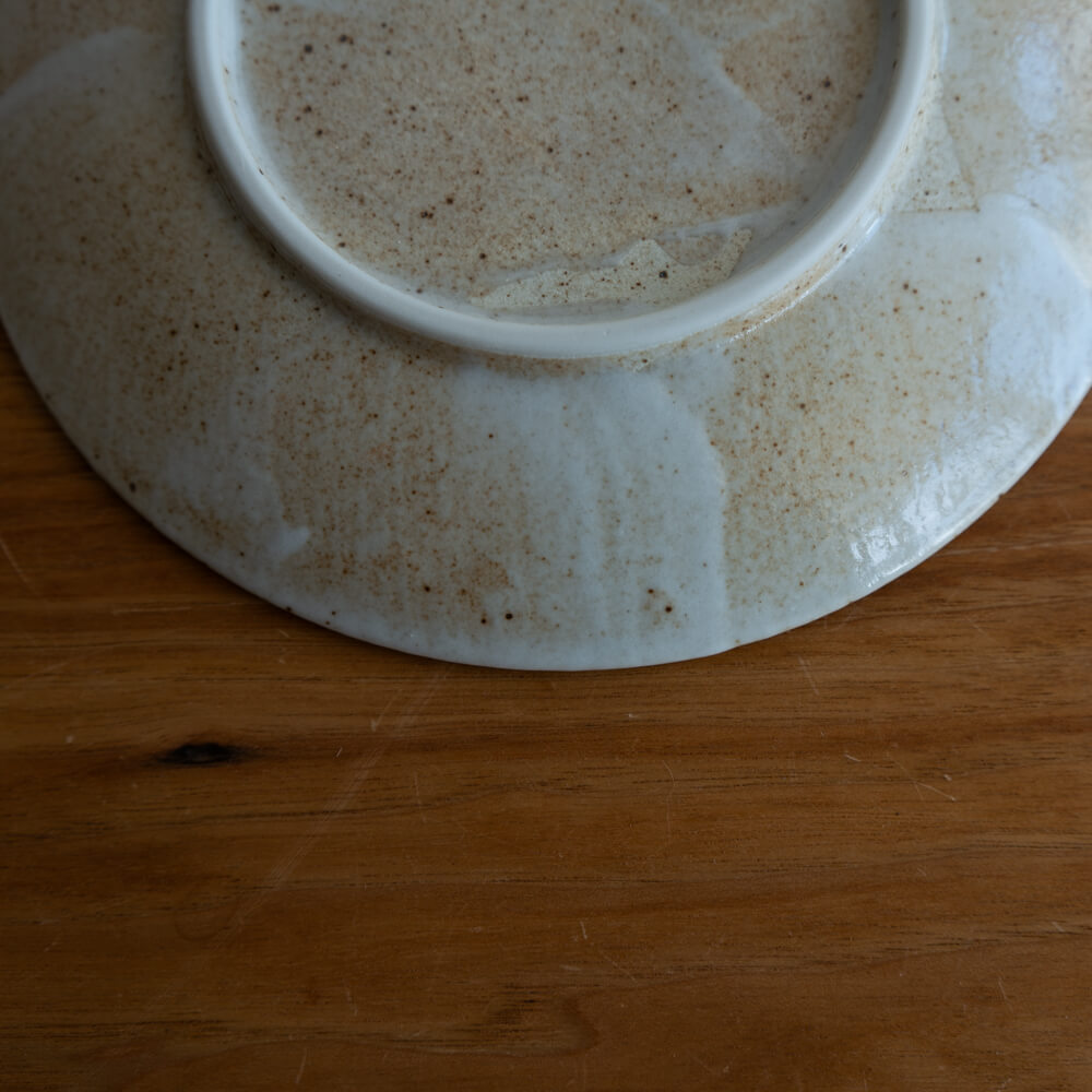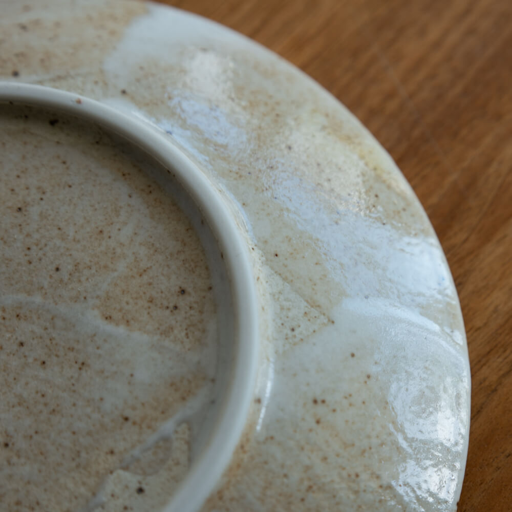釉薬が溶け合い、まるで雪解けのような白と土の色が混ざり合う景色。自然が描いたような模様が、料理をやさしく引き立てます。