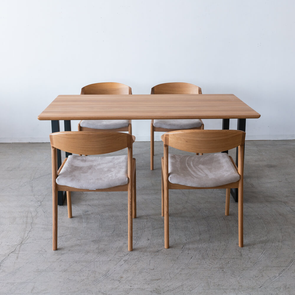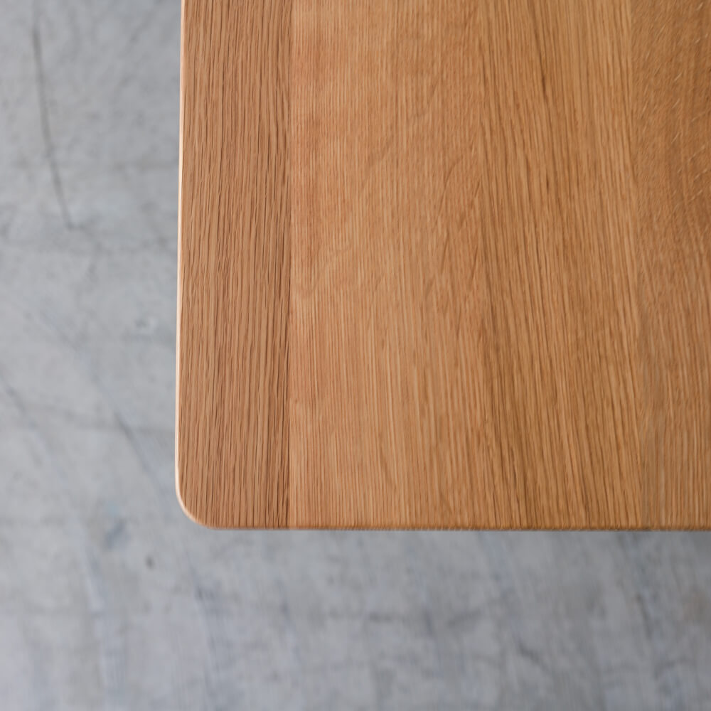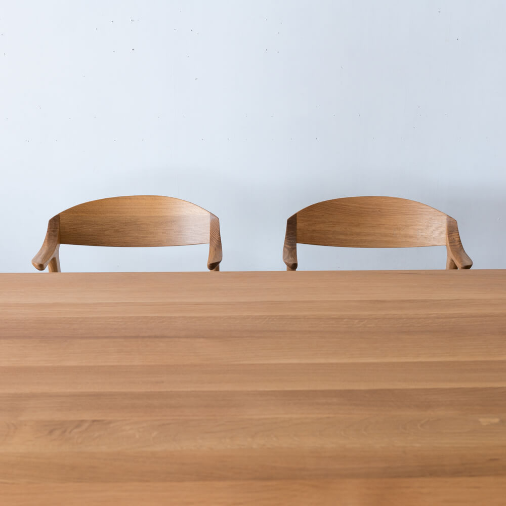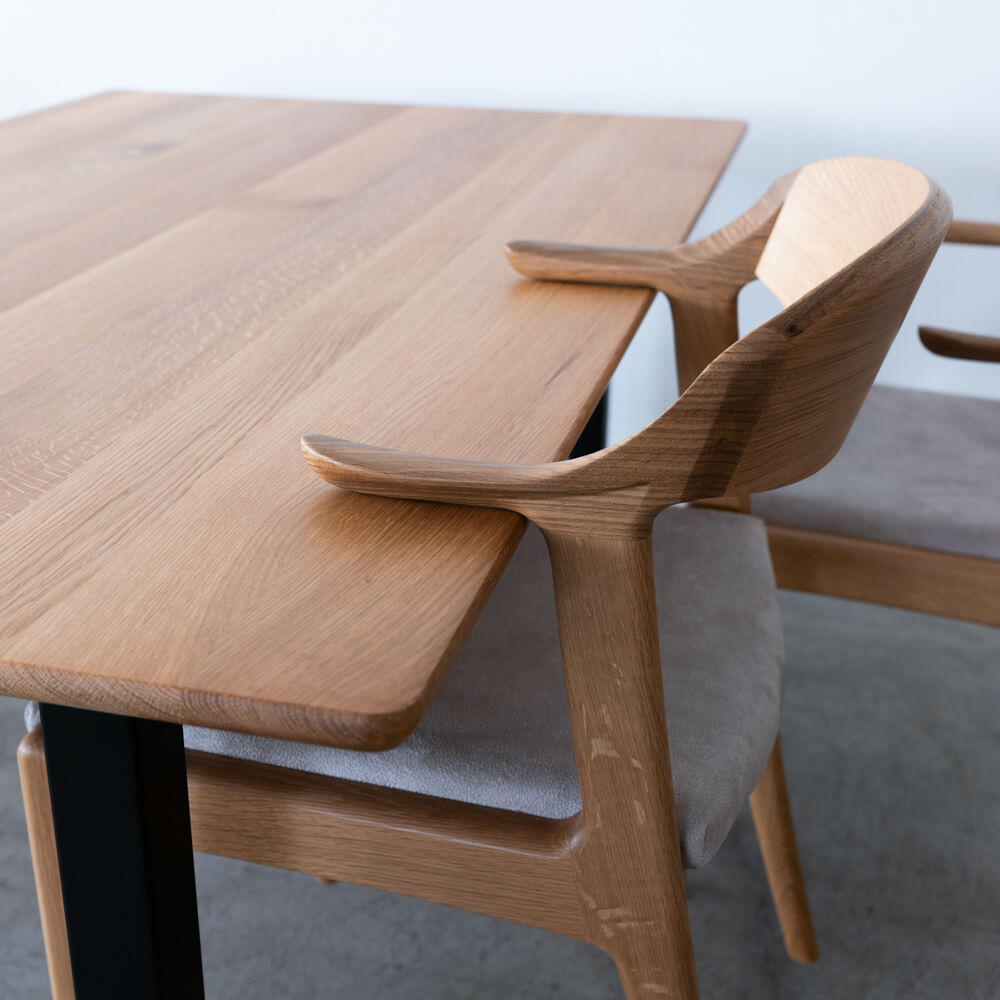 テーブルとチェアに使用されたホワイトオークは、堅牢でありながら木目が美しく、経年によって味わいが深まる素材です。ウレタン塗装を施すことで、日常使いの汚れや水分から守りつつ、自然な木肌の風合いを活かしています。