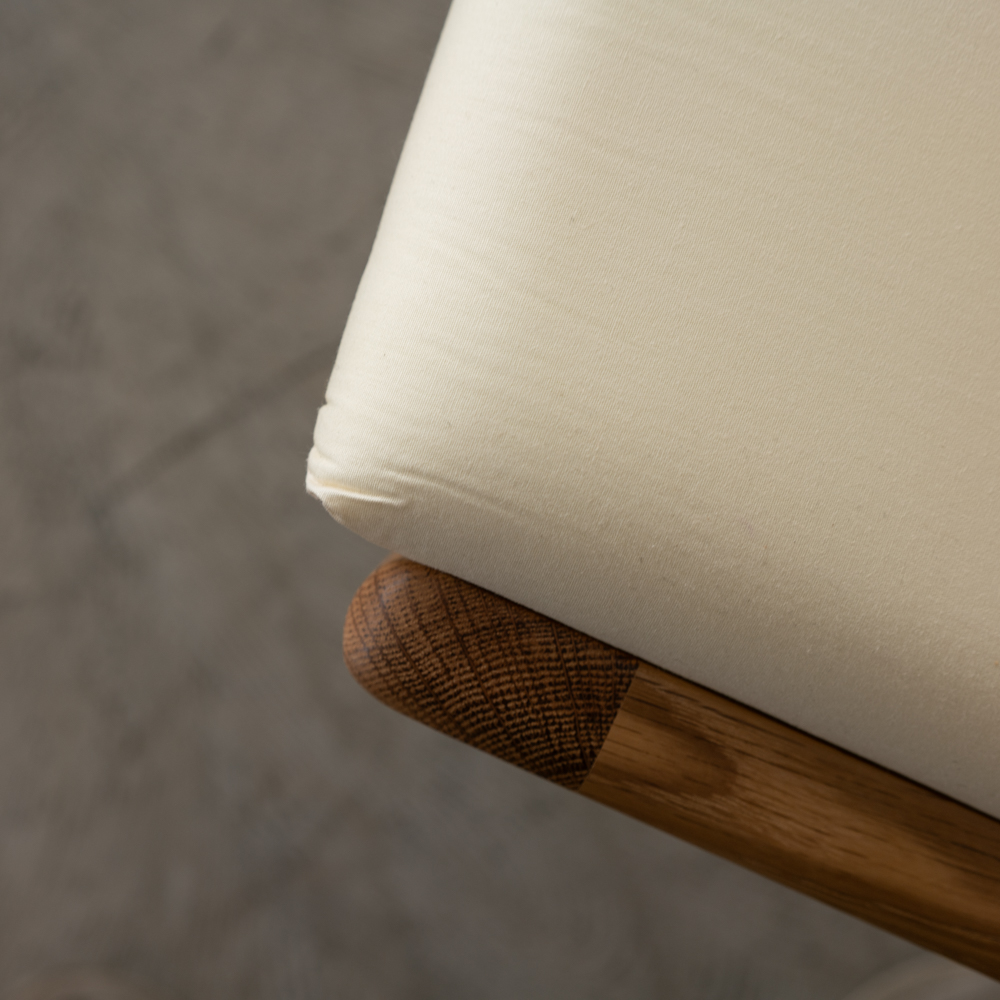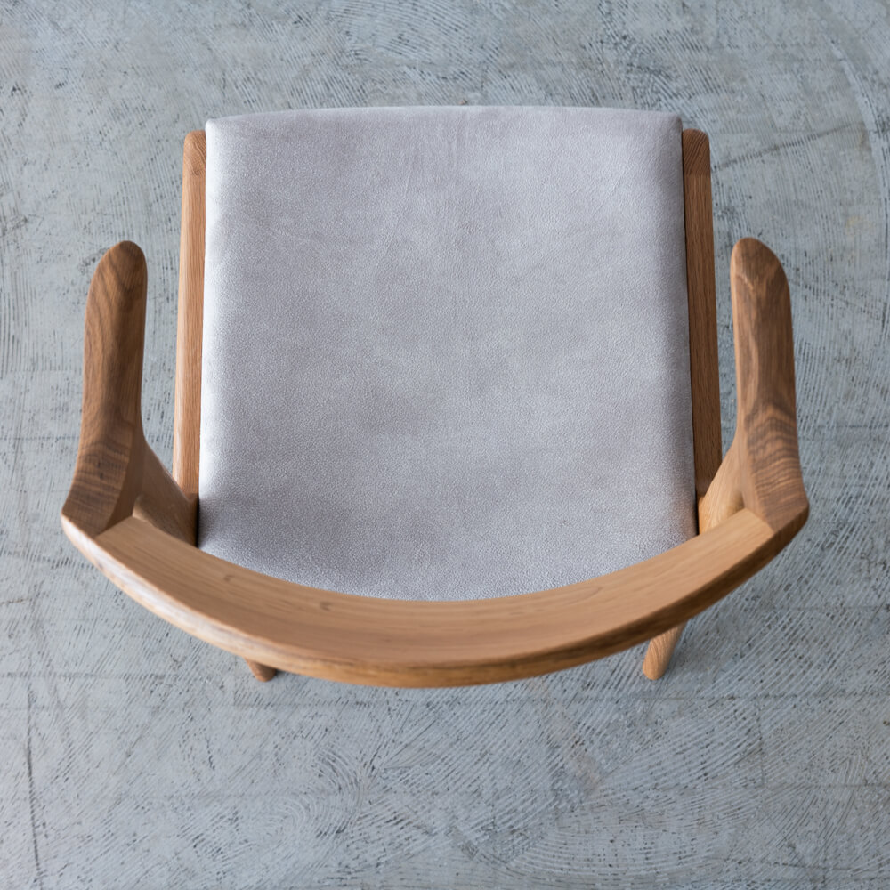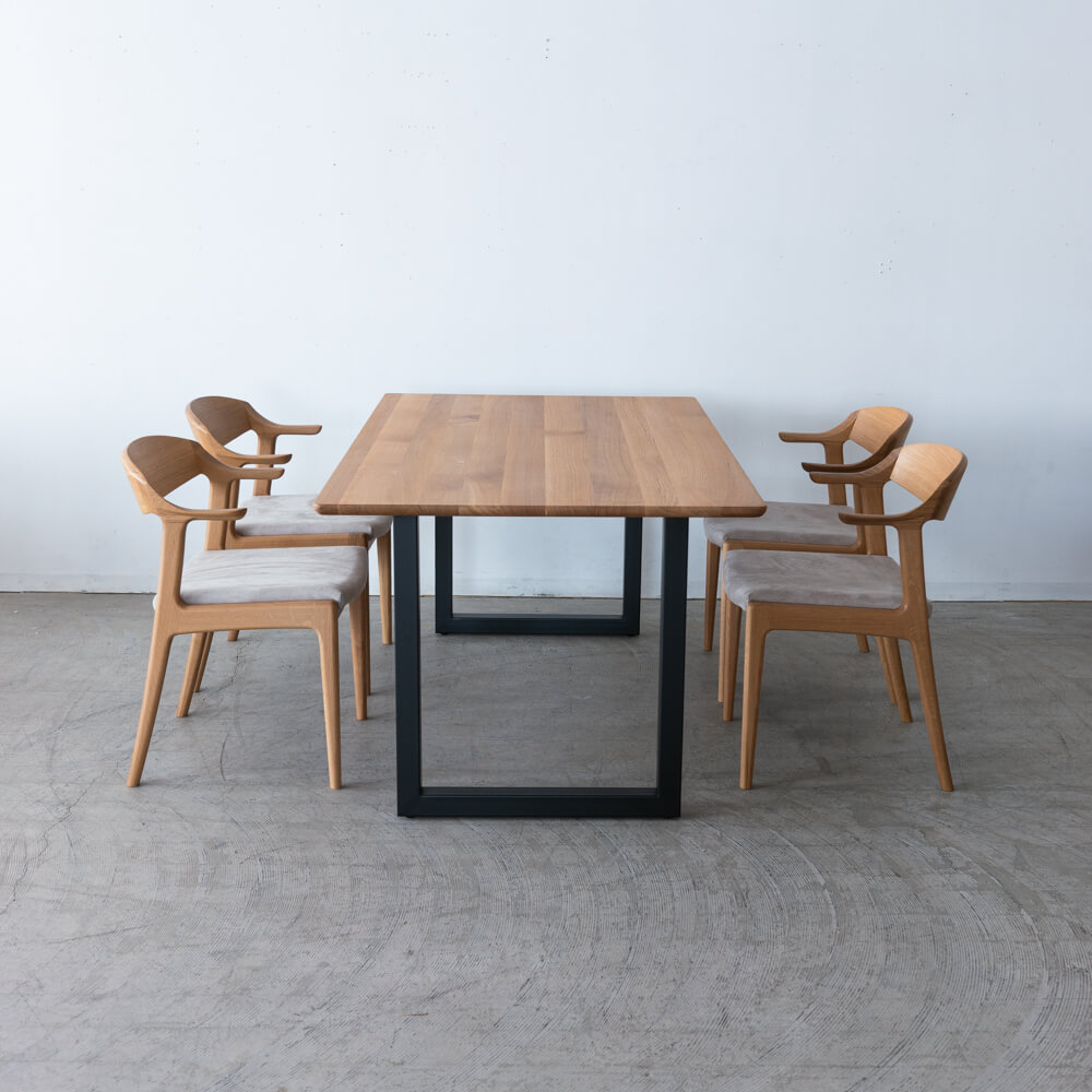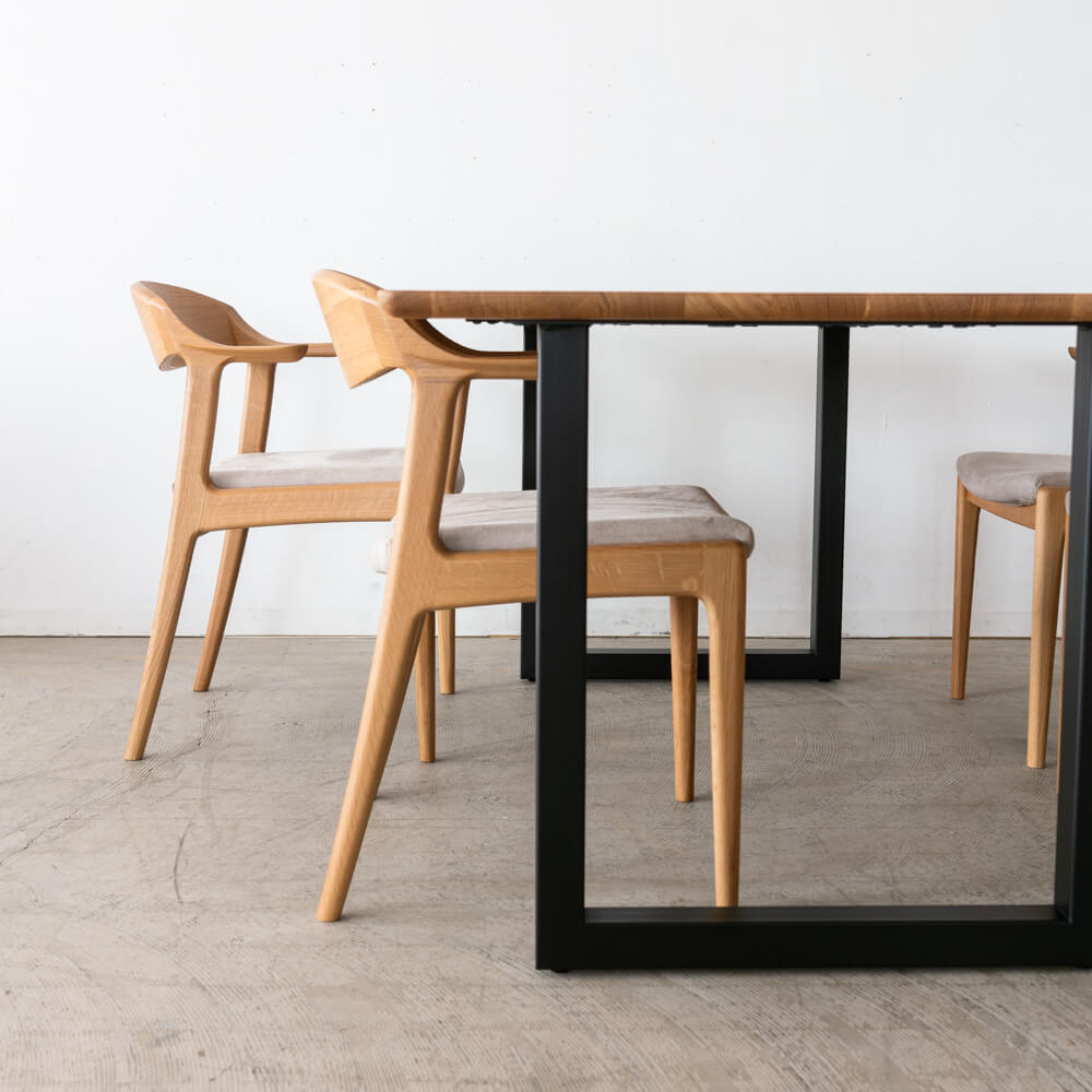 テーブルとチェアに使用されたホワイトオークは、堅牢でありながら木目が美しく、経年によって味わいが深まる素材です。ウレタン塗装を施すことで、日常使いの汚れや水分から守りつつ、自然な木肌の風合いを活かしています。