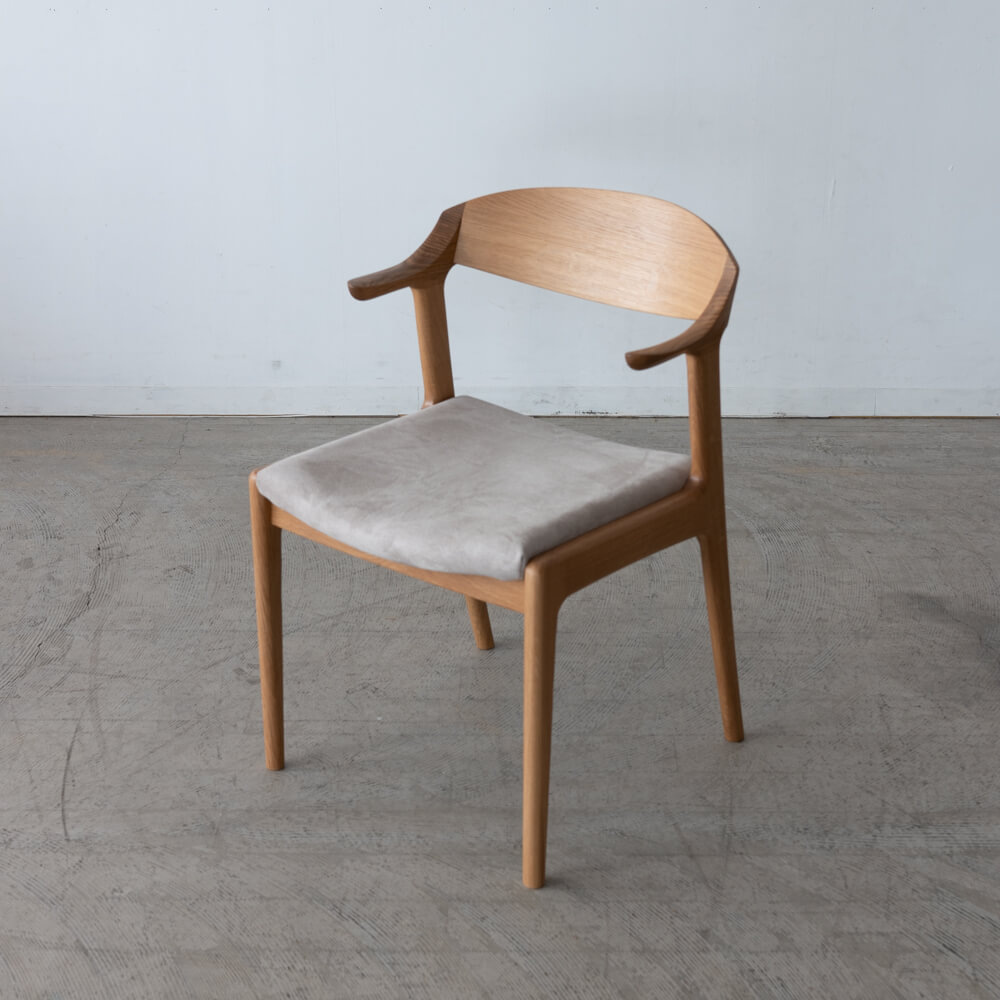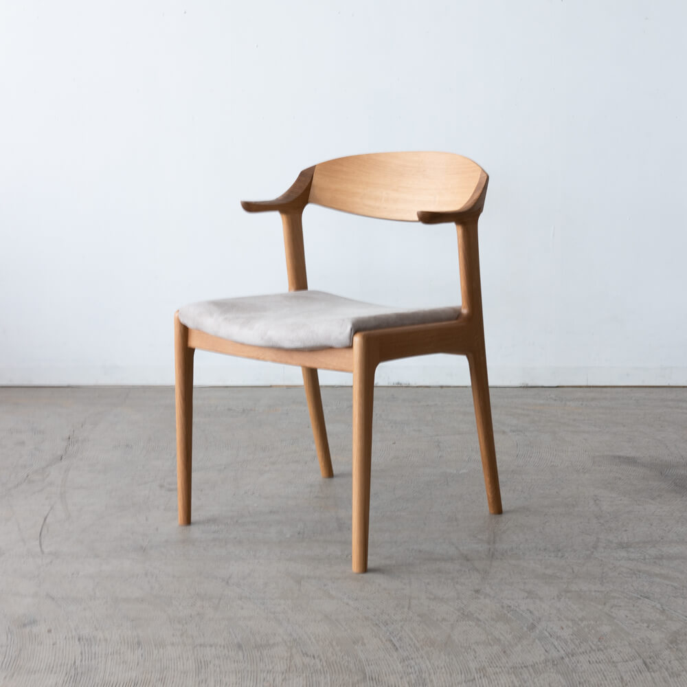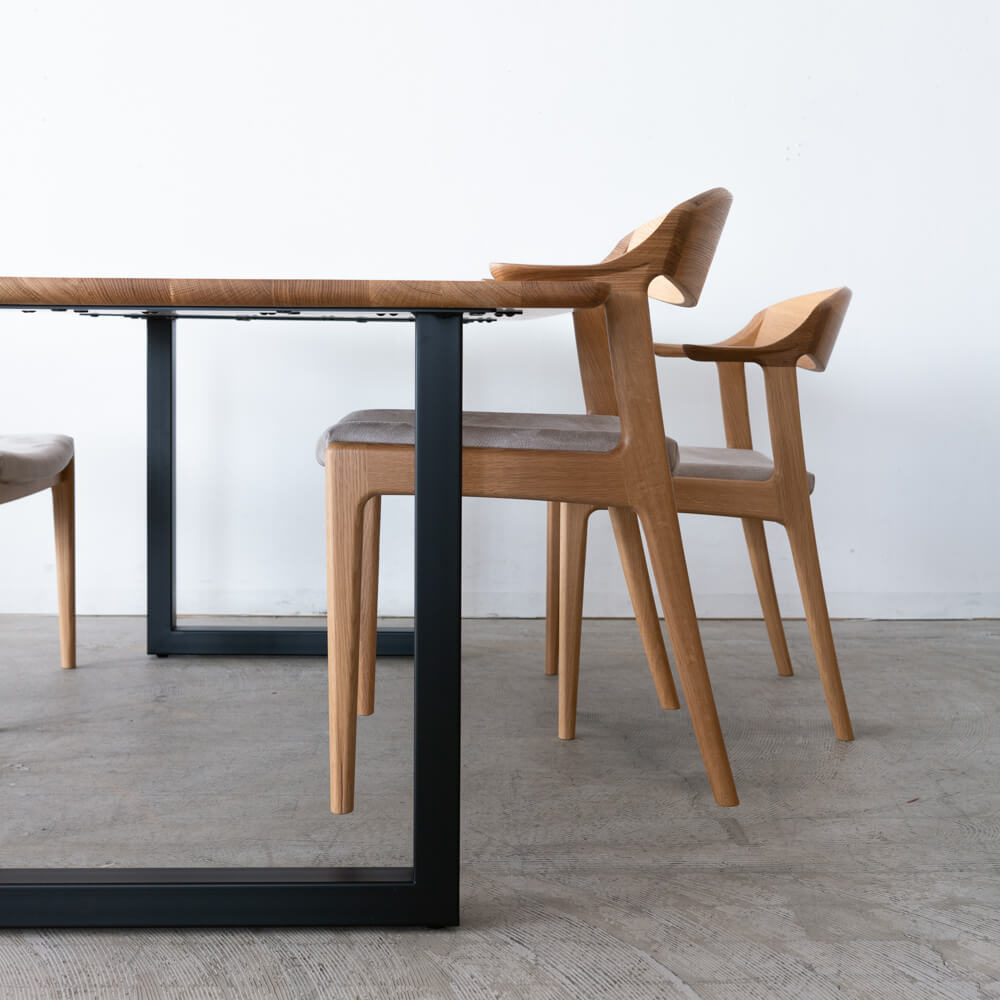 チェアの背とアームは、木の流れを活かしたなめらかな曲線。体を優しく支え、長時間の食事や団らんも快適です。