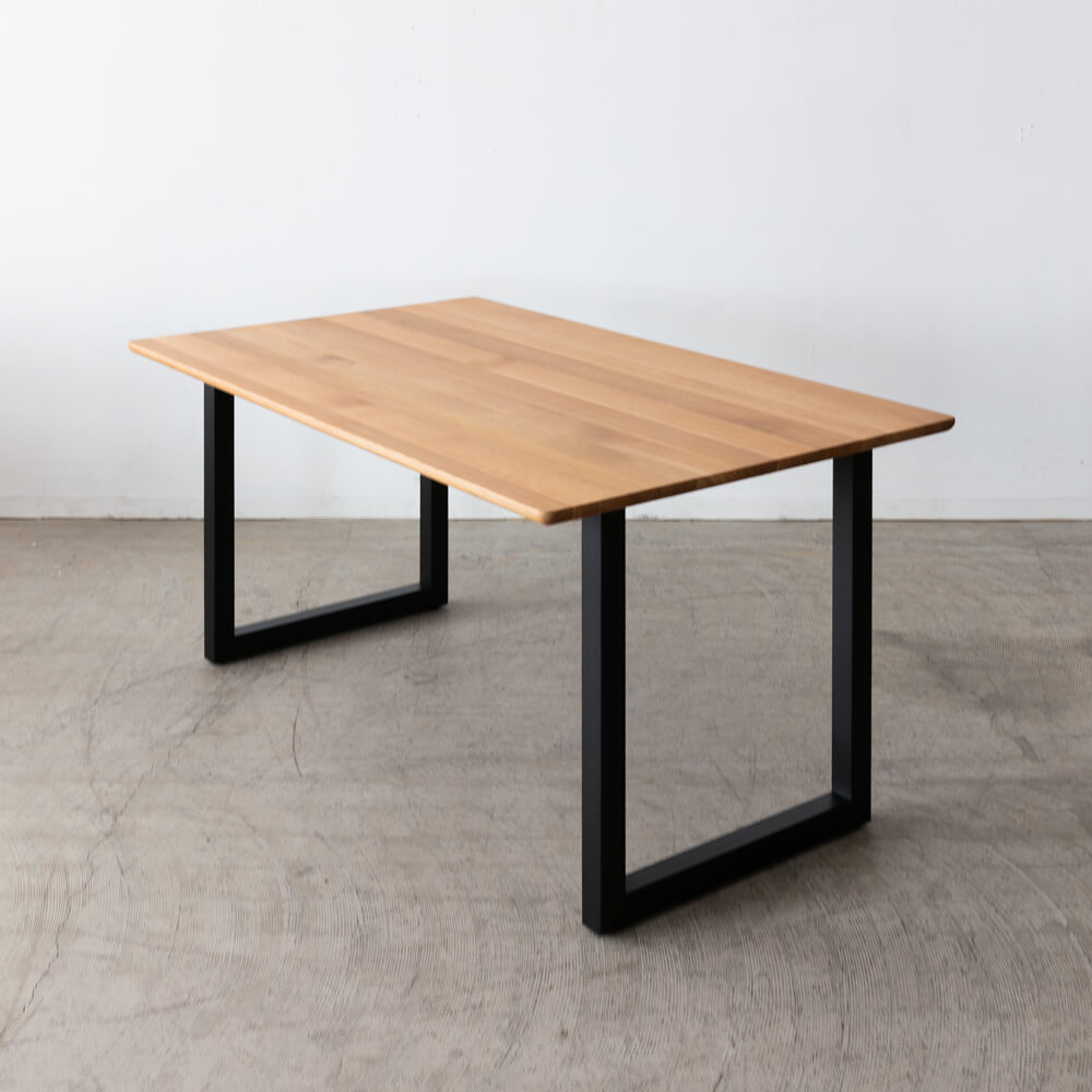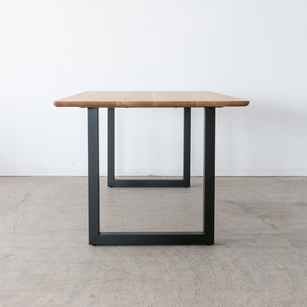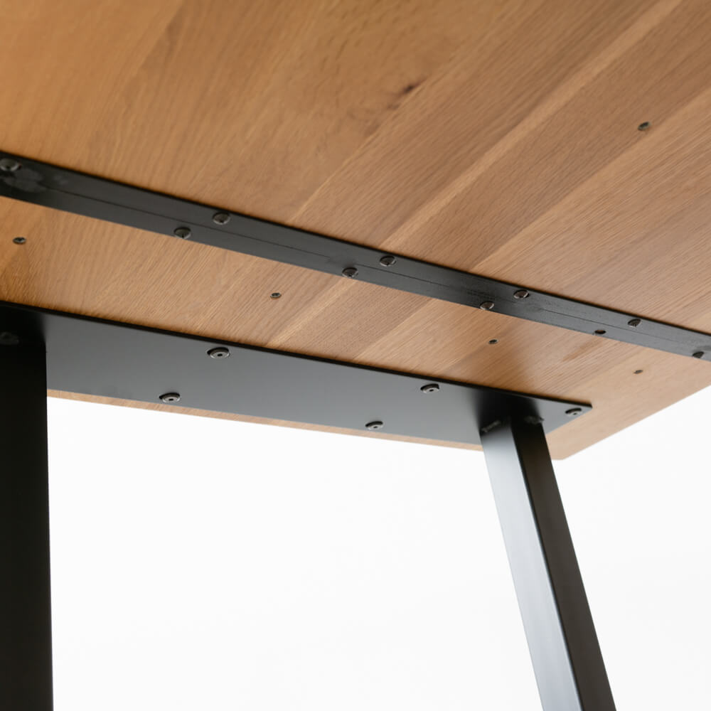 テーブルの脚はスチール素材を採用。メラミン焼付塗装により耐久性を高め、直線的でシャープなシルエットが木の天板を引き立てます。ナチュラルとモダンが調和したデザインは、幅広いインテリアに馴染みます。