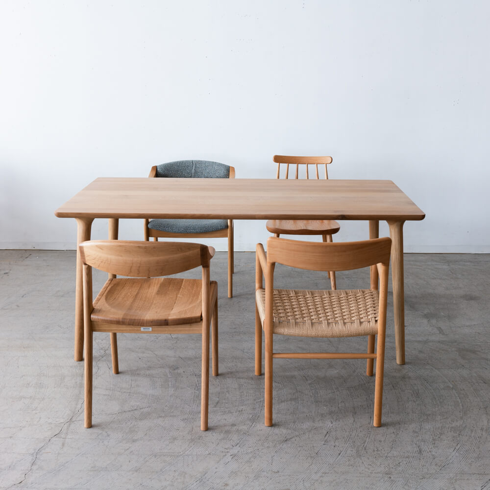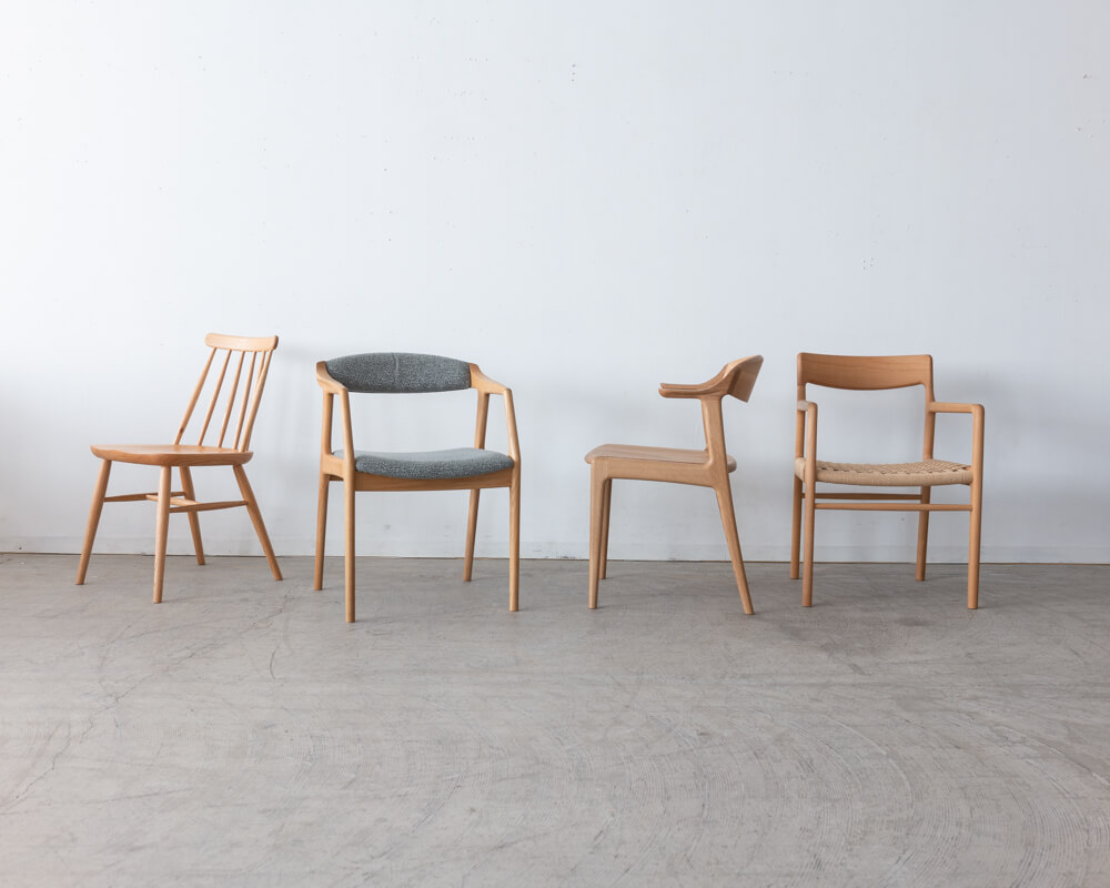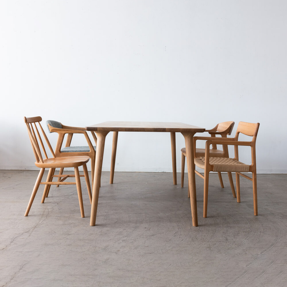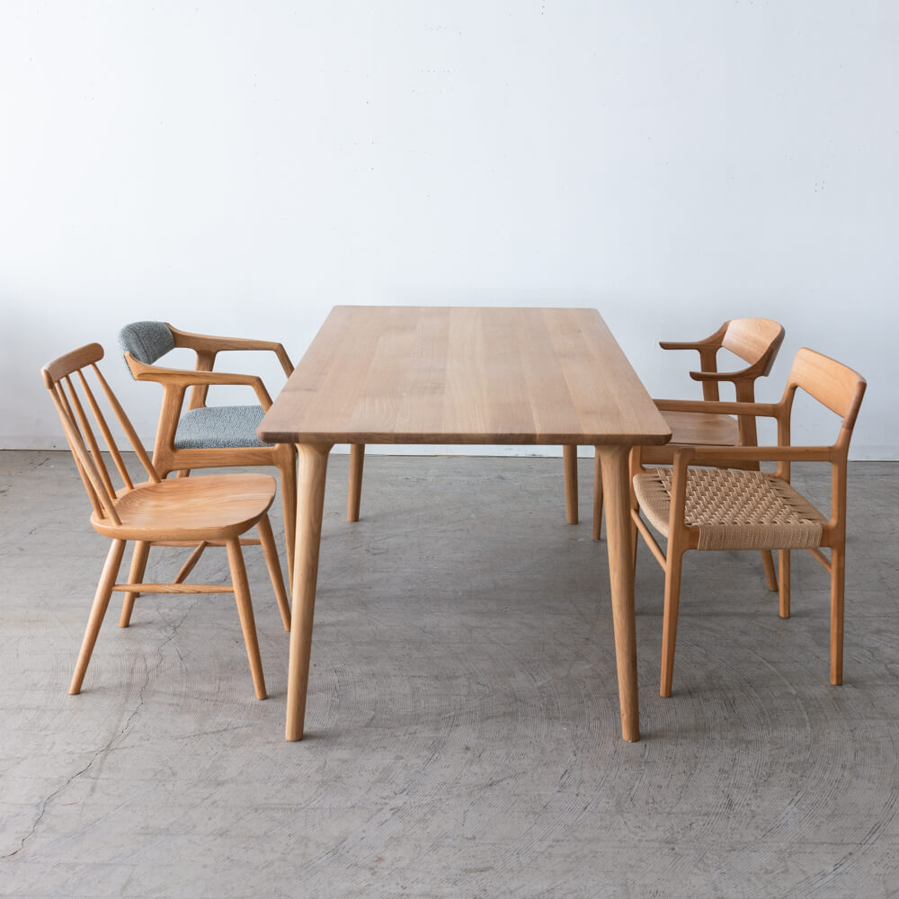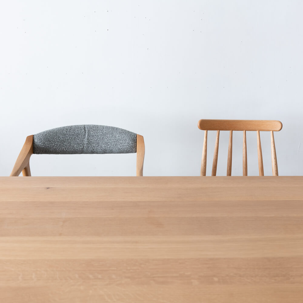 オイル仕上げの自然な温もり、ウレタン仕上げの扱いやすさ、板座の凛とした木の質感、張座の柔らかな座り心地。それぞれの個性が響き合い、バランスよく調和します。