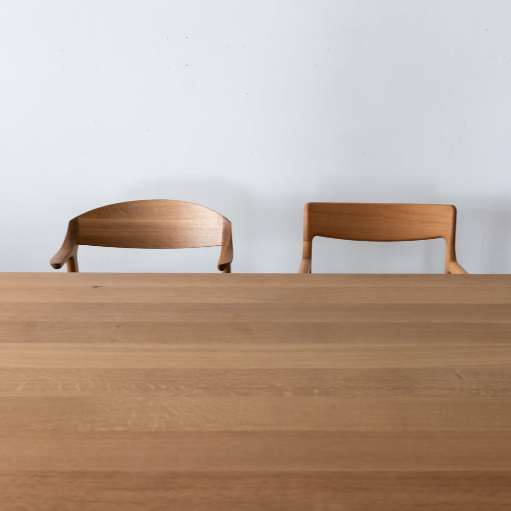 ホワイトオーク無垢材を贅沢に使用した「BRIDGE ダイニングテーブル」。柾目を中心に板目も織り交ぜた天板は自然な表情を持ち、30mmの厚みが安心感を与えます。オイル仕上げによって木の呼吸を妨げず、使い込むほどに深みある飴色へ。鉄の反り止めを備え、長く安定してお使いいただけます。