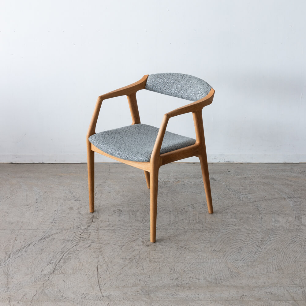 肘から背までを無垢材で一体成形。背の布張りが柔らかく体を支え、デザイン性と快適性を兼ね備えています。