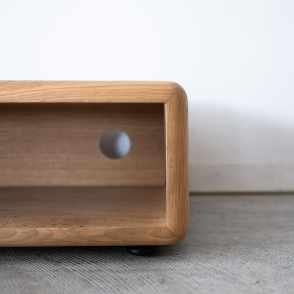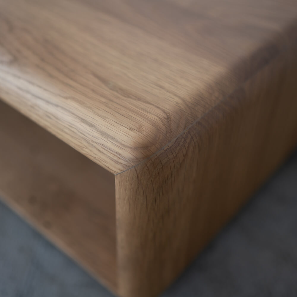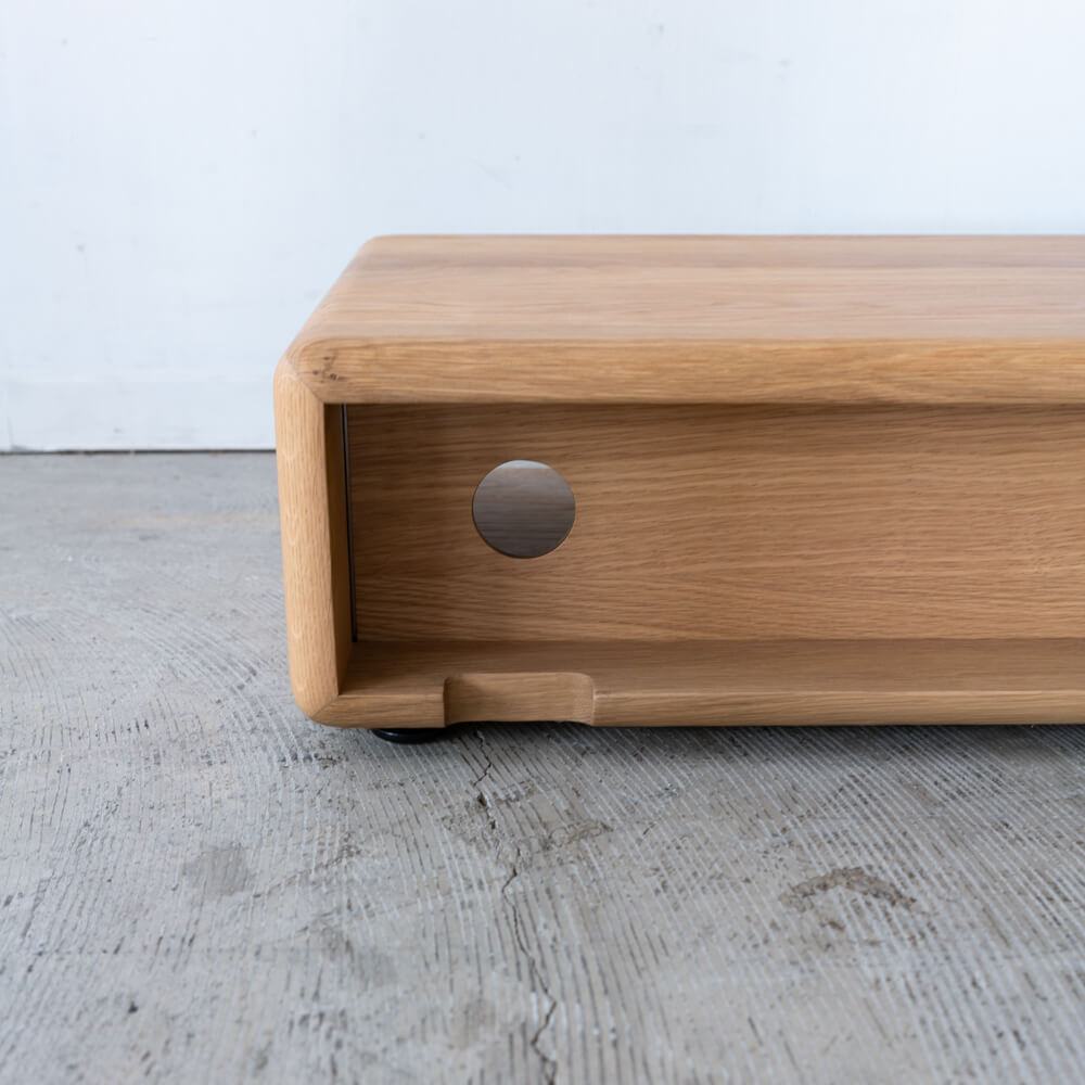 無垢のホワイトオーク材を使用。オイル仕上げによって木の呼吸を妨げず、豊かな木目と自然な色合いがそのまま引き立ちます。経年とともに艶やかさを増し、家具としての味わいが深まります。