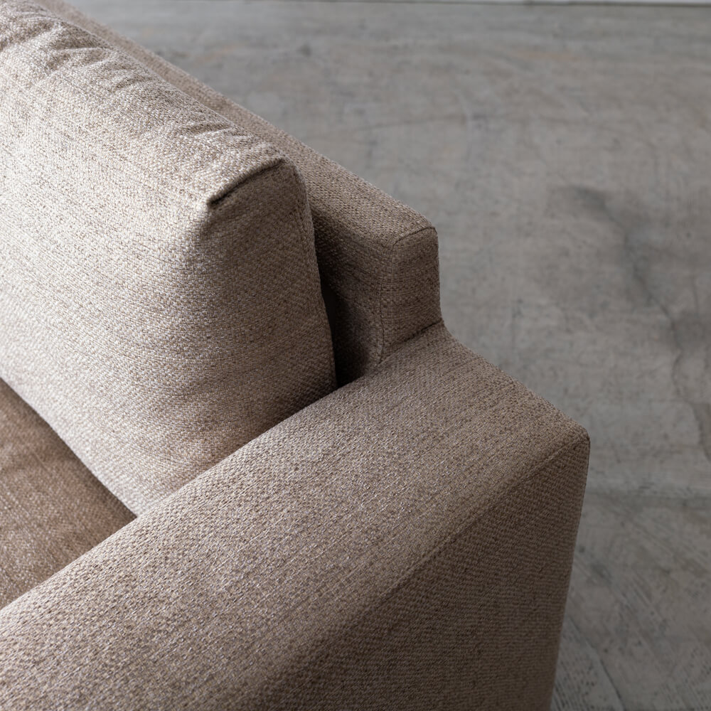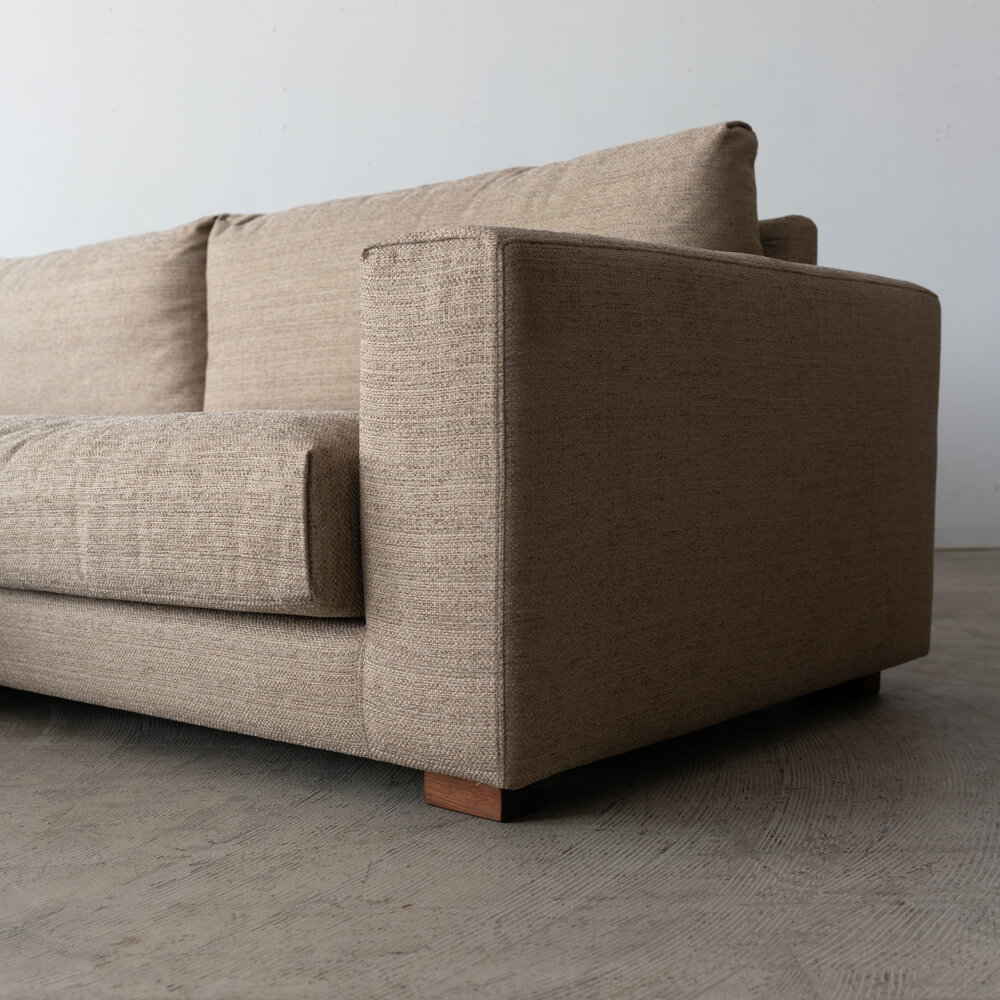 幅広の肘掛けとロータイプの背もたれがつくる、洗練された直線的デザイン。シンプルでありながらも存在感があり、都会的なリビングから和モダンまで幅広くフィットします。空間をすっきり見せる効果も魅力です。