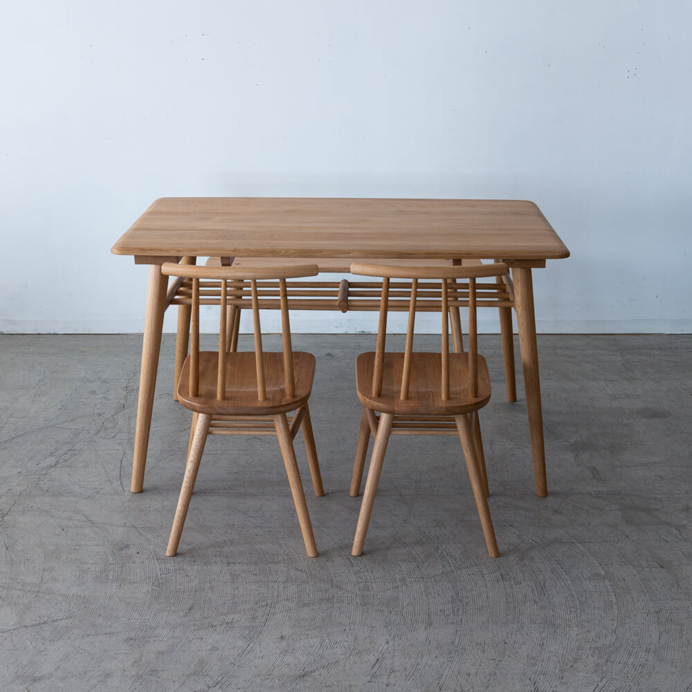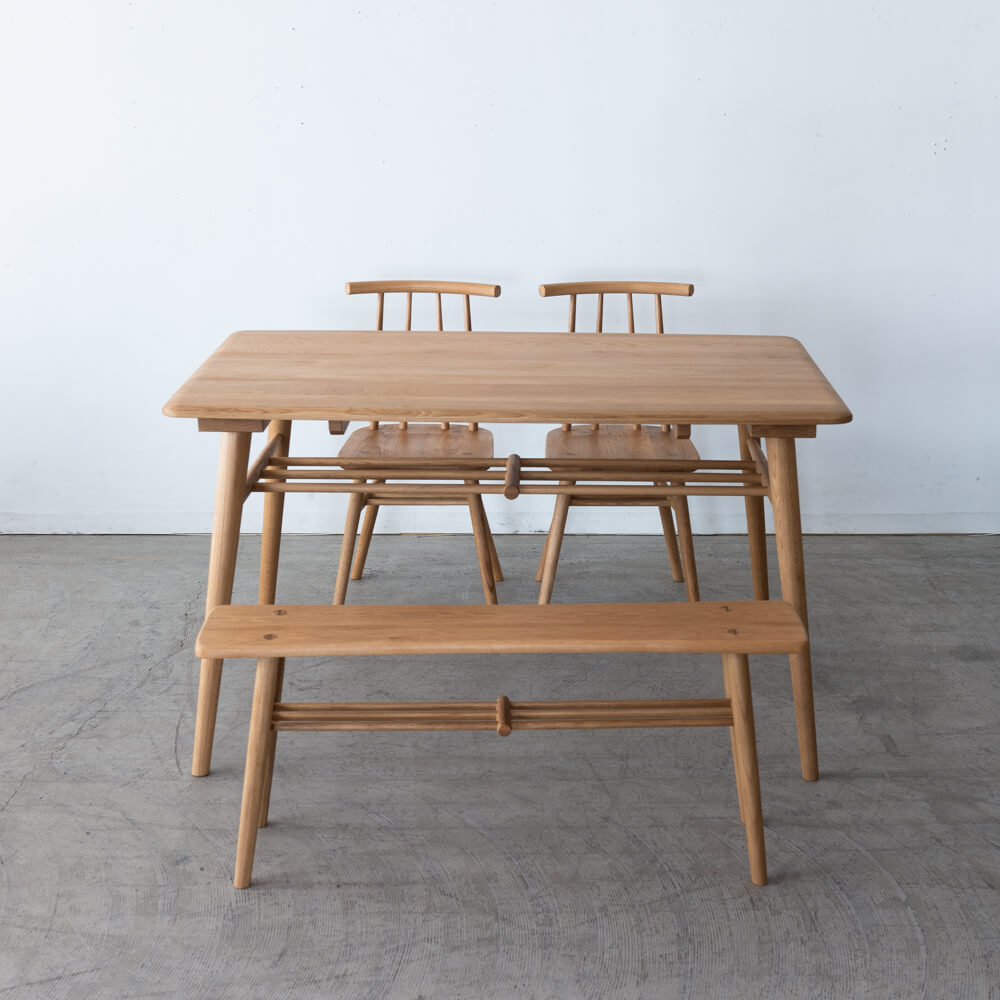 テーブルは幅125cmと、4人でゆったり囲めるサイズ。チェア2脚とベンチの組み合わせは省スペース性に優れ、リビングダイニングに軽快なリズムを生み出します。