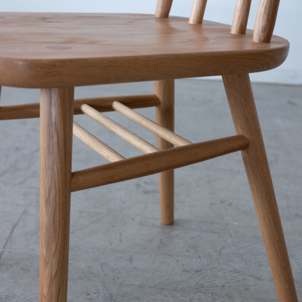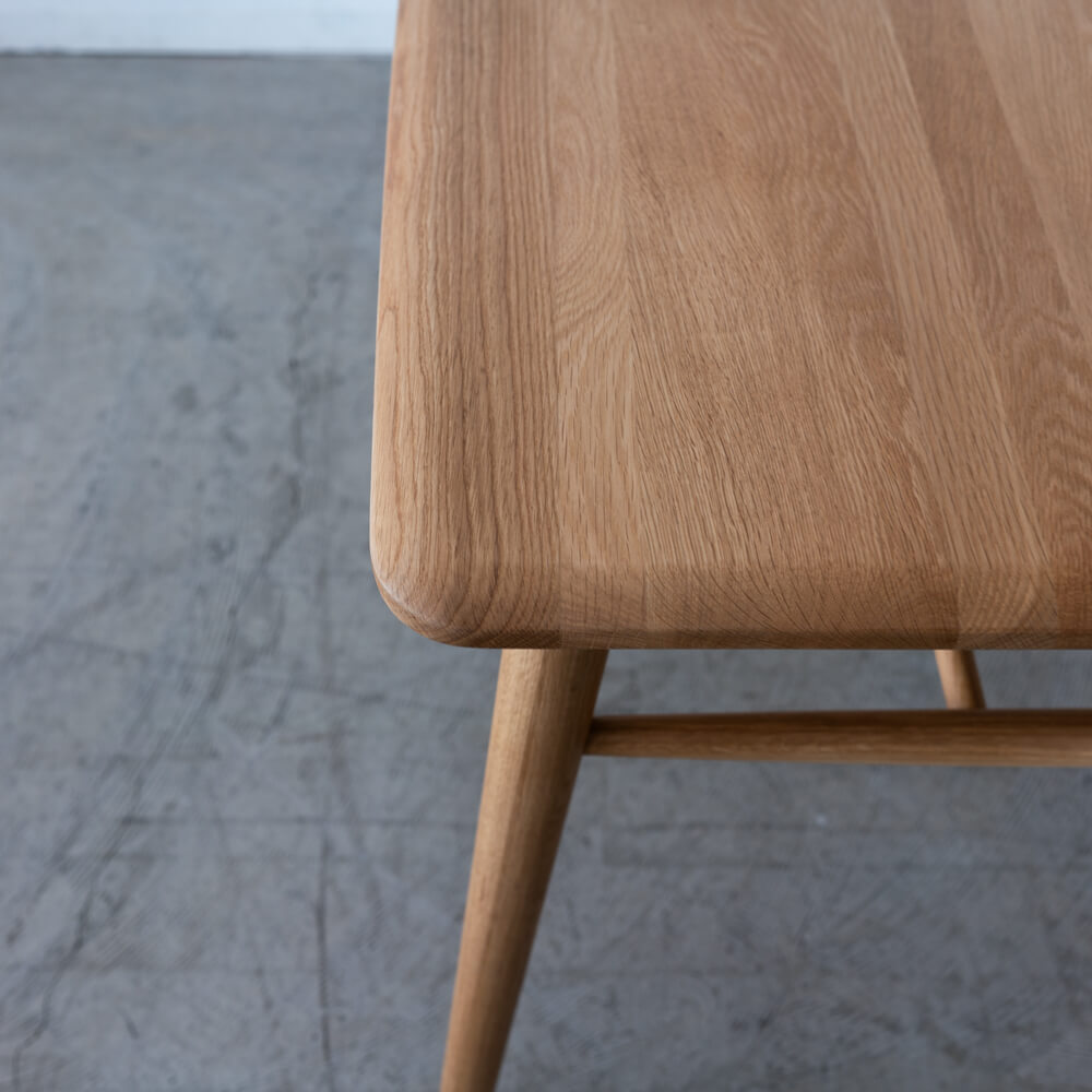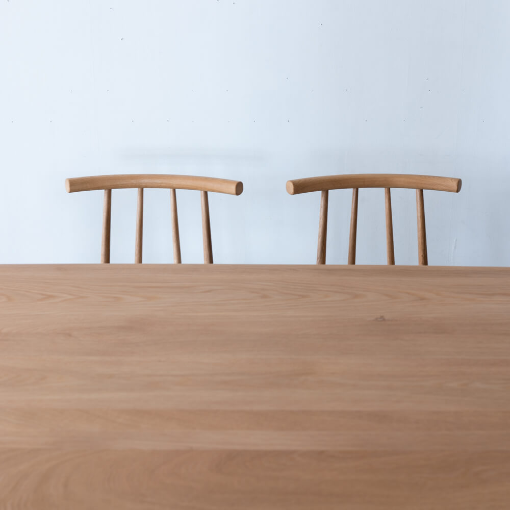 テーブルの角やチェアの背もたれにはやわらかな丸みを持たせ、安全性とやさしい印象を両立。シンプルながらも手仕事を感じさせるディテールが、毎日の食卓を特別な時間にしてくれます。
