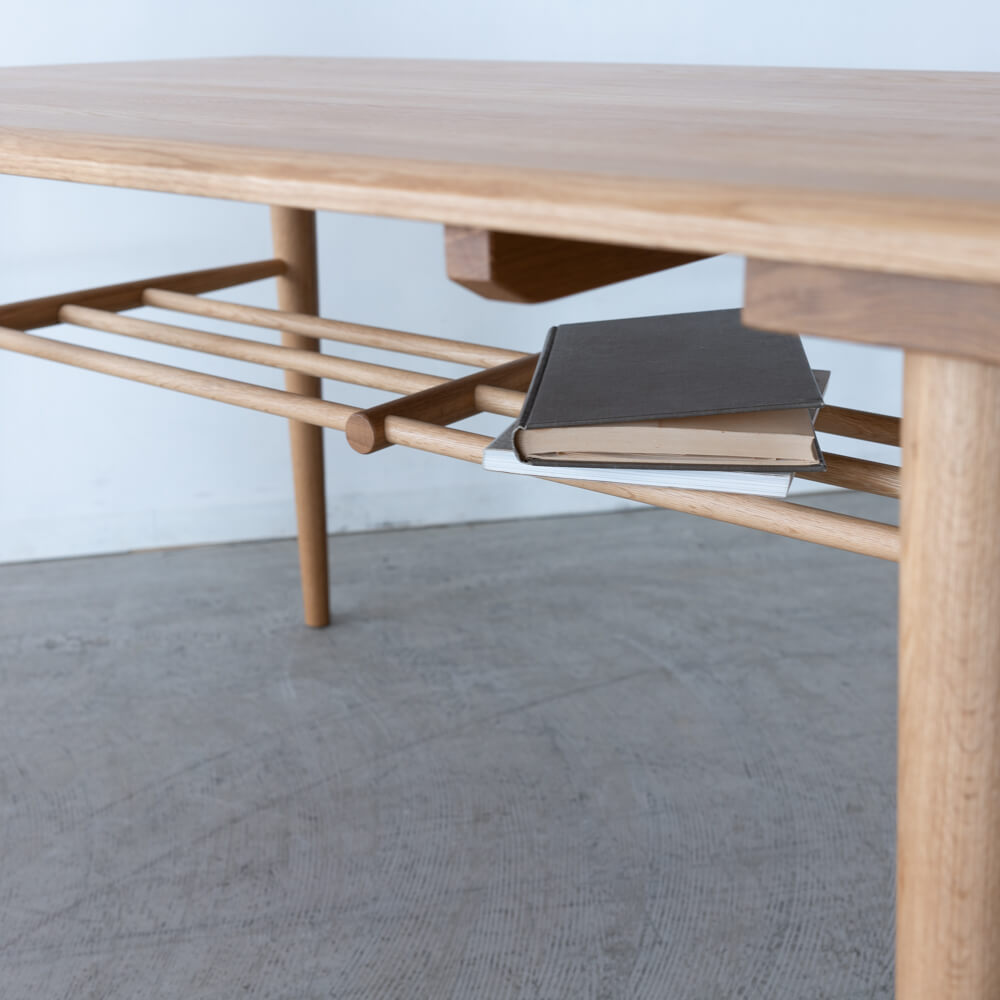 テーブルとチェアの下には、雑誌やカバンなどを置ける便利な格子棚を設置。食事の際にテーブル上をすっきり保つことができ、日常使いに嬉しい工夫が凝らされています。
